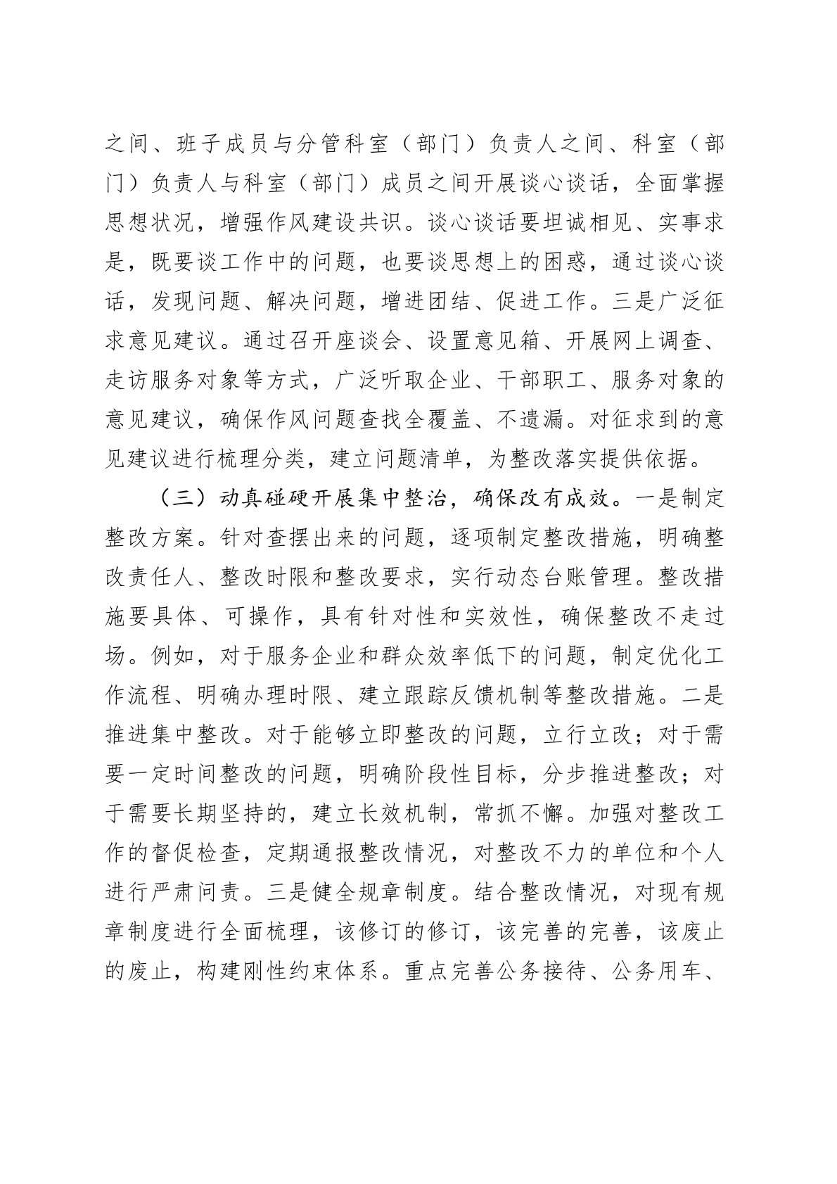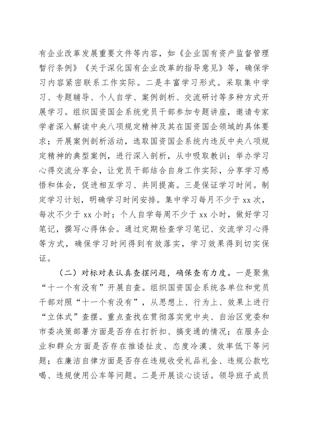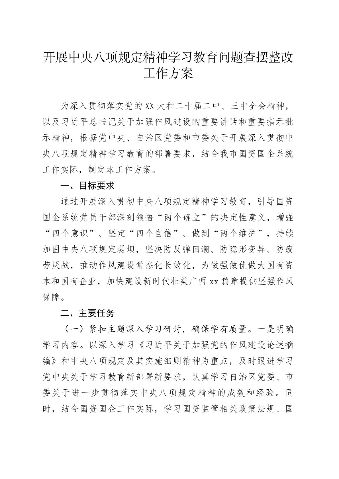 开展中央八项规定精神学习教育问题查摆整改工作方案为深入贯彻落实党的XX大和二十届二中、三中全会精神,以及习近平总书记关于加强作风建设的重要讲话和重要指示批示精神,根据党中央、自治区党委和市委关于开展深入贯彻中央八项规定精神学习教育的部署要求,结合我市国资国企系统工作实际,制定本工作方案。一、目标要求通过开展深入贯彻中央八项规定精神学习教育,引导国资国企系统党员干部深刻领悟“两个确立”的决定性意义,增强“四个意识”、坚定“四个自信”、做到“两个维护”,持续加固中央八项规定堤坝,坚决防反弹回潮、防隐形变异、防疲劳厌战,推动作风建设常态化长效化,为做强做优做大国有资本和国有企业,加快建设新时代壮美广西xx篇章提供坚强作风保障。二、主要任务(一)紧扣主题深入学习研讨,确保学有质量。一是明确学习内容。...