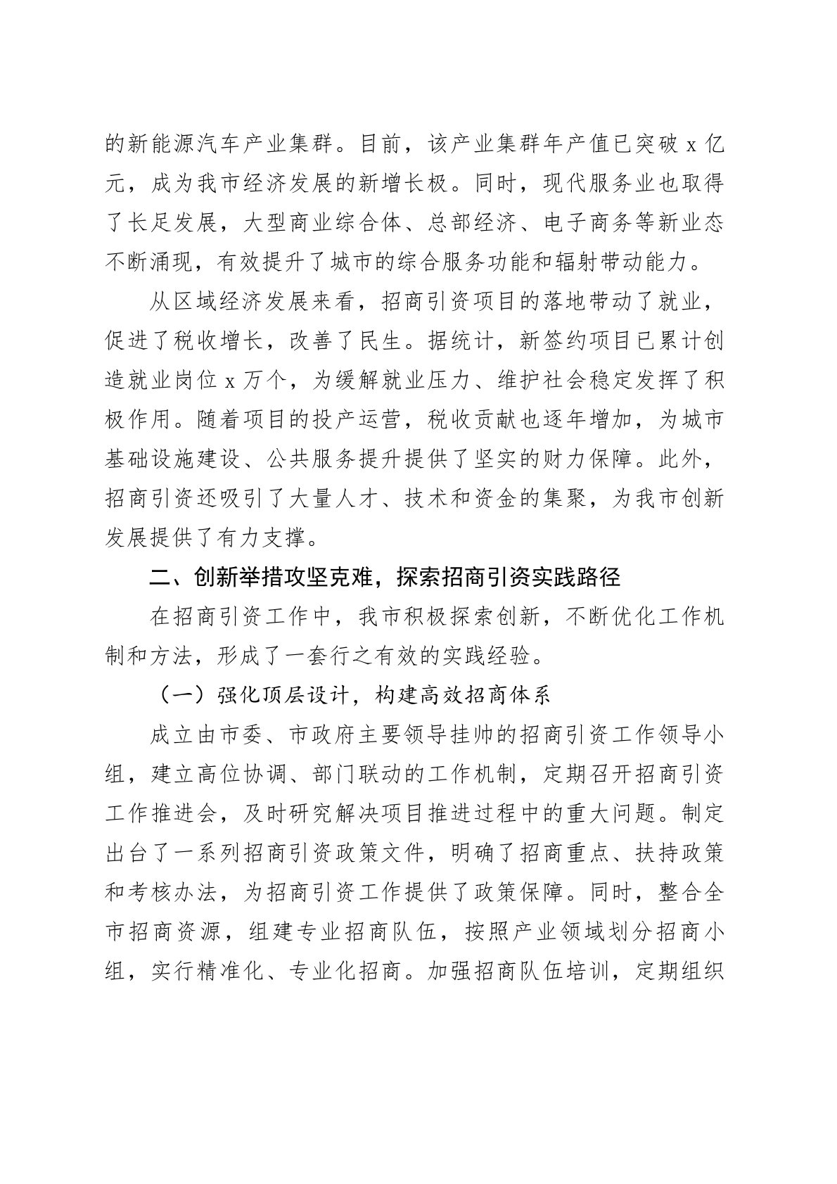 市商务局局长在招商引资工作经验交流会上的讲话尊敬的各位领导、同仁:大家好!非常荣幸能在此次招商引资工作经验交流会上与大家分享我市招商引资工作的相关情况。招商引资作为推动经济高质量发展的“生命线”,对优化产业结构、增强经济发展后劲具有关键作用。近年来,我市积极应对复杂多变的经济形势,以创新思维、务实举措全力推进招商引资工作,取得了一定成效。下面,我将结合实际工作,从工作成效、实践经验、存在问题及未来规划等方面进行汇报交流。一、锚定目标精准发力,招商引资工作成效显著近年来,我市始终把招商引资作为经济工作的重中之重,坚持高位推动、全员参与,招商引资工作呈现出良好发展态势。自启动新一轮招商引资攻坚行动以来,全市累计签约项目x个,总投资达x亿元,其中投资额超x亿元的重大项目x个,涵盖了高端制造业、现代...