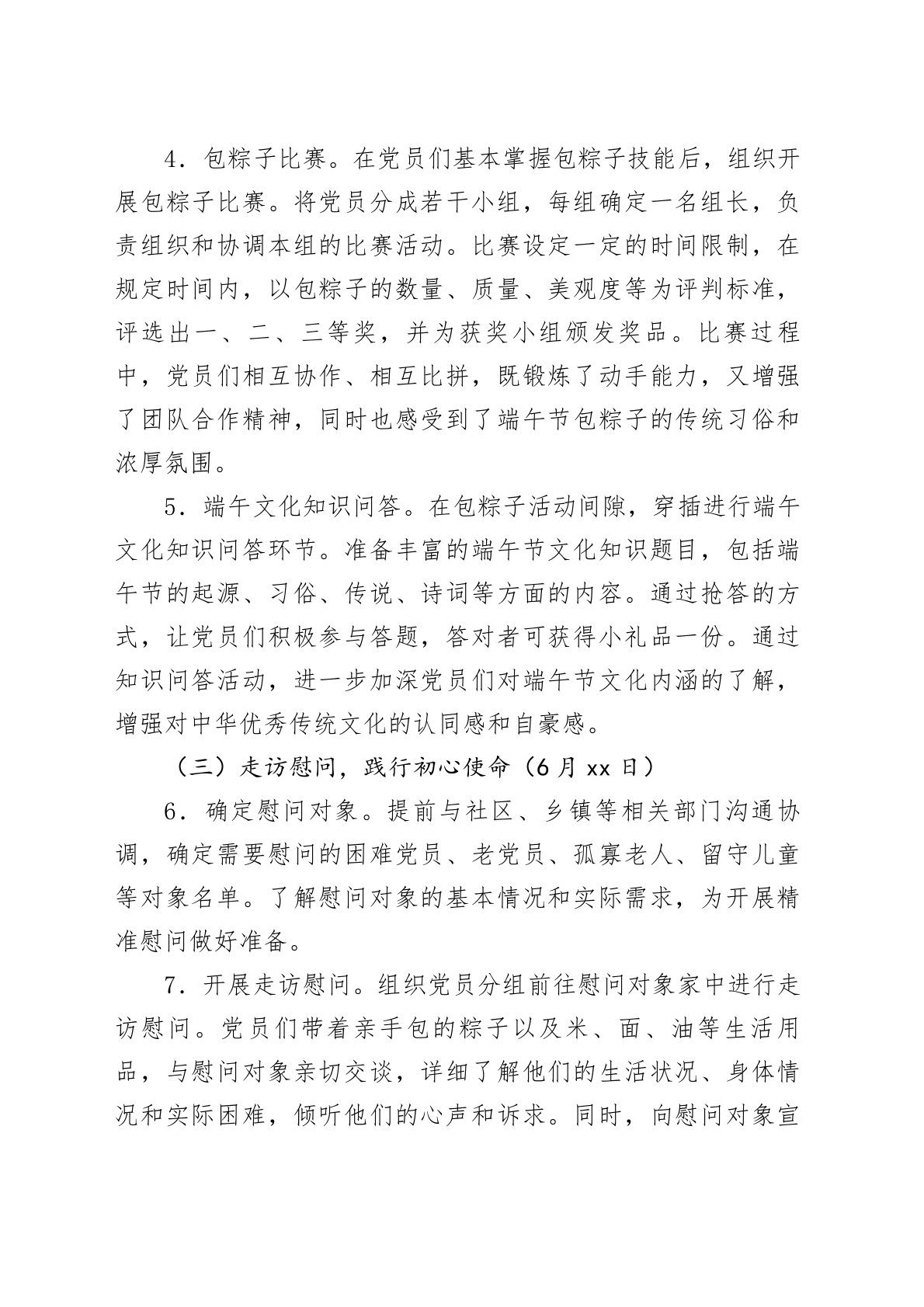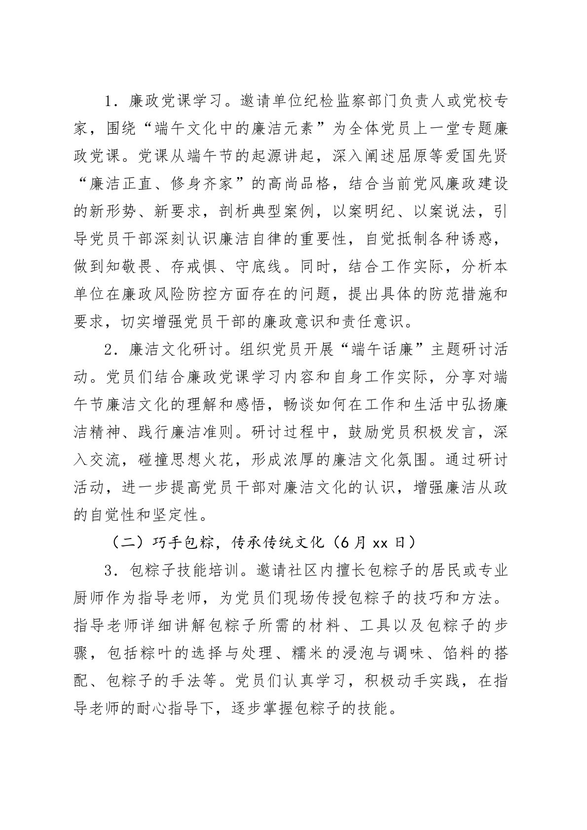 2025年6月主题党日工作方案一、活动背景2025年6月,恰逢传统佳节端午节。端午节承载着中华民族深厚的历史文化底蕴,蕴含着爱国主义精神和廉洁自律思想。为深入学习贯彻习近平新时代中国特色社会主义思想,弘扬中华优秀传统文化,增强党员干部的党性修养和廉洁意识,充分发挥传统节日厚植家国情怀、培育精神家园的重要作用,特制定本主题党日工作方案。通过将端午节的文化内涵与党建工作相结合,开展形式多样、内容丰富的主题党日活动,引导广大党员在传承传统文化中坚定理想信念,在廉洁教育中筑牢思想防线,在志愿服务中践行初心使命,以实际行动为党和人民的事业贡献力量。二、活动主题“粽香传廉韵初心映党辉”三、活动时间2025年6月xx日-6月xx日(活动周期可根据实际情况调整,建议集中在端午节前后一周内开展)四、活动对象全...