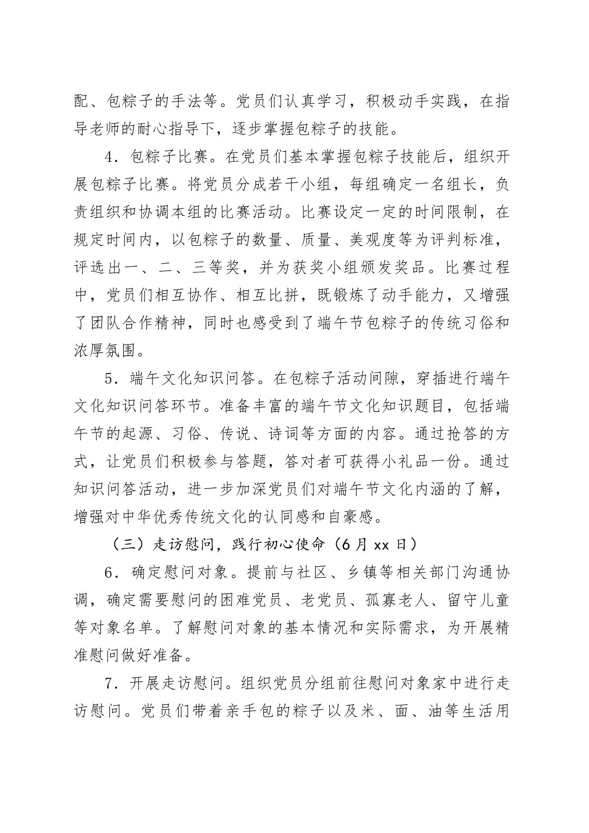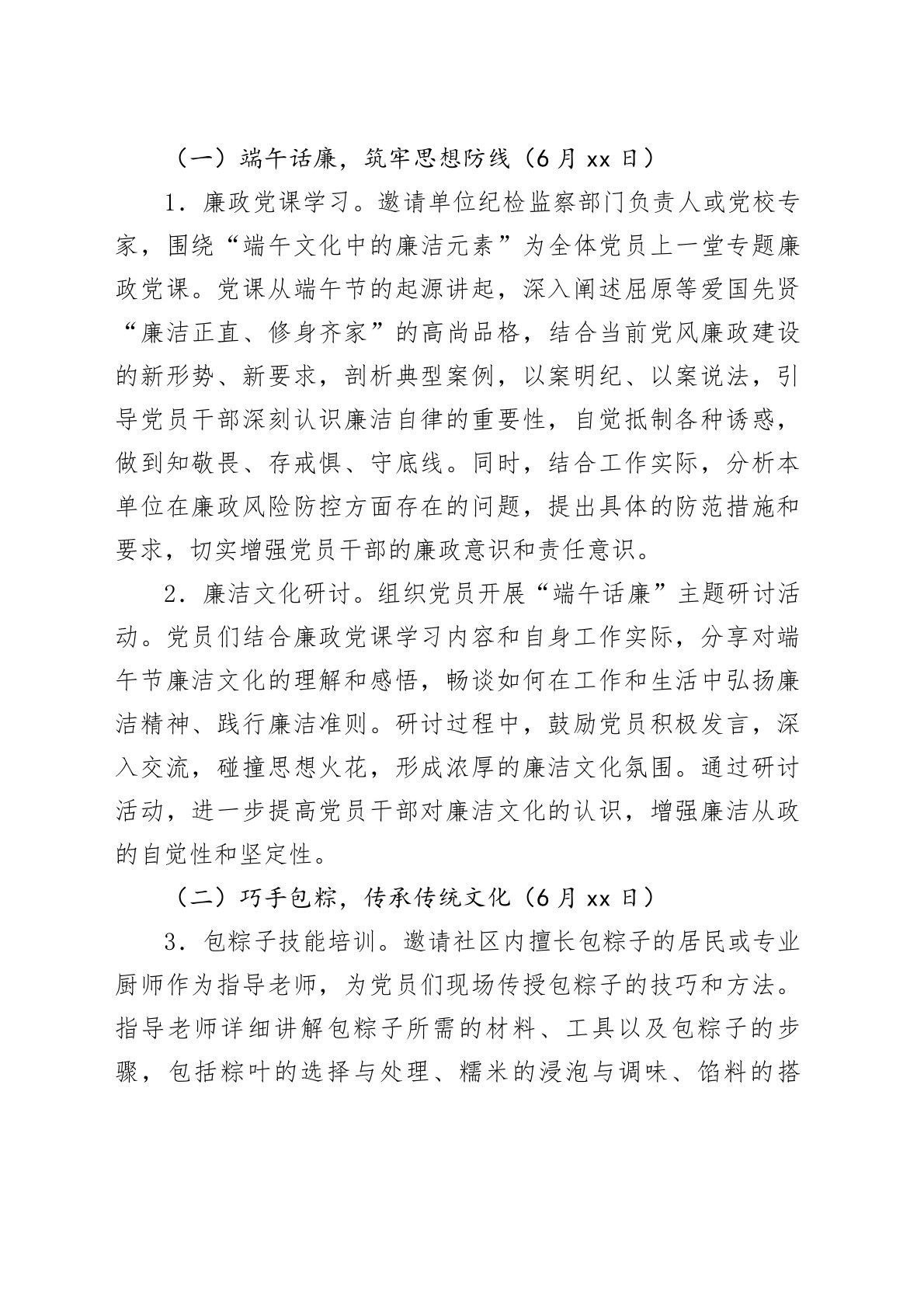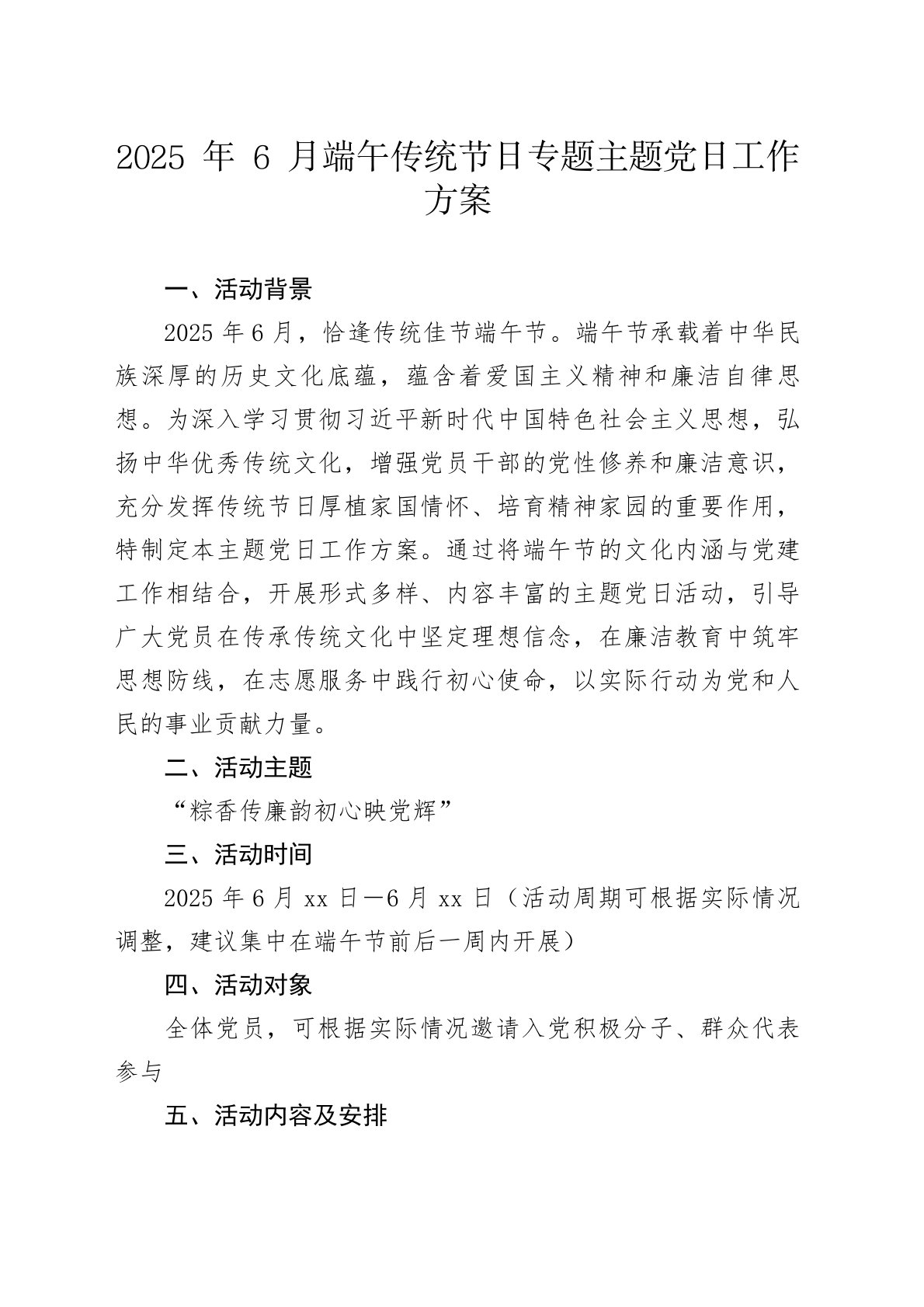 2025年6月端午传统节日专题主题党日工作方案一、活动背景2025年6月,恰逢传统佳节端午节。端午节承载着中华民族深厚的历史文化底蕴,蕴含着爱国主义精神和廉洁自律思想。为深入学习贯彻习近平新时代中国特色社会主义思想,弘扬中华优秀传统文化,增强党员干部的党性修养和廉洁意识,充分发挥传统节日厚植家国情怀、培育精神家园的重要作用,特制定本主题党日工作方案。通过将端午节的文化内涵与党建工作相结合,开展形式多样、内容丰富的主题党日活动,引导广大党员在传承传统文化中坚定理想信念,在廉洁教育中筑牢思想防线,在志愿服务中践行初心使命,以实际行动为党和人民的事业贡献力量。二、活动主题“粽香传廉韵初心映党辉”三、活动时间2025年6月xx日-6月xx日(活动周期可根据实际情况调整,建议集中在端午节前后一周内开展...