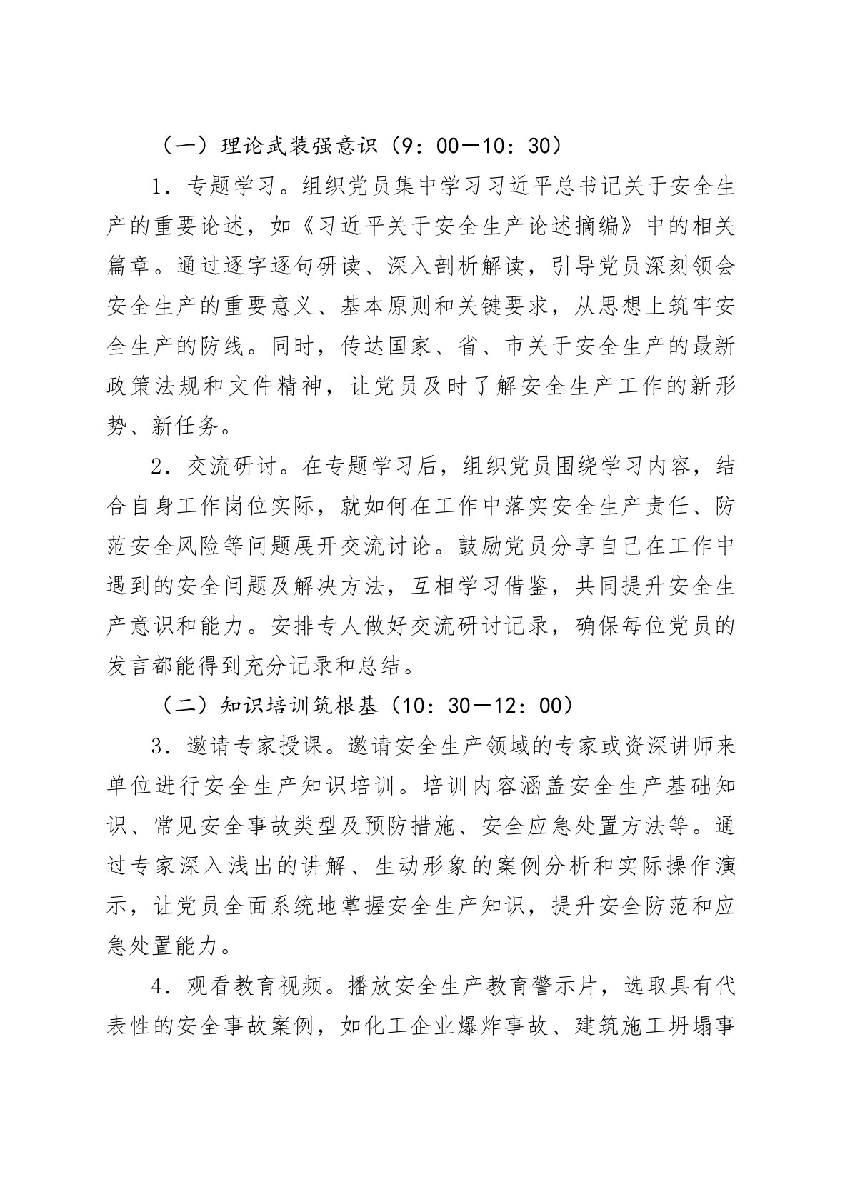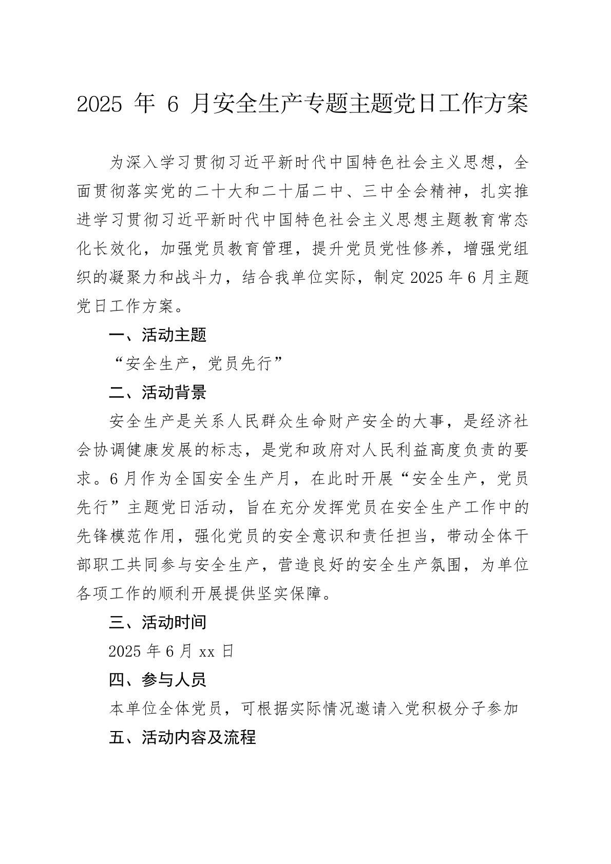 2025年6月安全生产专题主题党日工作方案为深入学习贯彻习近平新时代中国特色社会主义思想,全面贯彻落实党的二十大和二十届二中、三中全会精神,扎实推进学习贯彻习近平新时代中国特色社会主义思想主题教育常态化长效化,加强党员教育管理,提升党员党性修养,增强党组织的凝聚力和战斗力,结合我单位实际,制定2025年6月主题党日工作方案。一、活动主题“安全生产,党员先行”二、活动背景安全生产是关系人民群众生命财产安全的大事,是经济社会协调健康发展的标志,是党和政府对人民利益高度负责的要求。6月作为全国安全生产月,在此时开展“安全生产,党员先行”主题党日活动,旨在充分发挥党员在安全生产工作中的先锋模范作用,强化党员的安全意识和责任担当,带动全体干部职工共同参与安全生产,营造良好的安全生产氛围,为单位各项工作...
