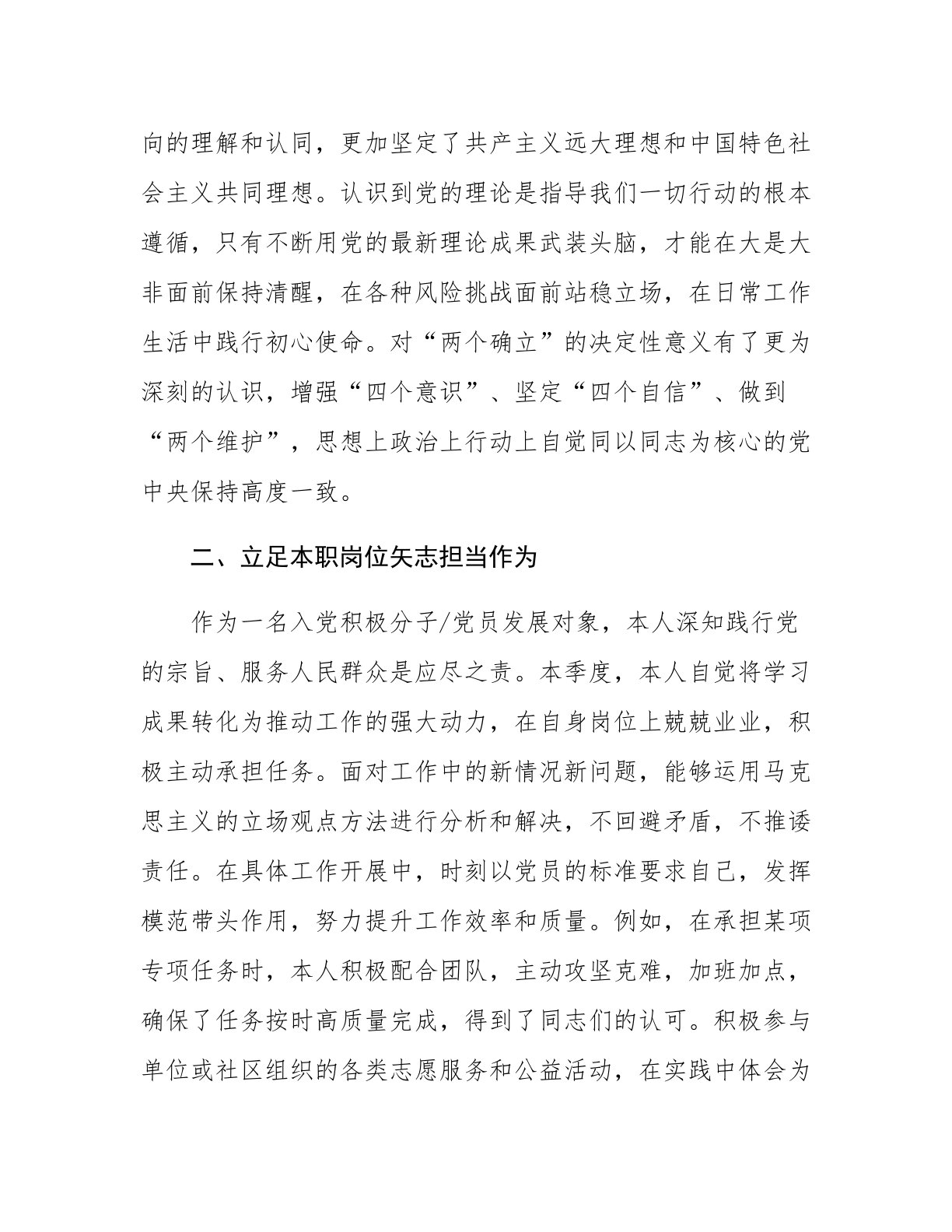 入党积极分子、党员发展对象2025年第二季度思想汇报敬爱的党组织:本季度,本人在党组织的教育培养下,认真学习党的创新理论,积极参与组织生活和各项工作任务,思想上有了新的认识,行动上更加自觉,特向党组织汇报本季度(2025年第二季度)的思想情况、学习体会和工作实践。一、坚持理论武装筑牢思想根基第二季度,本人始终将理论学习摆在突出位置,深知理论上的清醒是政治上坚定的前提。通过自主学习、参加支部学习会等多种形式,深入研读了新时代中国特色社会主义思想的最新篇章,特别是关于高质量发展、全面深化改革、加快发展新质生产力等重大战略部署的论述。系统学习了《中国共产党纪律处分条例》,深刻领悟了党规党纪的严肃性和重要性。学习过程中,注重融会贯通,将理论与实际工作、个人成长紧密结合,努力做到学深悟透、真信笃行。通...