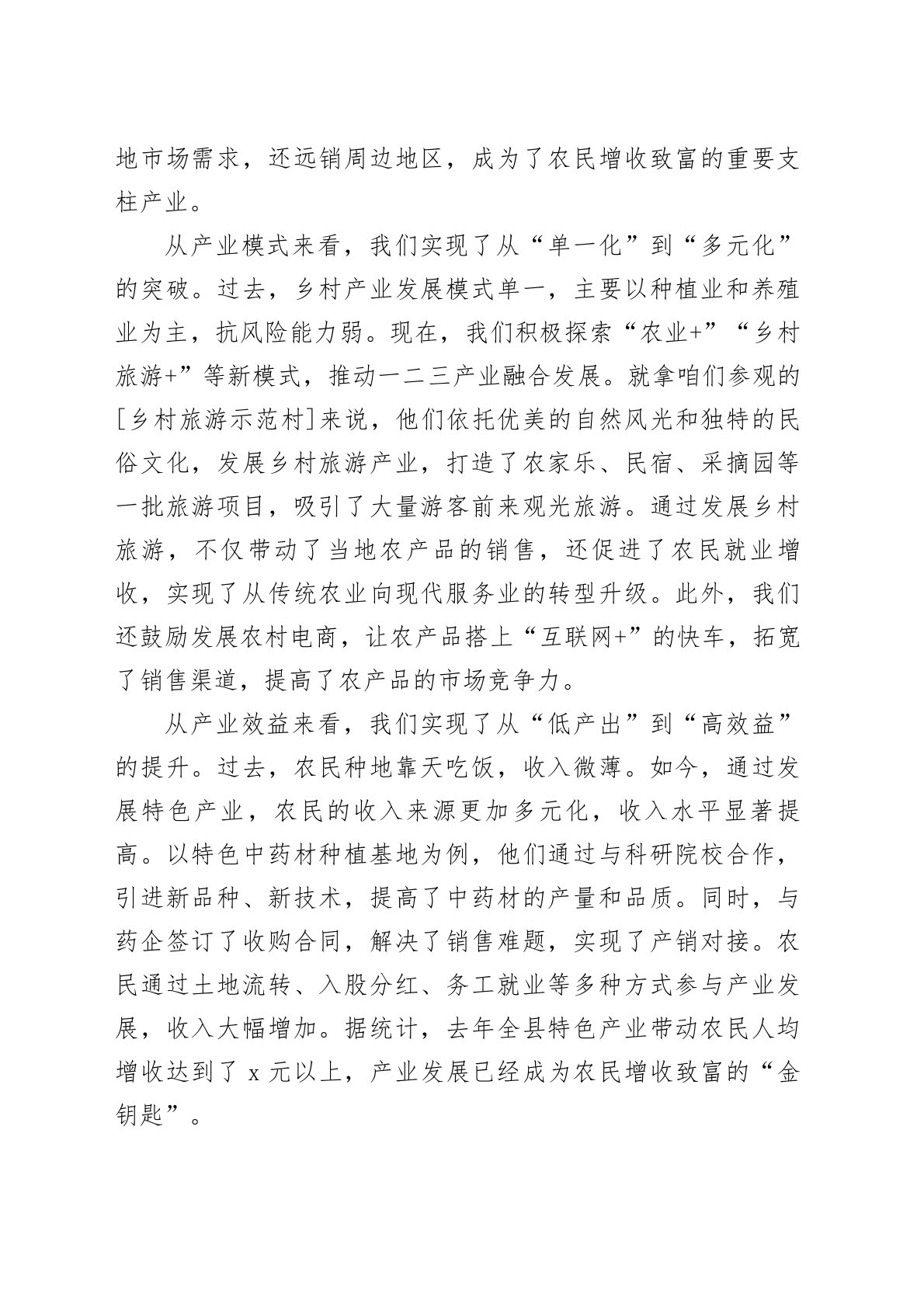 在全县乡村振兴产业发展现场观摩会上的讲话各位同志:大家好!今天,我们齐聚一堂,开展全县乡村振兴产业发展现场观摩活动。一路走来,我们实地走访了多个乡镇的特色产业项目,看到了热火朝天的生产场景,感受到了乡村产业蓬勃发展的活力。这次观摩,既是对过去一段时间全县乡村振兴产业发展成果的一次集中检验,也是为大家搭建一个相互学习、相互交流、相互借鉴的平台。在此,我结合此次观摩情况和当前工作实际,讲几点意见。一、肯定成绩,坚定产业发展的信心决心近年来,全县上下紧紧围绕乡村振兴战略总要求,把产业发展作为乡村振兴的重中之重,立足资源禀赋,积极探索创新,产业发展取得了显著成效。从产业规模来看,我们实现了从“小散弱”到“大而强”的转变。过去,我们的乡村产业大多以传统农业为主,规模小、布局散、效益低。通过这几年的努力...