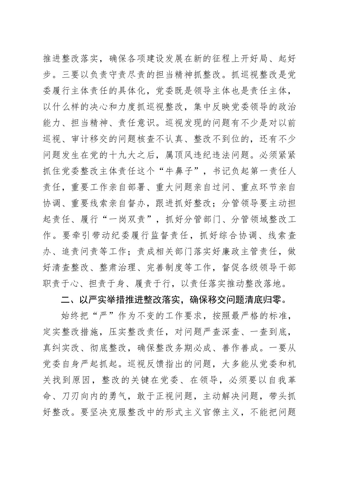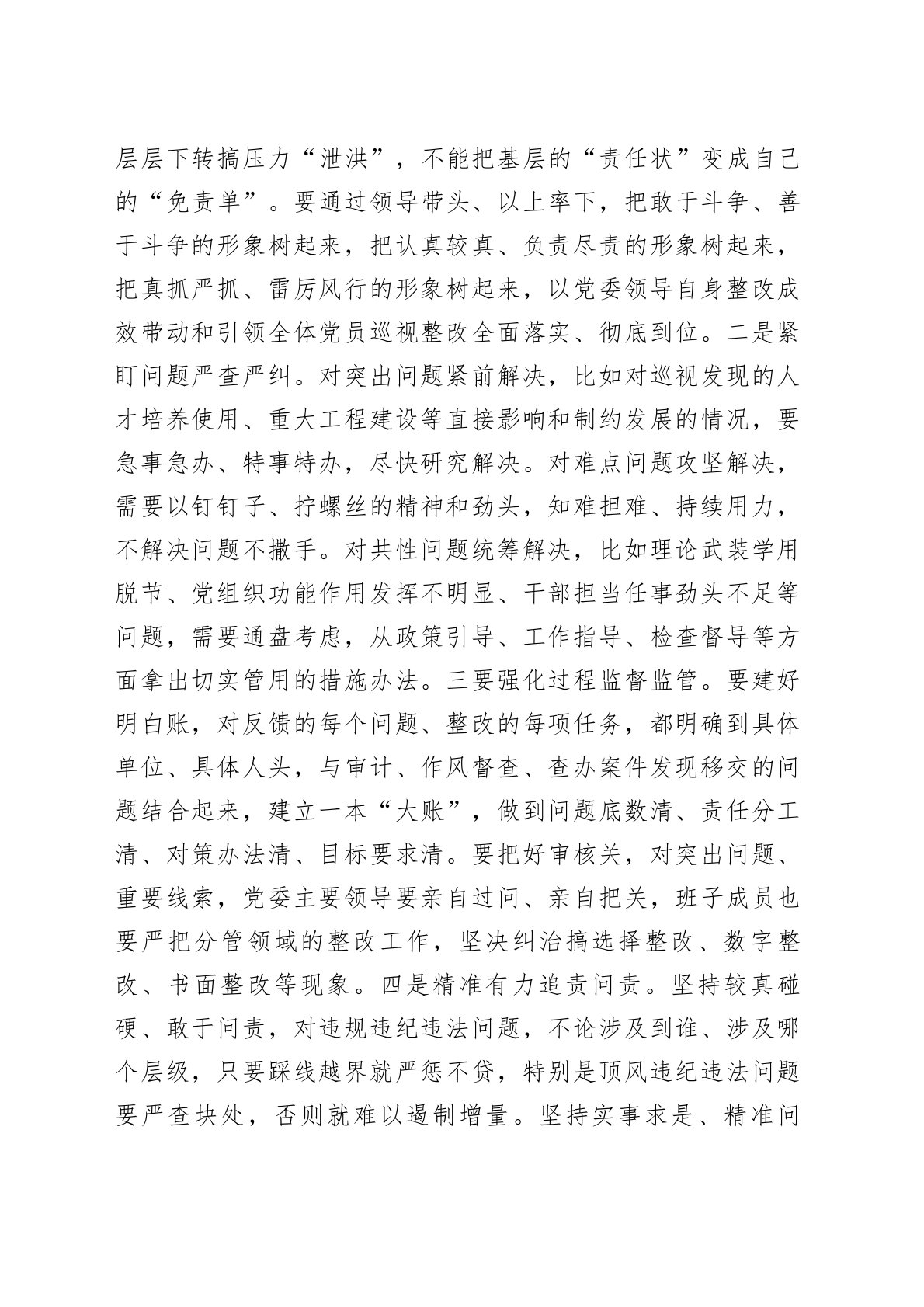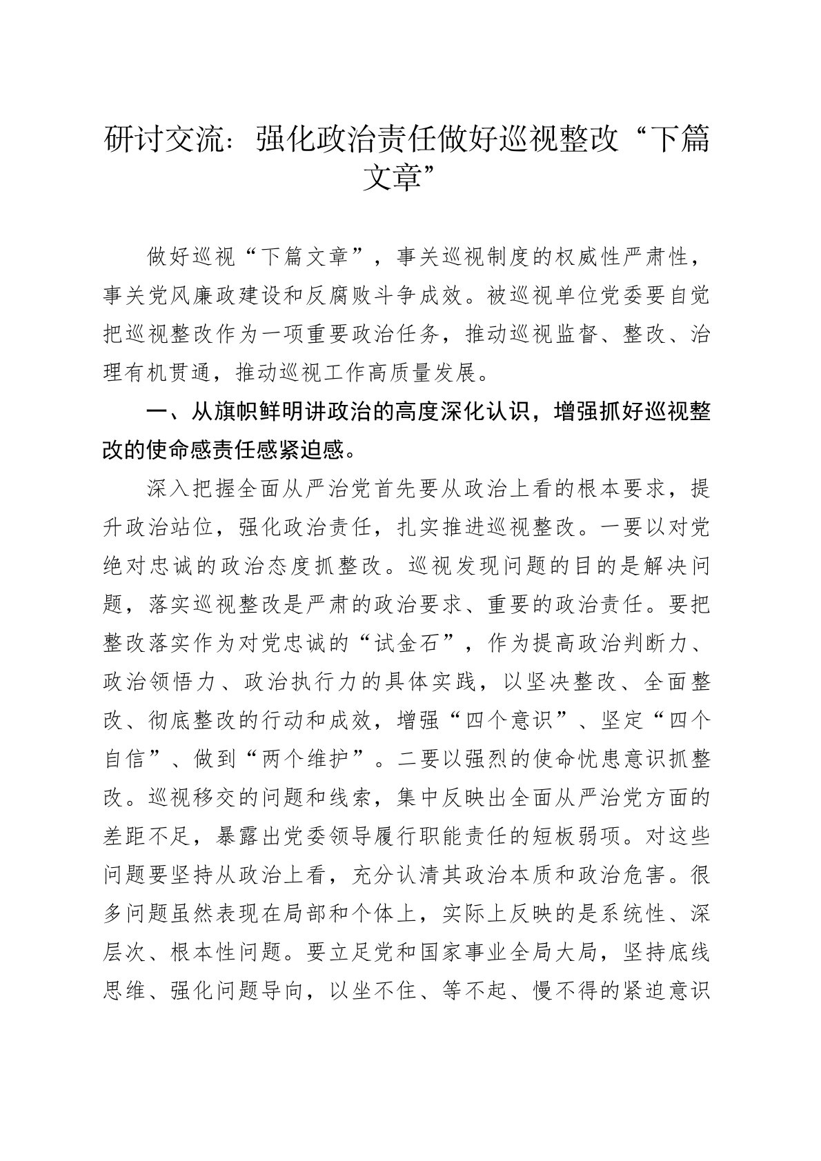 研讨交流:强化政治责任做好巡视整改“下篇文章”做好巡视“下篇文章”,事关巡视制度的权威性严肃性,事关党风廉政建设和反腐败斗争成效。被巡视单位党委要自觉把巡视整改作为一项重要政治任务,推动巡视监督、整改、治理有机贯通,推动巡视工作高质量发展。一、从旗帜鲜明讲政治的高度深化认识,增强抓好巡视整改的使命感责任感紧迫感。深入把握全面从严治党首先要从政治上看的根本要求,提升政治站位,强化政治责任,扎实推进巡视整改。一要以对党绝对忠诚的政治态度抓整改。巡视发现问题的目的是解决问题,落实巡视整改是严肃的政治要求、重要的政治责任。要把整改落实作为对党忠诚的“试金石”,作为提高政治判断力、政治领悟力、政治执行力的具体实践,以坚决整改、全面整改、彻底整改的行动和成效,增强“四个意识”、坚定“四个自信”、做到“两...
