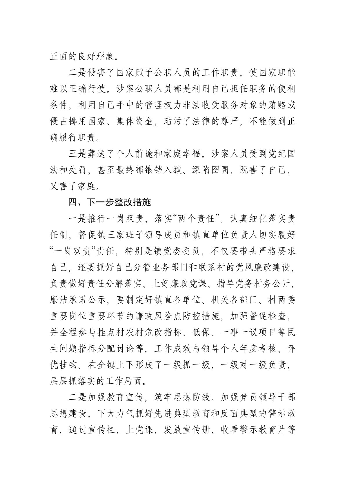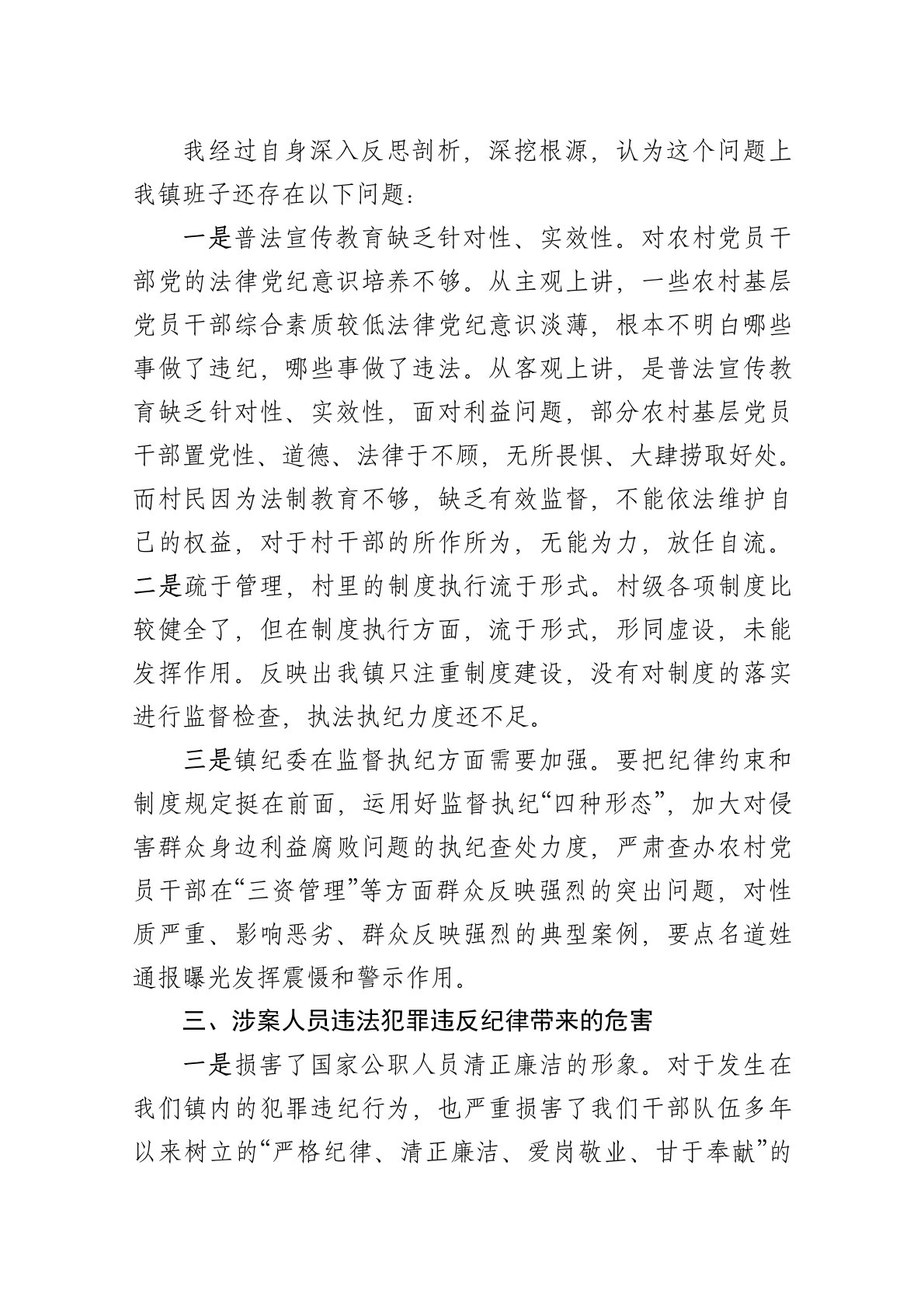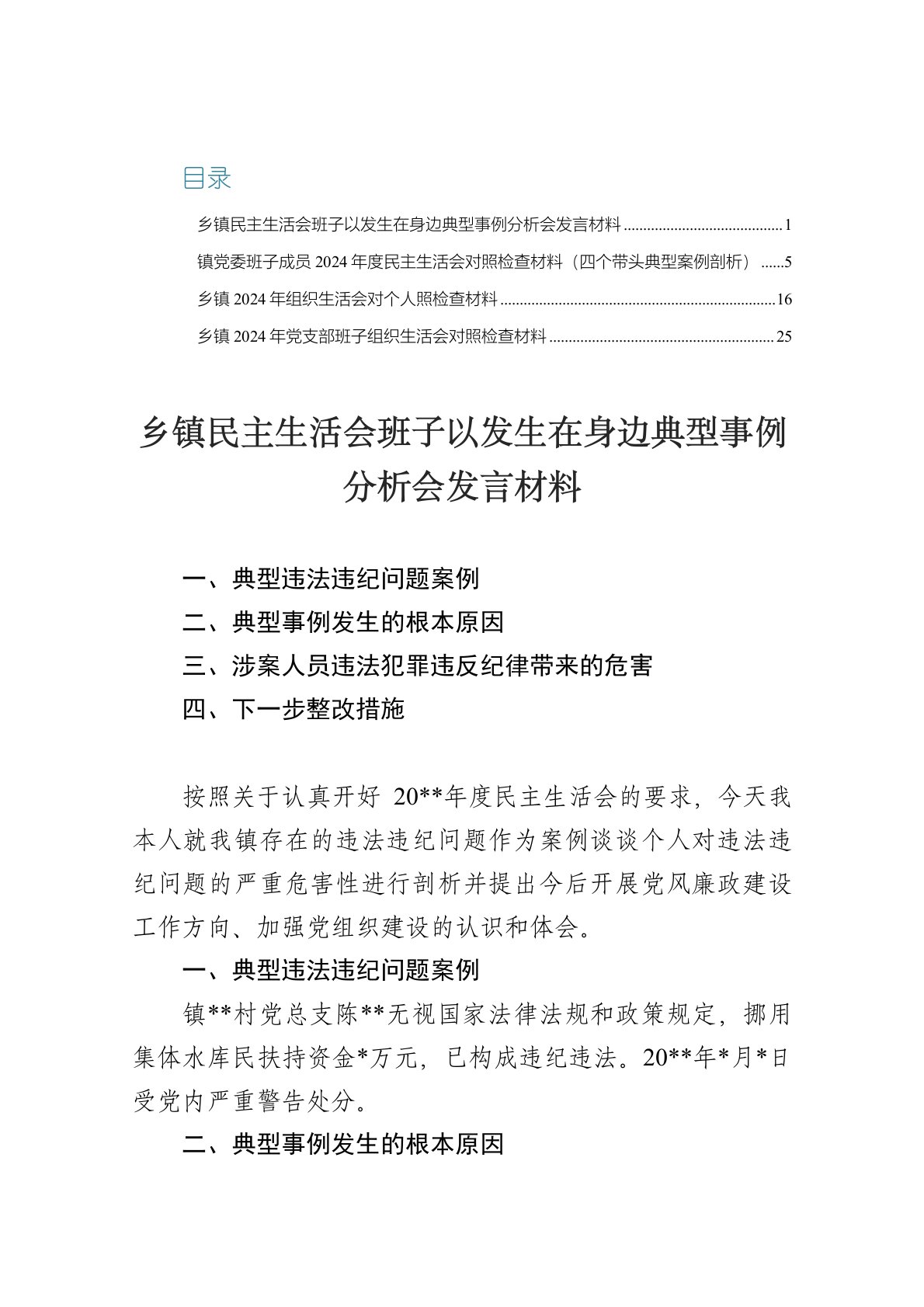 目录乡镇民主生活会班子以发生在身边典型事例分析会发言材料一、典型违法违纪问题案例二、典型事例发生的根本原因三、涉案人员违法犯罪违反纪律带来的危害四、下一步整改措施按照关于认真开好20**年度民主生活会的要求,今天我本人就我镇存在的违法违纪问题作为案例谈谈个人对违法违纪问题的严重危害性进行剖析并提出今后开展党风廉政建设工作方向、加强党组织建设的认识和体会。一、典型违法违纪问题案例镇**村党总支陈**无视国家法律法规和政策规定,挪用集体水库民扶持资金*万元,已构成违纪违法。20**年*月*日受党内严重警告处分。二、典型事例发生的根本原因我经过自身深入反思剖析,深挖根源,认为这个问题上我镇班子还存在以下问题:一是普法宣传教育缺乏针对性、实效性。对农村党员干部党的法律党纪意识培养不够。从主观上讲,一...
