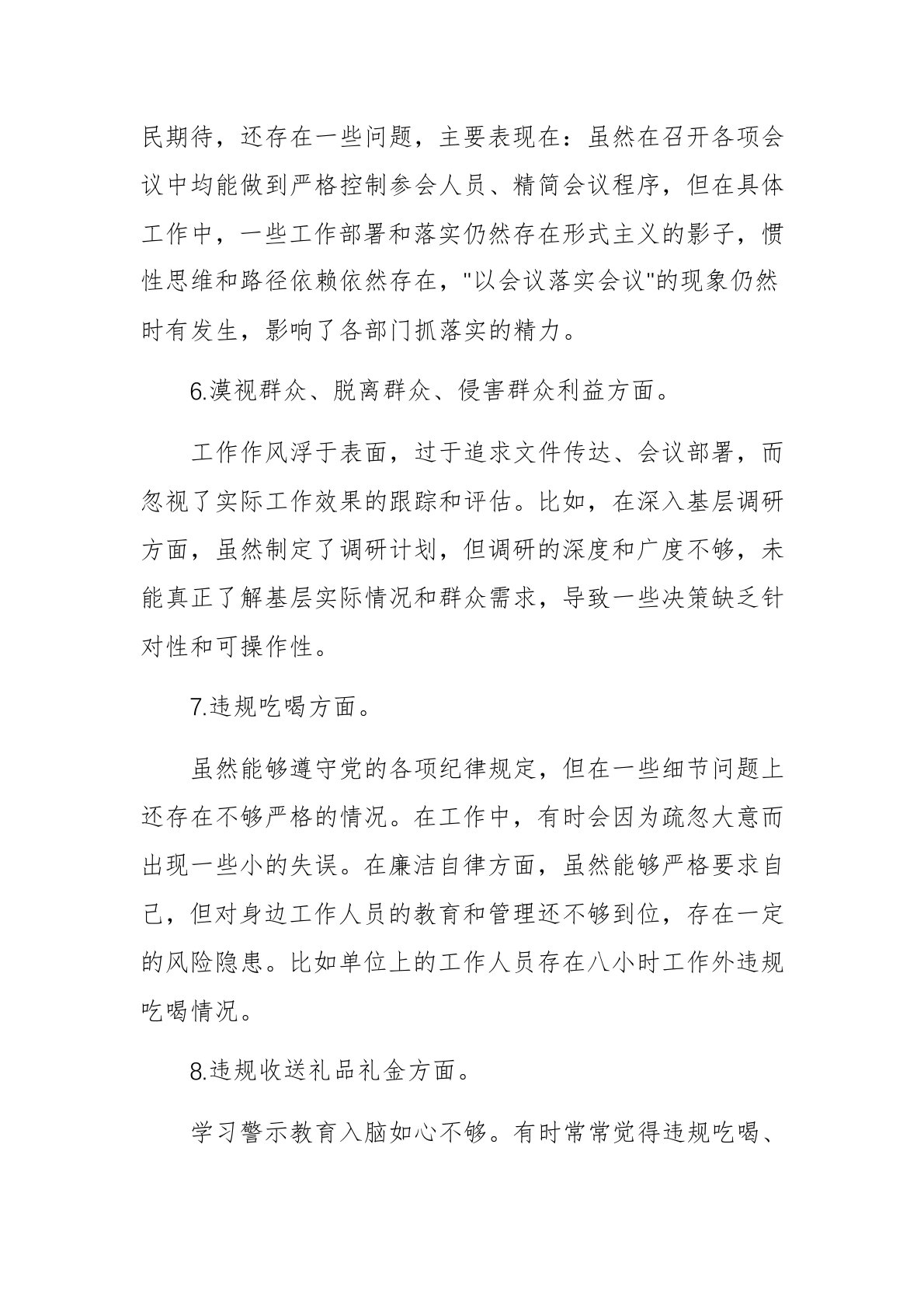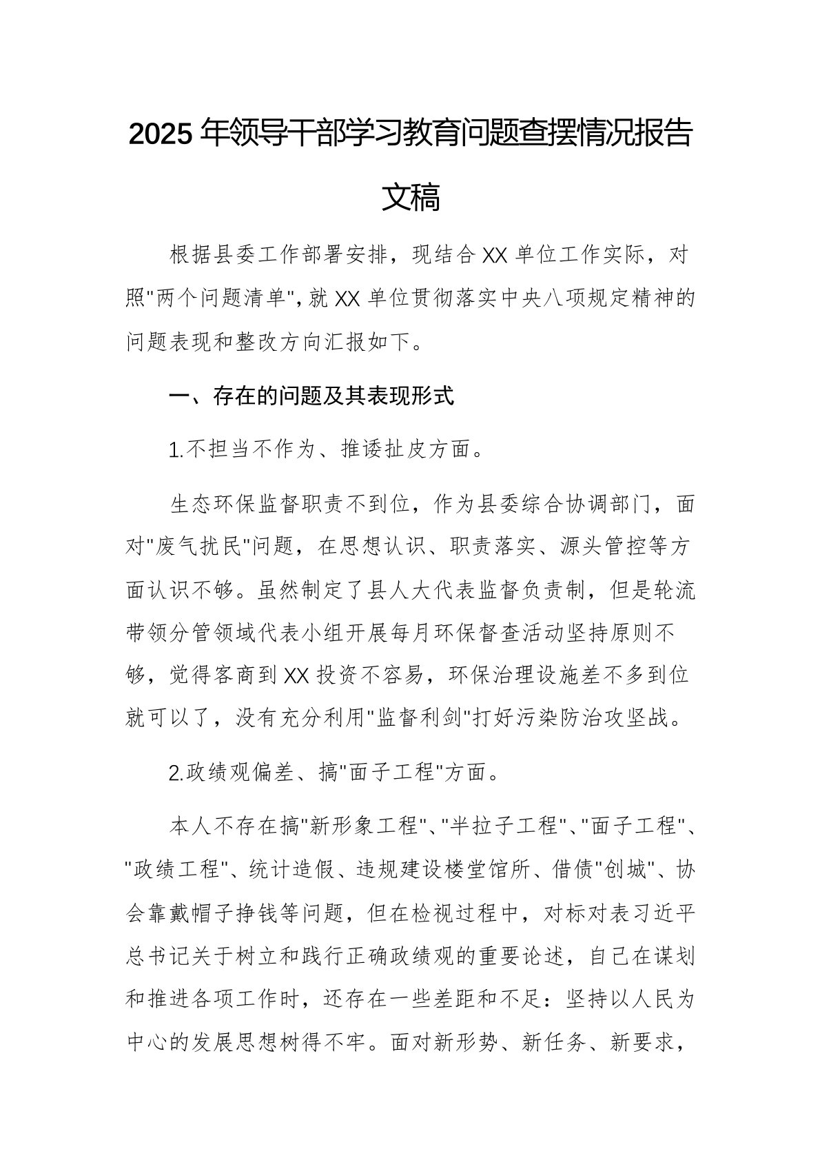 2025年领导干部学习教育问题查摆情况报告文稿根据县委工作部署安排,现结合XX单位工作实际,对照"两个问题清单",就XX单位贯彻落实中央八项规定精神的问题表现和整改方向汇报如下。一、存在的问题及其表现形式1.不担当不作为、推诿扯皮方面。生态环保监督职责不到位,作为县委综合协调部门,面对"废气扰民"问题,在思想认识、职责落实、源头管控等方面认识不够。虽然制定了县人大代表监督负责制,但是轮流带领分管领域代表小组开展每月环保督查活动坚持原则不够,觉得客商到XX投资不容易,环保治理设施差不多到位就可以了,没有充分利用"监督利剑"打好污染防治攻坚战。2.政绩观偏差、搞"面子工程"方面。本人不存在搞"新形象工程"、"半拉子工程"、"面子工程"、"政绩工程"、统计造假、违规建设楼堂馆所、借债"创城"、协会...