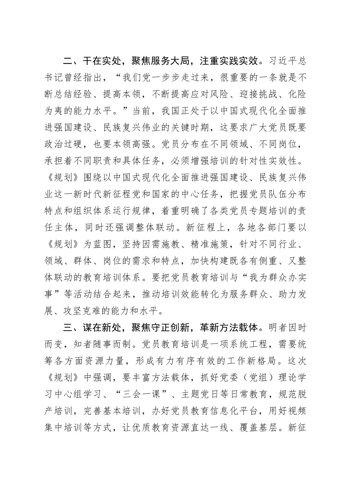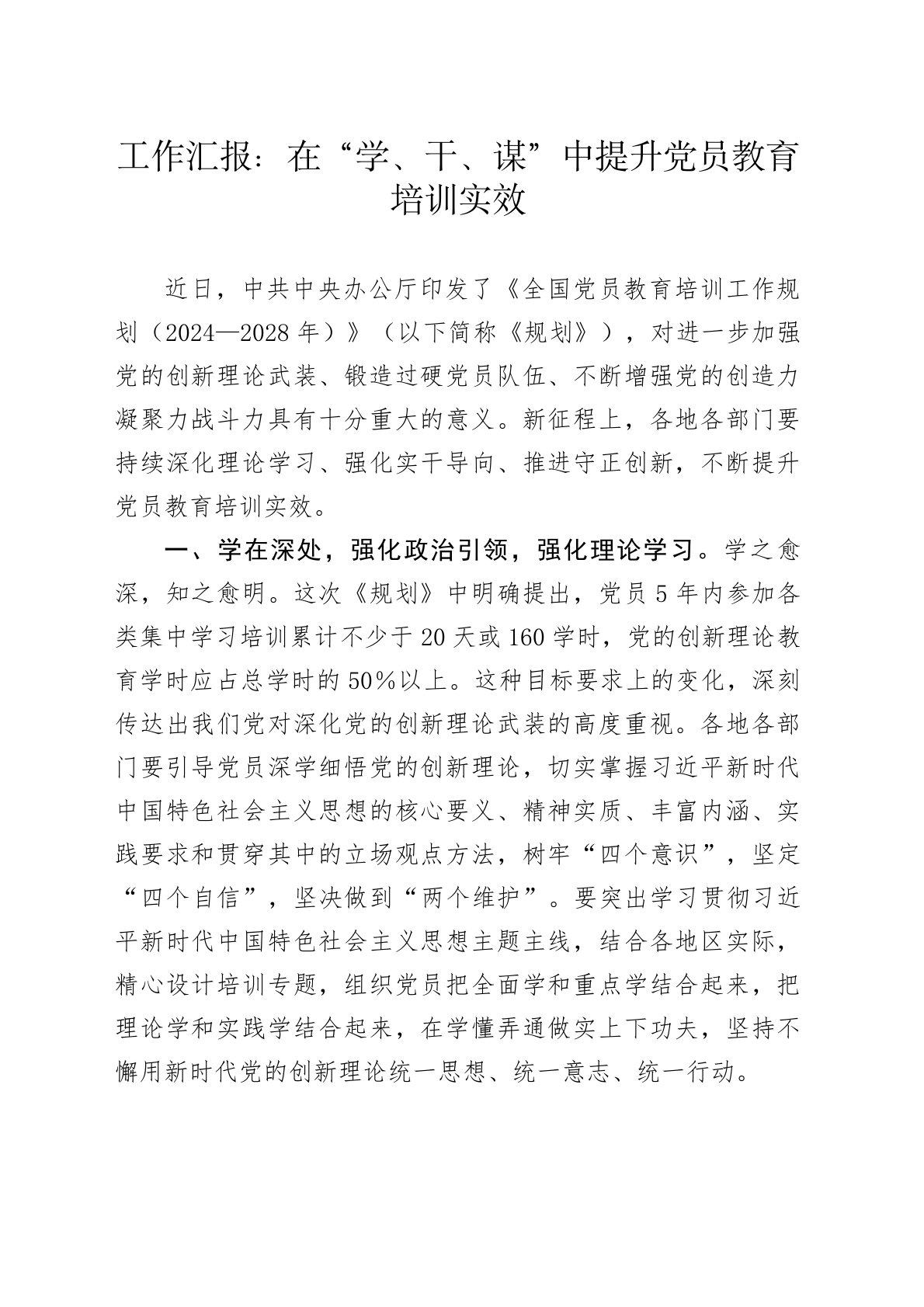 工作汇报:在“学、干、谋”中提升党员教育培训实效近日,中共中央办公厅印发了《全国党员教育培训工作规划(2024—2028年)》(以下简称《规划》),对进一步加强党的创新理论武装、锻造过硬党员队伍、不断增强党的创造力凝聚力战斗力具有十分重大的意义。新征程上,各地各部门要持续深化理论学习、强化实干导向、推进守正创新,不断提升党员教育培训实效。一、学在深处,强化政治引领,强化理论学习。学之愈深,知之愈明。这次《规划》中明确提出,党员5年内参加各类集中学习培训累计不少于20天或160学时,党的创新理论教育学时应占总学时的50%以上。这种目标要求上的变化,深刻传达出我们党对深化党的创新理论武装的高度重视。各地各部门要引导党员深学细悟党的创新理论,切实掌握习近平新时代中国特色社会主义思想的核心要义、精神...
