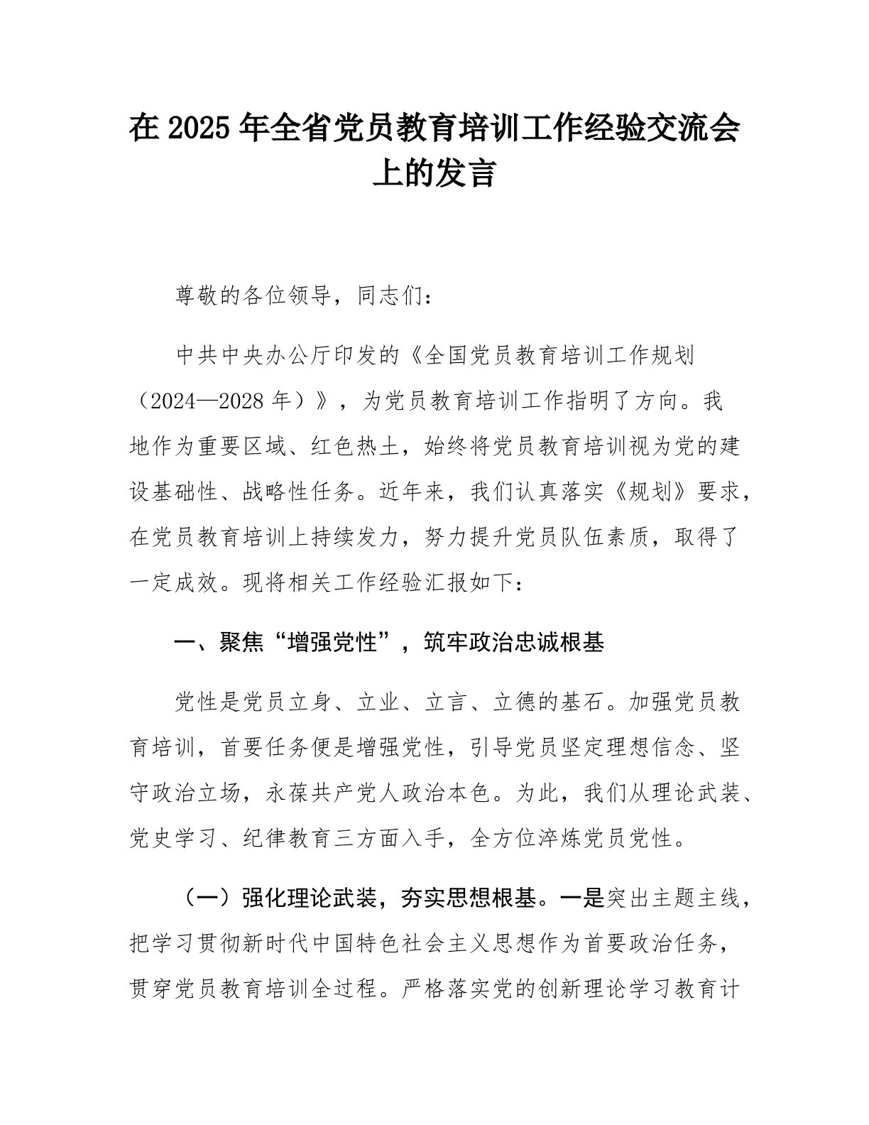在2025年全省党员教育培训工作经验交流会上的发言尊敬的各位领导,同志们:中共中央办公厅印发的《全国党员教育培训工作规划(2024—2028年)》,为党员教育培训工作指明了方向。我地作为重要区域、红色热土,始终将党员教育培训视为党的建设基础性、战略性任务。近年来,我们认真落实《规划》要求,在党员教育培训上持续发力,努力提升党员队伍素质,取得了一定成效。现将相关工作经验汇报如下:一、聚焦“增强党性”,筑牢政治忠诚根基党性是党员立身、立业、立言、立德的基石。加强党员教育培训,首要任务便是增强党性,引导党员坚定理想信念、坚守政治立场,永葆共产党人政治本色。为此,我们从理论武装、党史学习、纪律教育三方面入手,全方位淬炼党员党性。(一)强化理论武装,夯实思想根基。一是突出主题主线,把学习贯彻新时代中国...