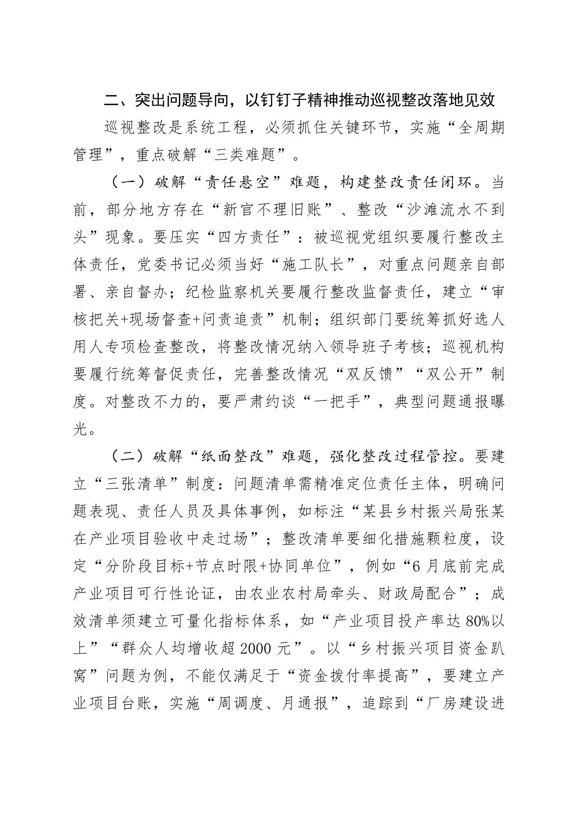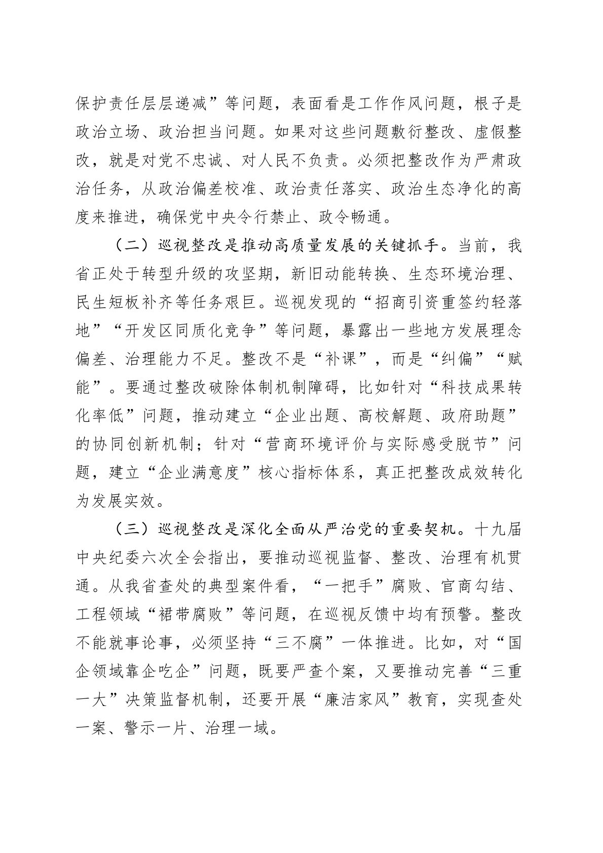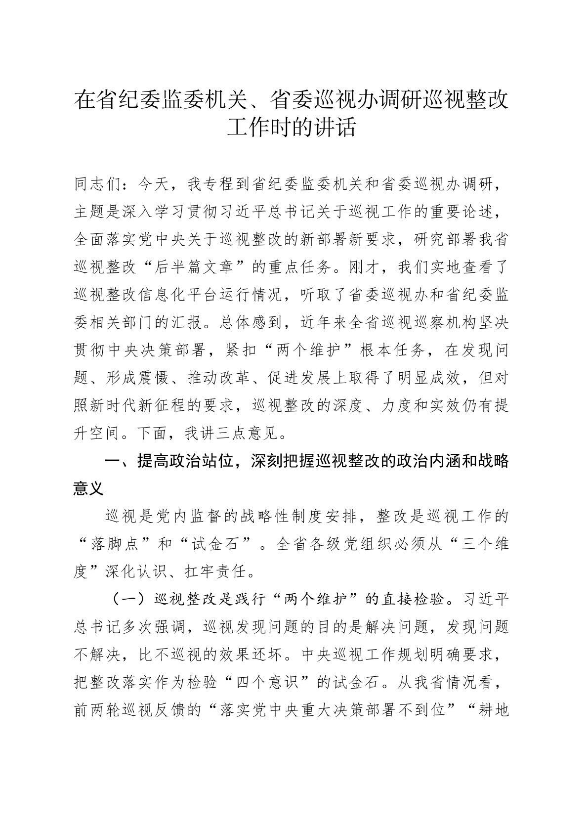 在省纪委监委机关、省委巡视办调研巡视整改工作时的讲话同志们:今天,我专程到省纪委监委机关和省委巡视办调研,主题是深入学习贯彻习近平总书记关于巡视工作的重要论述,全面落实党中央关于巡视整改的新部署新要求,研究部署我省巡视整改“后半篇文章”的重点任务。刚才,我们实地查看了巡视整改信息化平台运行情况,听取了省委巡视办和省纪委监委相关部门的汇报。总体感到,近年来全省巡视巡察机构坚决贯彻中央决策部署,紧扣“两个维护”根本任务,在发现问题、形成震慑、推动改革、促进发展上取得了明显成效,但对照新时代新征程的要求,巡视整改的深度、力度和实效仍有提升空间。下面,我讲三点意见。一、提高政治站位,深刻把握巡视整改的政治内涵和战略意义巡视是党内监督的战略性制度安排,整改是巡视工作的“落脚点”和“试金石”。全省各级党...