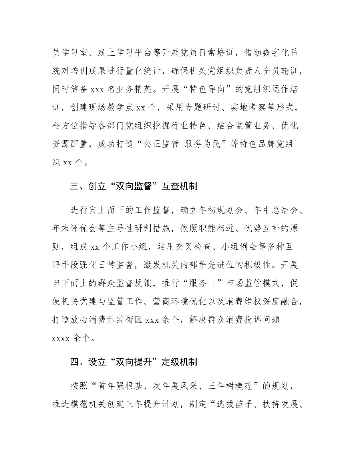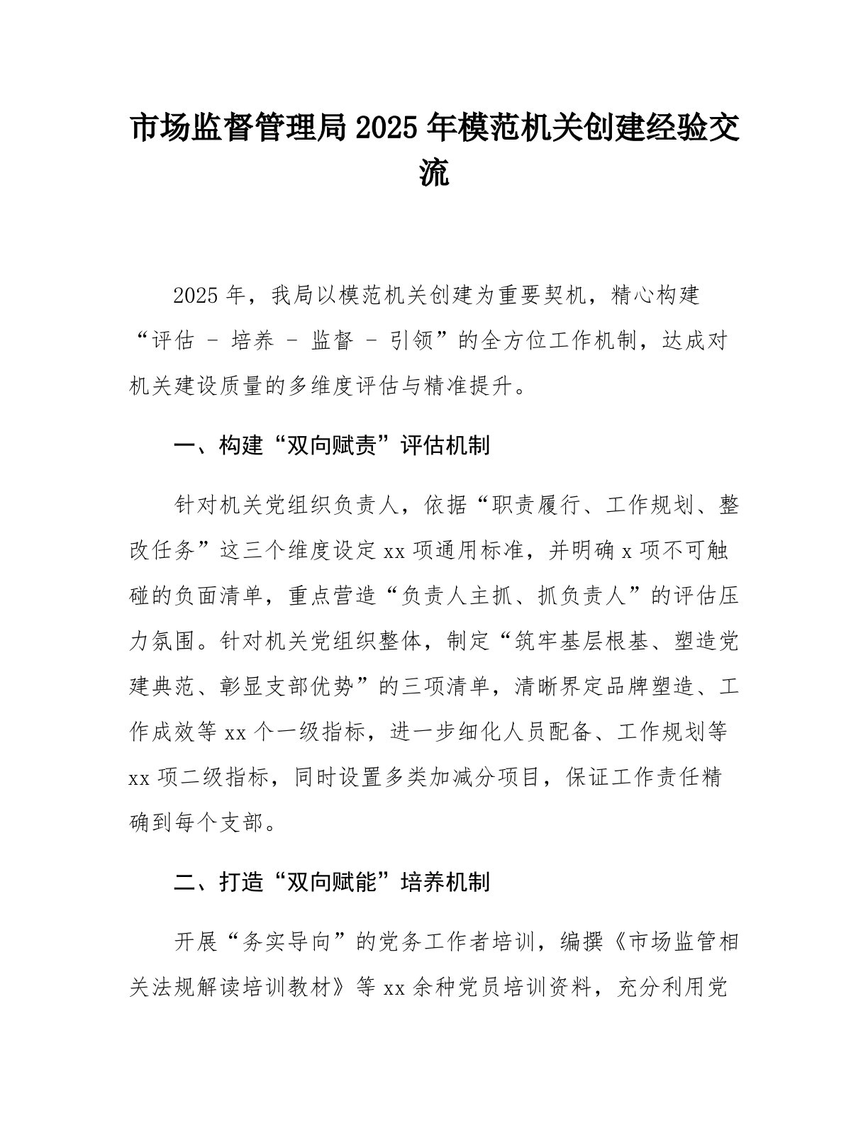 市场监督管理局2025年模范机关创建经验交流2025年,我局以模范机关创建为重要契机,精心构建“评估-培养-监督-引领”的全方位工作机制,达成对机关建设质量的多维度评估与精准提升。一、构建“双向赋责”评估机制针对机关党组织负责人,依据“职责履行、工作规划、整改任务”这三个维度设定xx项通用标准,并明确x项不可触碰的负面清单,重点营造“负责人主抓、抓负责人”的评估压力氛围。针对机关党组织整体,制定“筑牢基层根基、塑造党建典范、彰显支部优势”的三项清单,清晰界定品牌塑造、工作成效等xx个一级指标,进一步细化人员配备、工作规划等xx项二级指标,同时设置多类加减分项目,保证工作责任精确到每个支部。二、打造“双向赋能”培养机制开展“务实导向”的党务工作者培训,编撰《市场监管相关法规解读培训教材》等xx...
