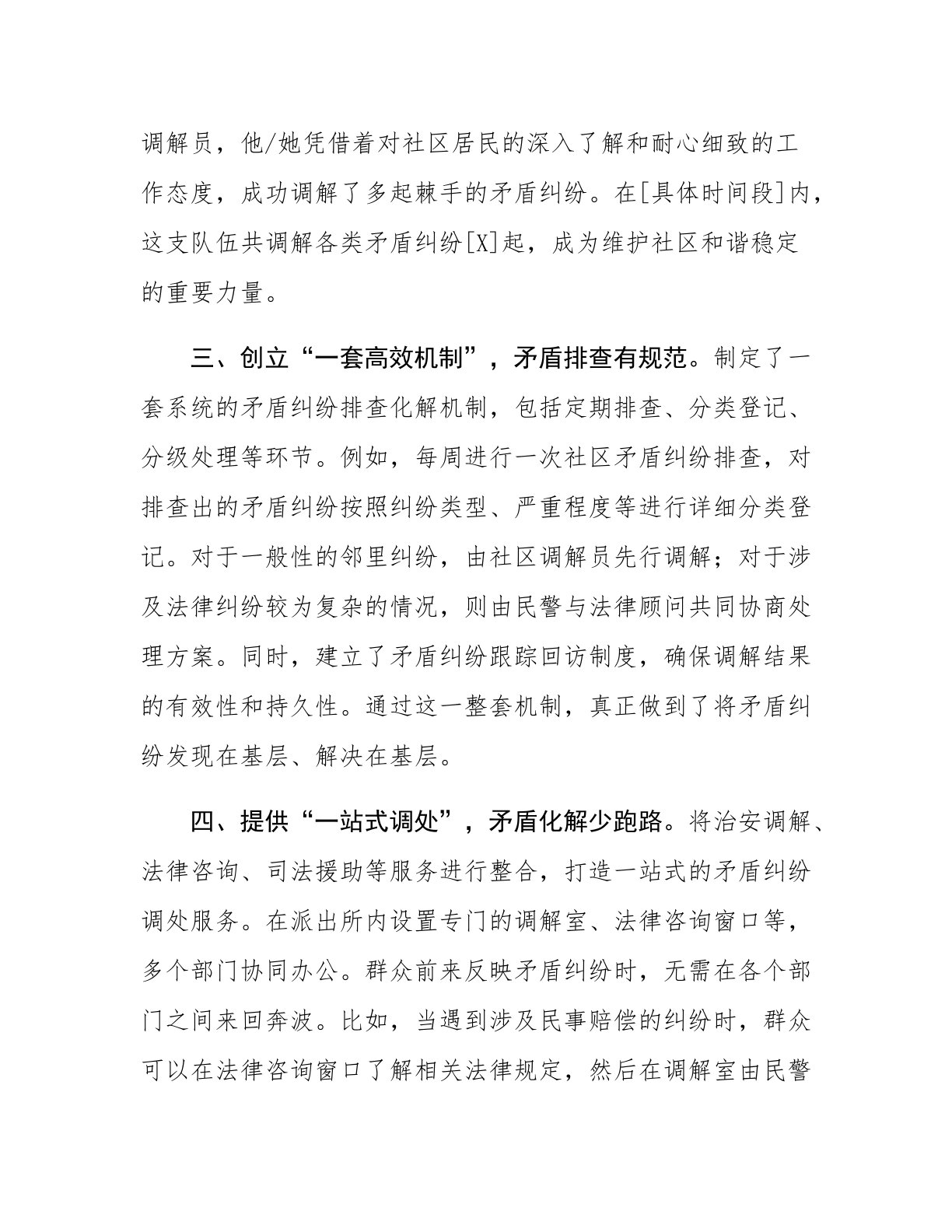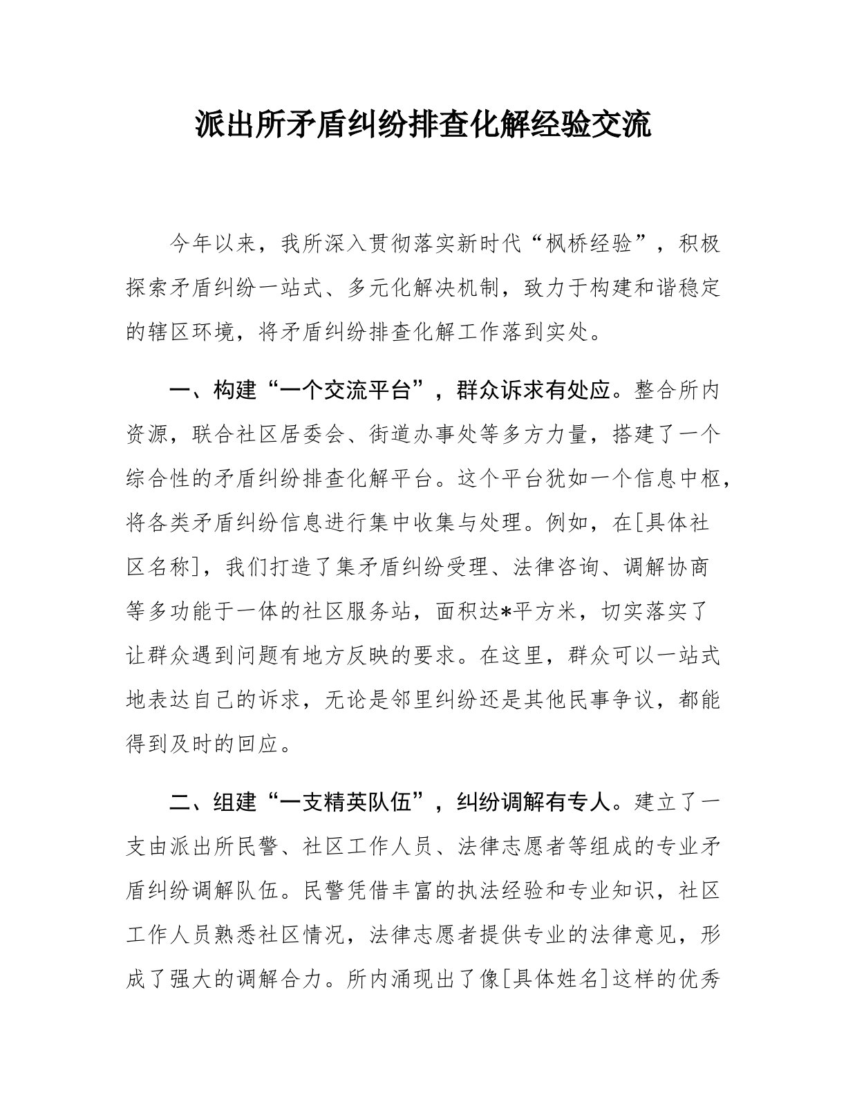 派出所矛盾纠纷排查化解经验交流今年以来,我所深入贯彻落实新时代“枫桥经验”,积极探索矛盾纠纷一站式、多元化解决机制,致力于构建和谐稳定的辖区环境,将矛盾纠纷排查化解工作落到实处。一、构建“一个交流平台”,群众诉求有处应。整合所内资源,联合社区居委会、街道办事处等多方力量,搭建了一个综合性的矛盾纠纷排查化解平台。这个平台犹如一个信息中枢,将各类矛盾纠纷信息进行集中收集与处理。例如,在[具体社区名称],我们打造了集矛盾纠纷受理、法律咨询、调解协商等多功能于一体的社区服务站,面积达*平方米,切实落实了让群众遇到问题有地方反映的要求。在这里,群众可以一站式地表达自己的诉求,无论是邻里纠纷还是其他民事争议,都能得到及时的回应。二、组建“一支精英队伍”,纠纷调解有专人。建立了一支由派出所民警、社区工作人...