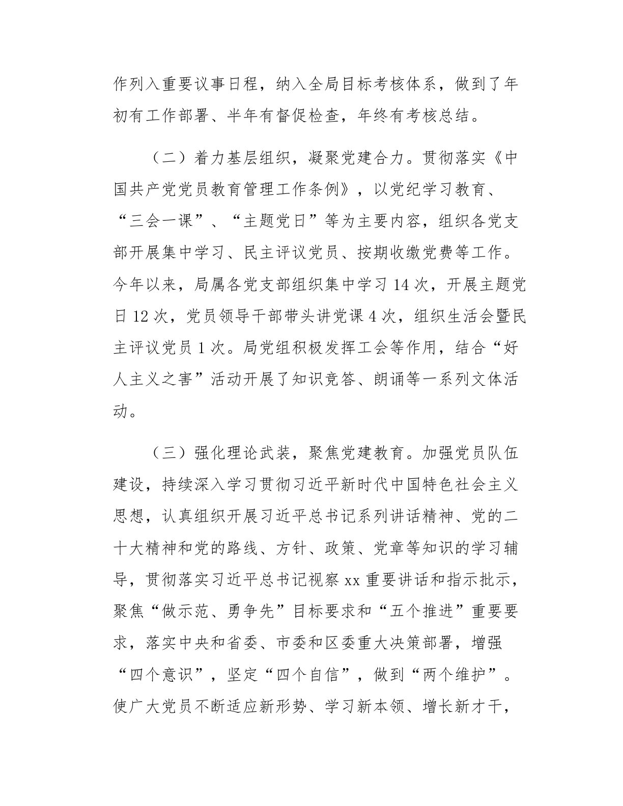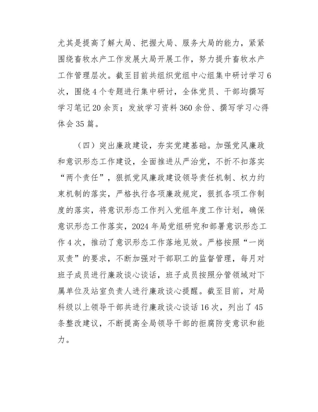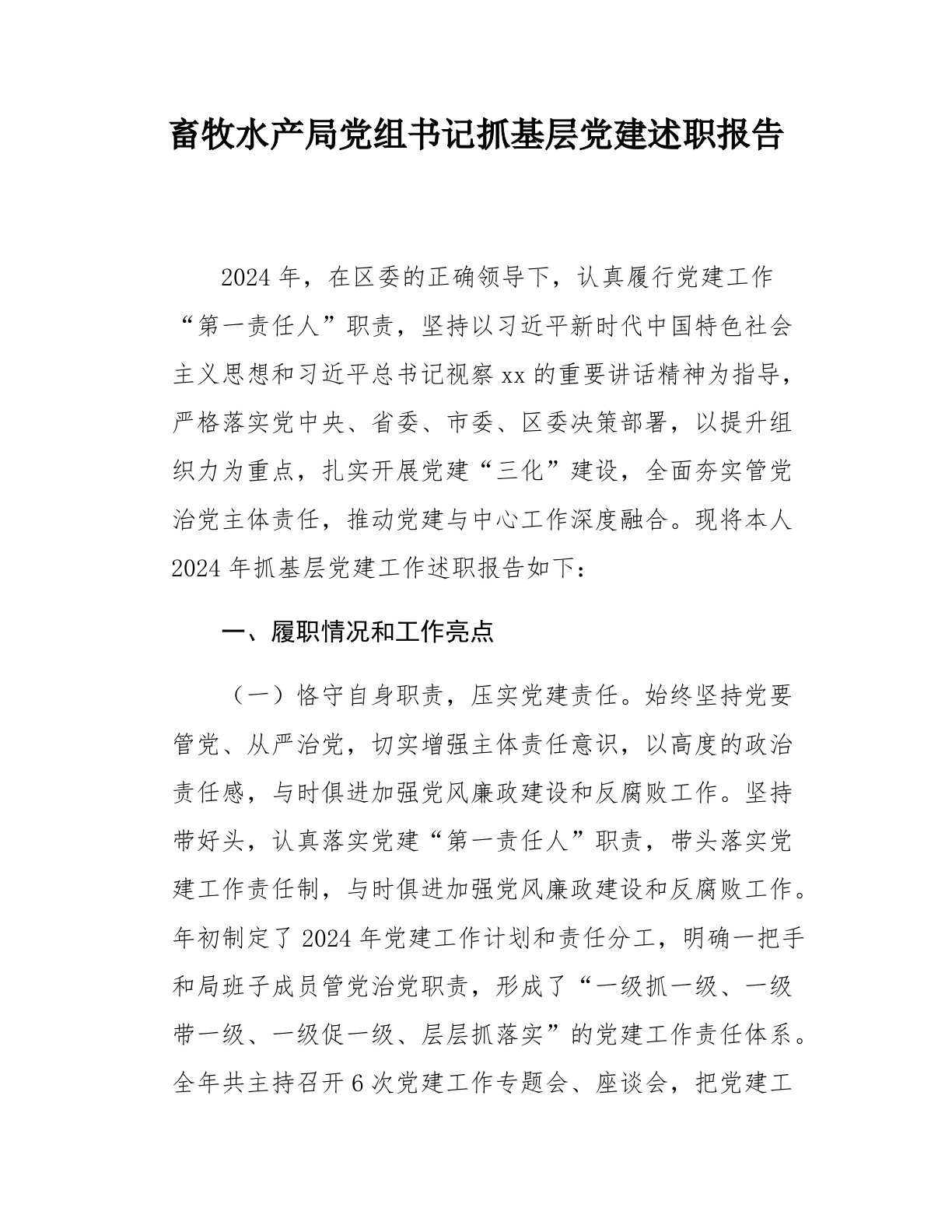 畜牧水产局党组书记抓基层党建述职报告2024年,在区委的正确领导下,认真履行党建工作“第一责任人”职责,坚持以习近平新时代中国特色社会主义思想和习近平总书记视察xx的重要讲话精神为指导,严格落实党中央、省委、市委、区委决策部署,以提升组织力为重点,扎实开展党建“三化”建设,全面夯实管党治党主体责任,推动党建与中心工作深度融合。现将本人2024年抓基层党建工作述职报告如下:一、履职情况和工作亮点(一)恪守自身职责,压实党建责任。始终坚持党要管党、从严治党,切实增强主体责任意识,以高度的政治责任感,与时俱进加强党风廉政建设和反腐败工作。坚持带好头,认真落实党建“第一责任人”职责,带头落实党建工作责任制,与时俱进加强党风廉政建设和反腐败工作。年初制定了2024年党建工作计划和责任分工,明确一把手和...