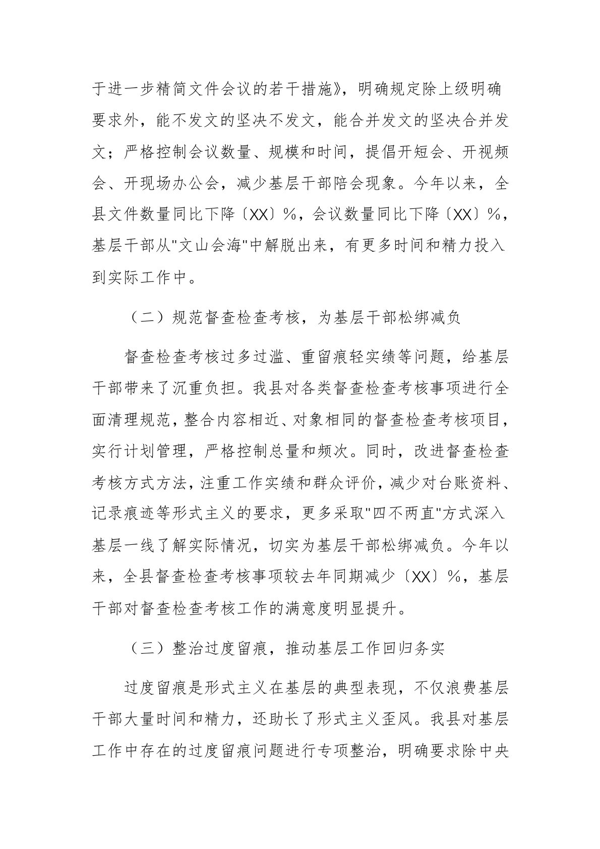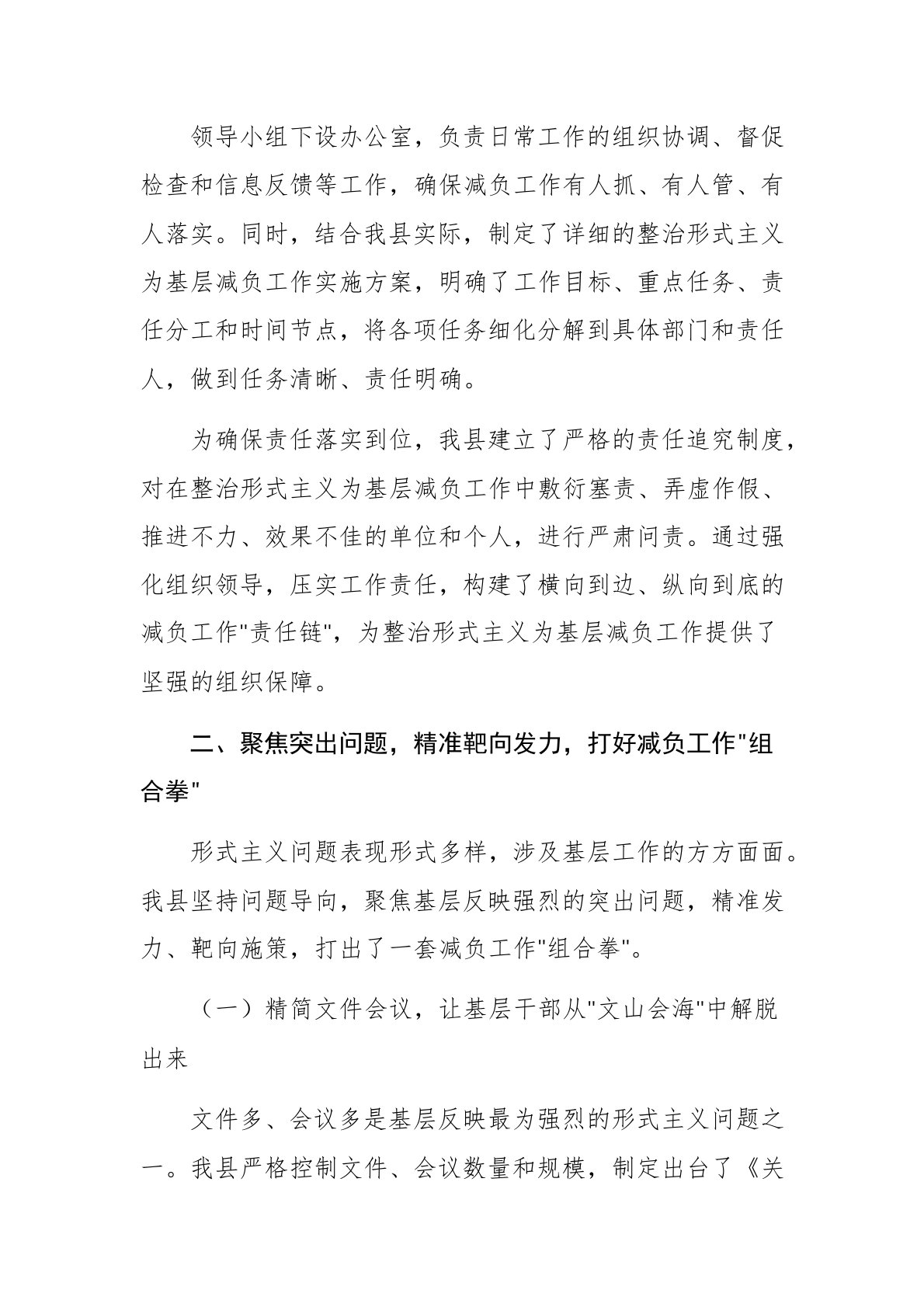 2025年整治形式主义为基层减负工作推进会上的总结汇报材料文稿尊敬的各位领导、同志们:大家好!非常荣幸能在此次全市整治形式主义为基层减负工作推进会上,代表县委就我县整治形式主义为基层减负工作情况进行总结汇报。自整治形式主义为基层减负工作开展以来,我县深入贯彻落实中央、省、市关于整治形式主义为基层减负的决策部署,将其作为一项重要政治任务,聚焦基层反映强烈的突出问题,精准发力、综合施策,推动基层减负工作取得阶段性成效。现将有关情况汇报如下:一、强化组织领导,压实工作责任,构建减负工作"责任链"整治形式主义为基层减负,关键在于加强组织领导,明确责任分工,形成上下联动、齐抓共管的工作格局。我县高度重视此项工作,将其纳入县委重要议事日程,多次召开县委常委会、专题会议进行研究部署,成立了以县委书记为组长...
