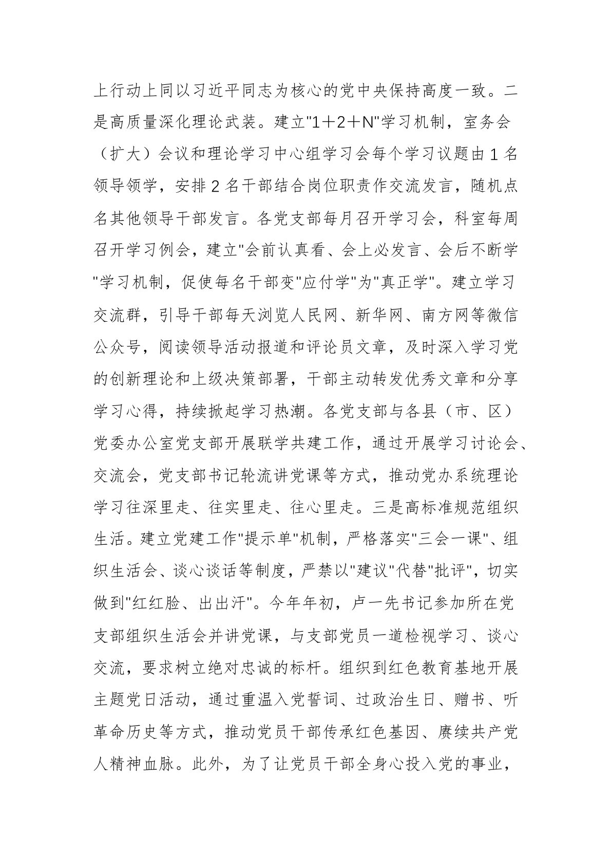 2025年市委办公室关于干部队伍建设工作情况的报告文稿近年来,市委办公室始终以习近平新时代中国特色社会主义思想为指引,坚决落实新时代党的组织路线,把政治建设作为工作的"生命线",充分发挥党建引领作用,聚焦创建党建品牌,以"三个高、三个心、四个更"全力锻造一支高素质专业化干部队伍,不断提高"三服务"工作水平,当好市委"坚强前哨"和"巩固后院"。一、主要工作情况(一)砥砺忠诚走在前,筑牢理想信念的思想根基。以"三个高"推动党员干部旗帜鲜明讲政治,始终坚持"两个确立"、做到"两个维护"。一是高起点创建党建品牌。动员全体党员干部参与党总支党建品牌的创建,从活动的主题、载体、内容和活动方式等方面进行交流研讨,由每名党员干部提出书面意见建议,党总支集思广益确定"忠诚党办·服务典范"党建品牌。同时,为进一...