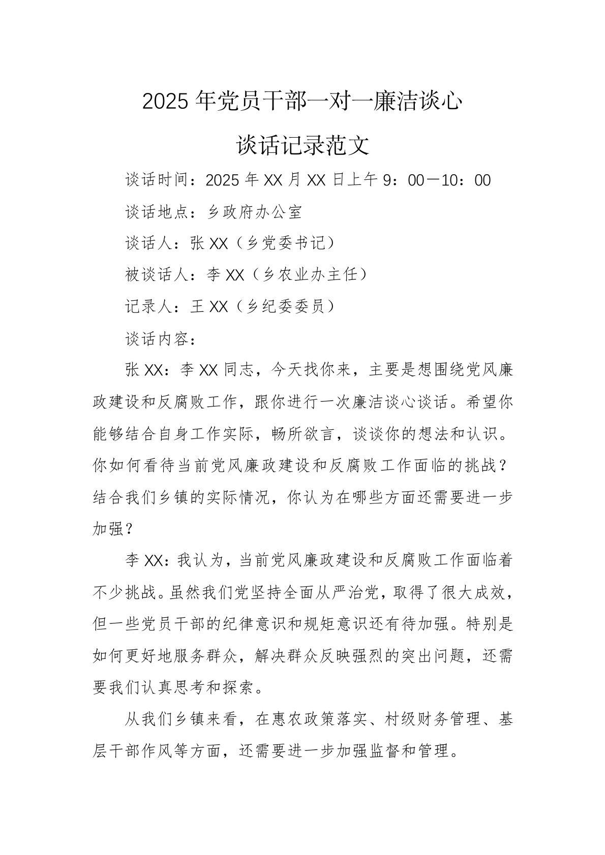 2025年党员干部一对一廉洁谈心谈话记录范文谈话时间:2025年XX月XX日上午9:00-10:00谈话地点:乡政府办公室谈话人:张XX(乡党委书记)被谈话人:李XX(乡农业办主任)记录人:王XX(乡纪委委员)谈话内容:张XX:李XX同志,今天找你来,主要是想围绕党风廉政建设和反腐败工作,跟你进行一次廉洁谈心谈话。希望你能够结合自身工作实际,畅所欲言,谈谈你的想法和认识。你如何看待当前党风廉政建设和反腐败工作面临的挑战?结合我们乡镇的实际情况,你认为在哪些方面还需要进一步加强?李XX:我认为,当前党风廉政建设和反腐败工作面临着不少挑战。虽然我们党坚持全面从严治党,取得了很大成效,但一些党员干部的纪律意识和规矩意识还有待加强。特别是如何更好地服务群众,解决群众反映强烈的突出问题,还需要我们认真...