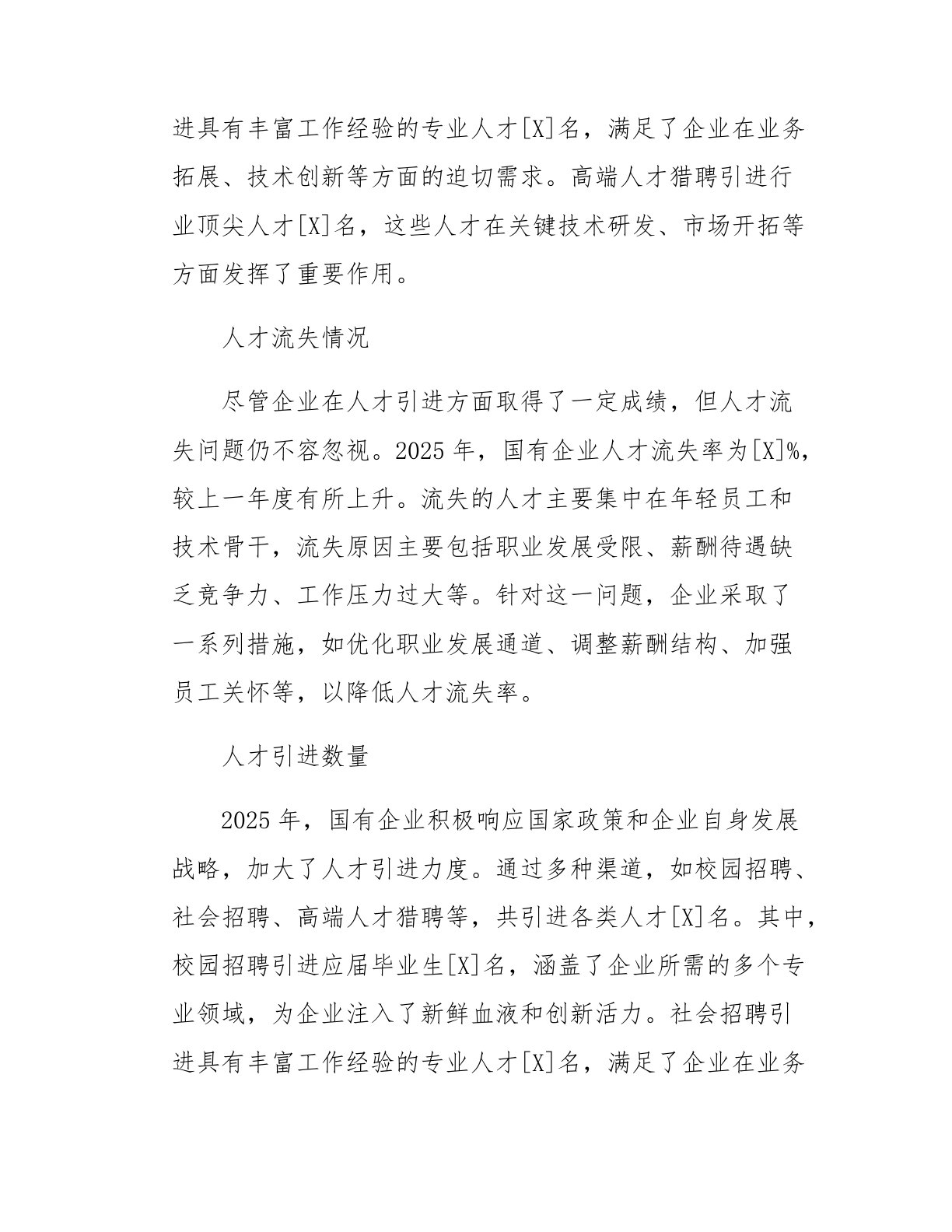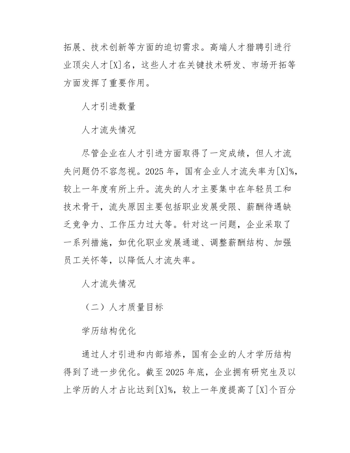 国有企业2025年人才工作总结一、引言在当今激烈的市场竞争环境下,人才已成为企业发展的核心驱动力。国有企业作为国民经济的重要支柱,肩负着推动国家经济发展、保障民生等重要使命。2025年,对于国有企业而言,是深化改革、转型升级的关键一年,人才工作的成效直接关系到企业的兴衰成败。本总结旨在全面回顾2025年国有企业人才工作的开展情况,分析取得的成绩与存在的问题,为未来的人才工作提供参考和借鉴。二、人才工作目标完成情况(一)人才数量目标人才引进数量2025年,国有企业积极响应国家政策和企业自身发展战略,加大了人才引进力度。通过多种渠道,如校园招聘、社会招聘、高端人才猎聘等,共引进各类人才[X]名。其中,校园招聘引进应届毕业生[X]名,涵盖了企业所需的多个专业领域,为企业注入了新鲜血液和创新活力。社...