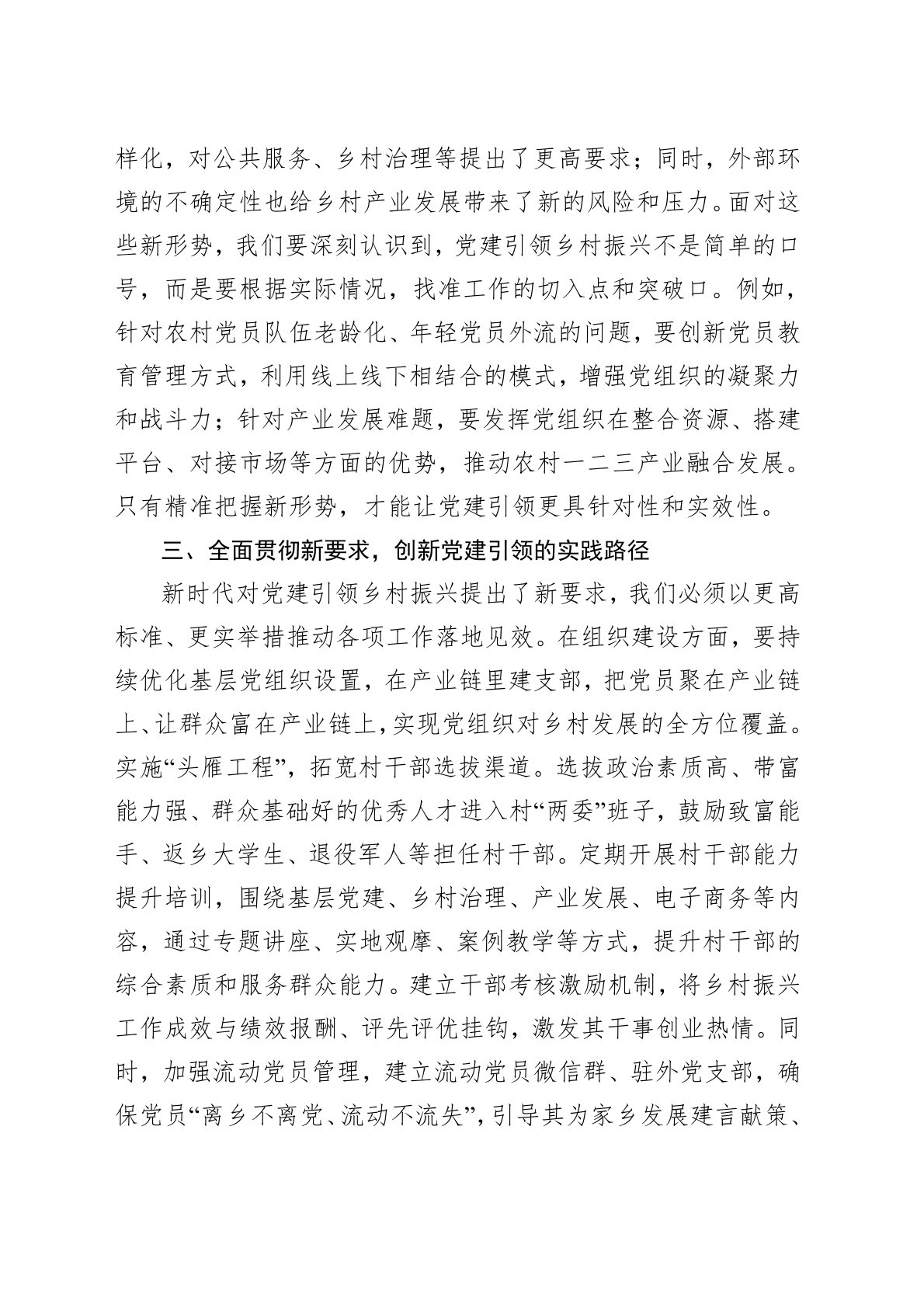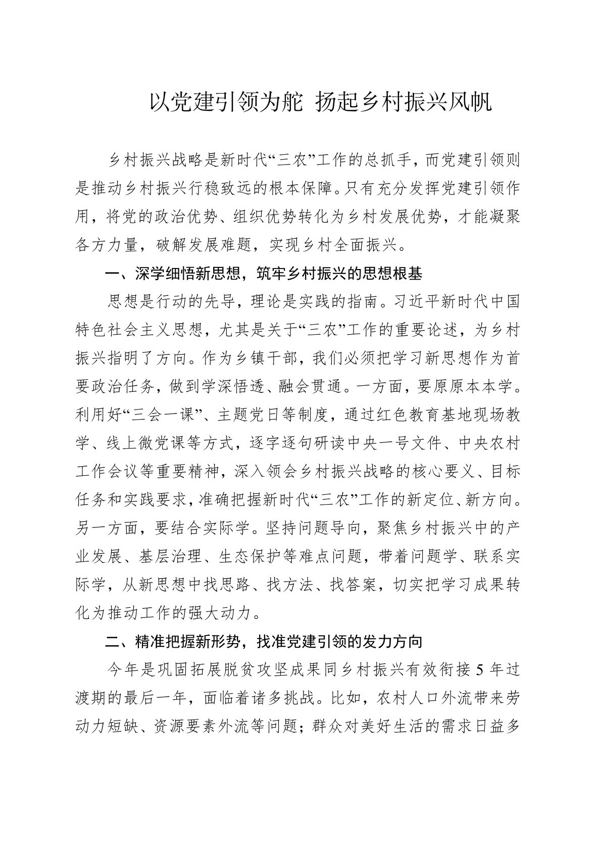 以党建引领为舵扬起乡村振兴风帆乡村振兴战略是新时代“三农”工作的总抓手,而党建引领则是推动乡村振兴行稳致远的根本保障。只有充分发挥党建引领作用,将党的政治优势、组织优势转化为乡村发展优势,才能凝聚各方力量,破解发展难题,实现乡村全面振兴。一、深学细悟新思想,筑牢乡村振兴的思想根基思想是行动的先导,理论是实践的指南。习近平新时代中国特色社会主义思想,尤其是关于“三农”工作的重要论述,为乡村振兴指明了方向。作为乡镇干部,我们必须把学习新思想作为首要政治任务,做到学深悟透、融会贯通。一方面,要原原本本学。利用好“三会一课”、主题党日等制度,通过红色教育基地现场教学、线上微党课等方式,逐字逐句研读中央一号文件、中央农村工作会议等重要精神,深入领会乡村振兴战略的核心要义、目标任务和实践要求,准确把握新...