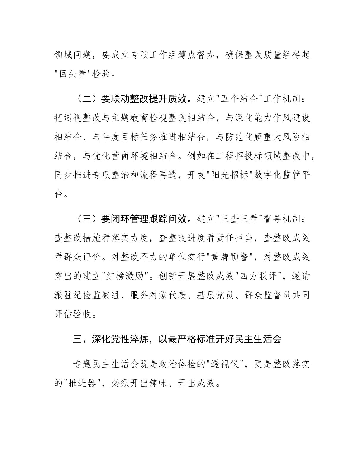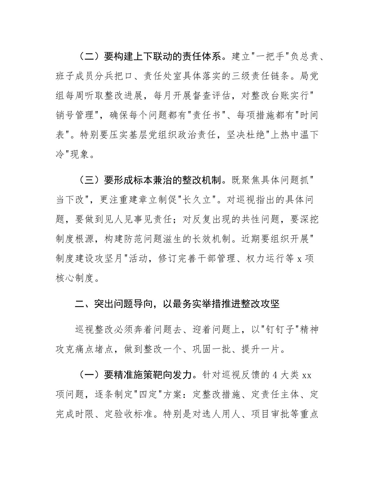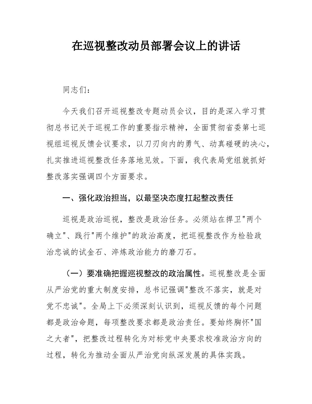 在巡视整改动员部署会议上的讲话同志们:今天我们召开巡视整改专题动员会议,目的是深入学习贯彻总书记关于巡视工作的重要指示精神,全面贯彻省委第七巡视组巡视反馈会议要求,以刀刃向内的勇气、动真碰硬的决心,扎实推进巡视整改任务落地见效。下面,我代表局党组就抓好整改落实强调四个方面要求。一、强化政治担当,以最坚决态度扛起整改责任巡视是政治巡视,整改是政治任务。必须站在捍卫"两个确立"、践行"两个维护"的政治高度,把巡视整改作为检验政治忠诚的试金石、淬炼政治能力的磨刀石。(一)要准确把握巡视整改的政治属性。巡视整改是全面从严治党的重大制度安排,总书记强调"整改不落实,就是对党不忠诚"。全局上下必须深刻认识到,巡视反馈的每个问题都是政治命题,每项整改要求都是政治责任。要始终胸怀"国之大者",把整改过程转化...