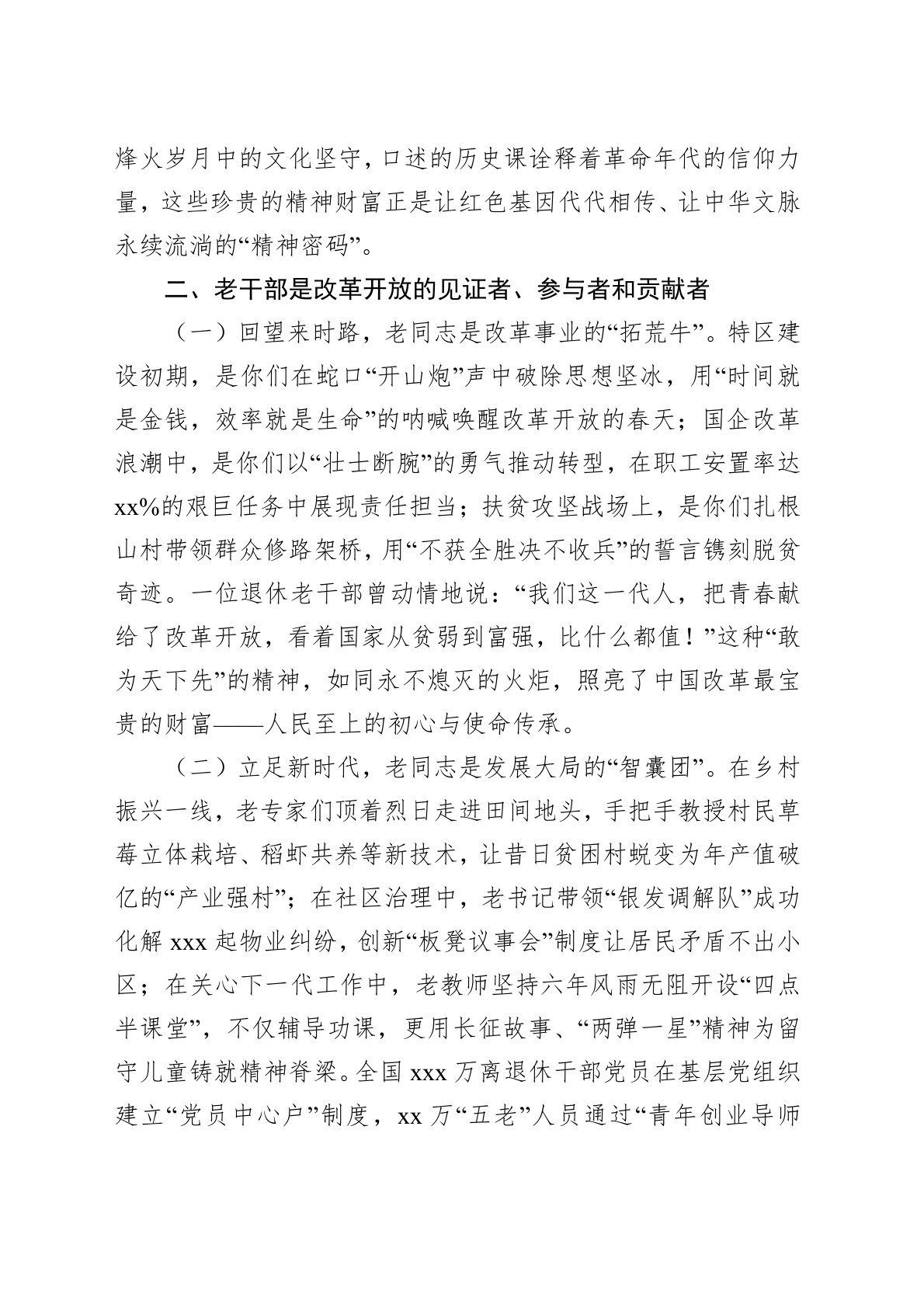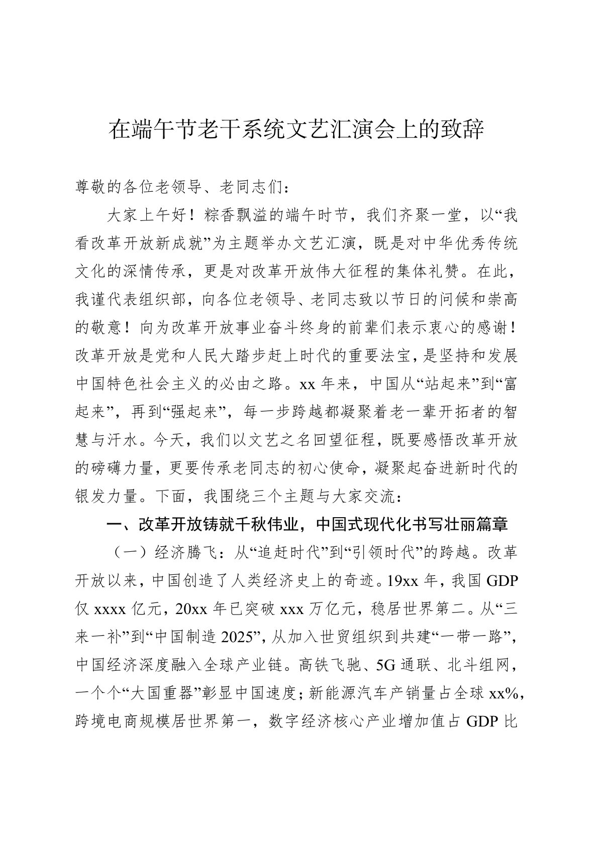 尊敬的各位老领导、老同志们:大家上午好!粽香飘溢的端午时节,我们齐聚一堂,以“我看改革开放新成就”为主题举办文艺汇演,既是对中华优秀传统文化的深情传承,更是对改革开放伟大征程的集体礼赞。在此,我谨代表组织部,向各位老领导、老同志致以节日的问候和崇高的敬意!向为改革开放事业奋斗终身的前辈们表示衷心的感谢!改革开放是党和人民大踏步赶上时代的重要法宝,是坚持和发展中国特色社会主义的必由之路。xx年来,中国从“站起来”到“富起来”,再到“强起来”,每一步跨越都凝聚着老一辈开拓者的智慧与汗水。今天,我们以文艺之名回望征程,既要感悟改革开放的磅礴力量,更要传承老同志的初心使命,凝聚起奋进新时代的银发力量。下面,我围绕三个主题与大家交流:一、改革开放铸就千秋伟业,中国式现代化书写壮丽篇章(一)经济腾飞:从...