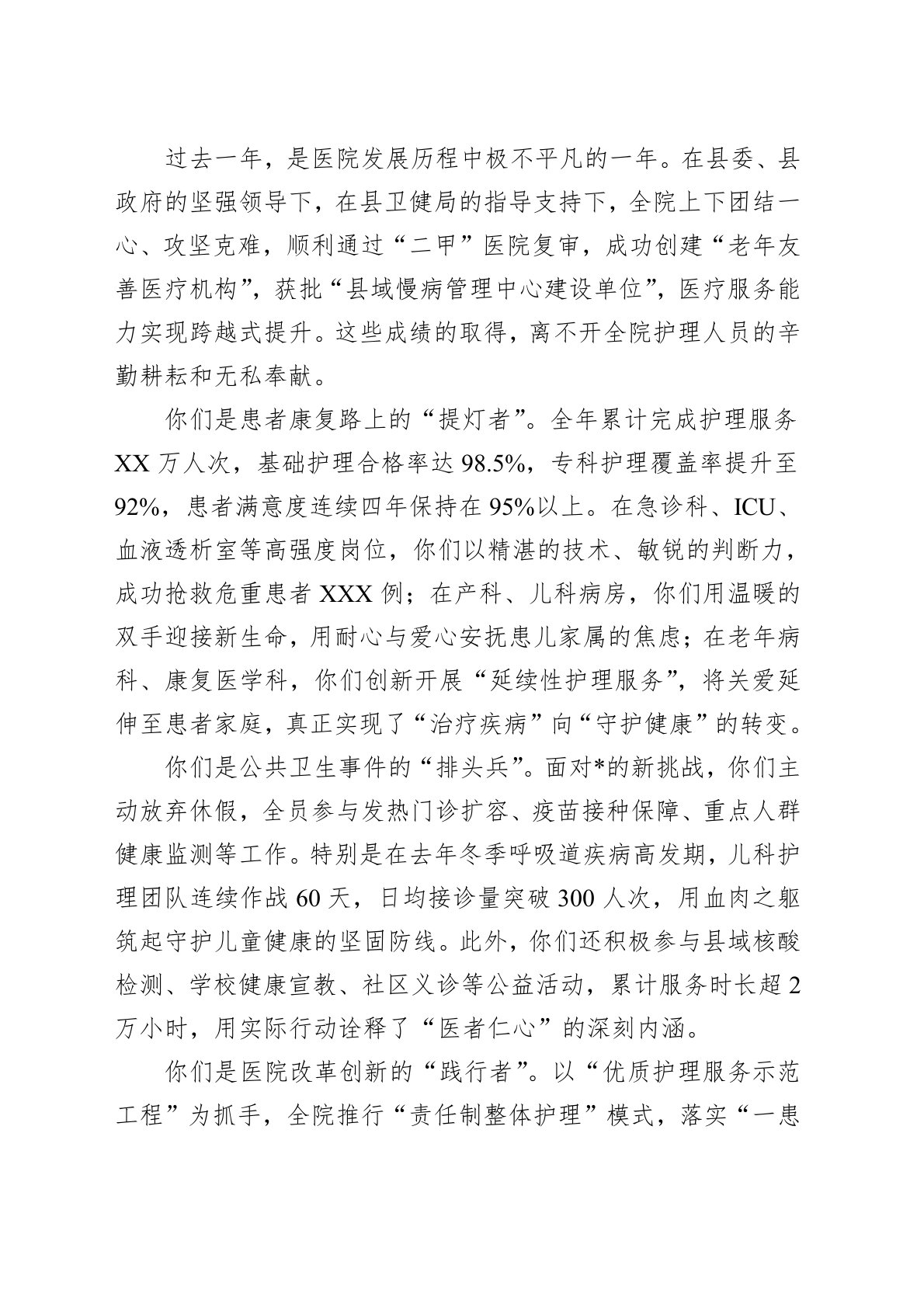 同志们:大家好!今天,我们怀着无比崇敬与感激的心情,齐聚一堂,共同庆祝第114个“5.12国际护士节”。首先,我谨代表医院领导班子,向全院日夜奋战在临床一线的护理工作者致以节日的问候和崇高的敬意!向默默支持你们工作的家人表示衷心的感谢!同时,向今天受到表彰的先进集体和个人表示热烈的祝贺!护理工作是医疗卫生事业的重要组成部分,护士是守护人民健康的重要力量。无论是日常诊疗中的细致照料,还是突发事件中的逆行出征,你们始终以“敬佑生命、救死扶伤、甘于奉献、大爱无疆”的职业精神,诠释着白衣天使的使命担当。过去一年,面对医疗改革深化、公共卫生挑战加剧的新形势,全院护理团队迎难而上、锐意进取,在提升服务质量、优化护理模式、保障患者安全等方面取得了显著成绩。今天,我们在这里表彰先进、分享经验,既是对过往付出...
