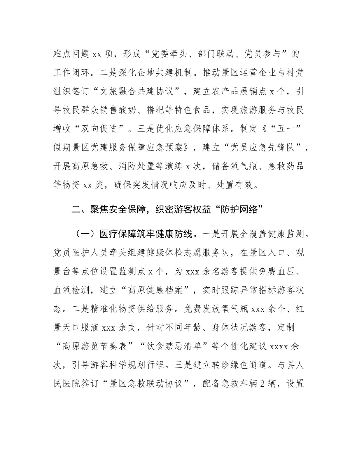 关于某县“五一”期间景区党建与文旅融合工作的汇报为营造安全、文明、有序的假期旅游环境,“五一”期间,**县以“136”景区党建工作机制为引领,将基层党组织的战斗堡垒作用深度融入旅游服务全过程。通过设立红色驿站、组建党员志愿服务队伍等举措,构建起“党建引领、党员带头、多方协同”的服务格局,实现景区服务有“力度”、游客体验有“温度”,推动景区党建与文旅融合发展取得实效。现将有关工作情况汇报如下:一、强化阵地建设,打造服务游客“红色堡垒”(一)红色驿站构筑暖心服务枢纽。一是完善基础功能供给。在**马场、**镇、**镇x处核心景区设立红色驿站,配备休息座椅、充电设备、饮用水装置等便民设施,构建“xx分钟服务圈”,为游客提供即时性基础保障。二是创新特色服务载体。党员志愿者实行“全天候轮班制”,除解答导...