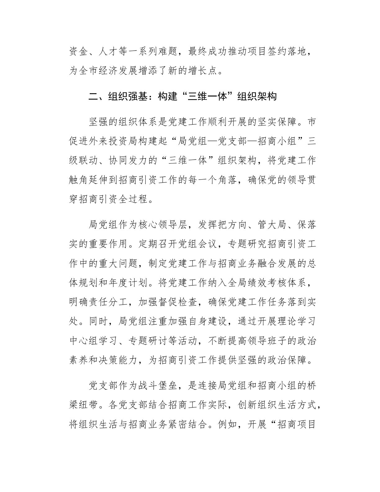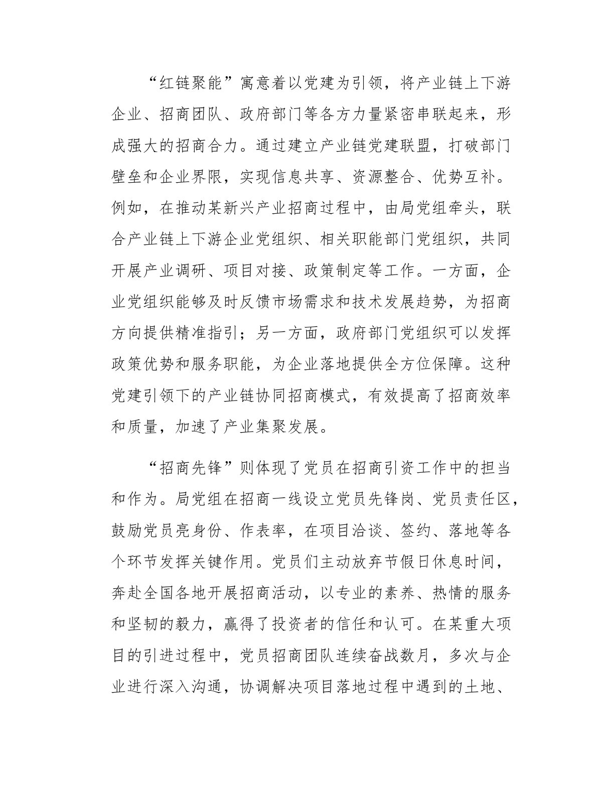 市促进外来投资局机关党建典型案例材料:党建品牌引领招商引资新格局在经济发展的大棋局中,招商引资是推动区域经济增长、优化产业结构、提升城市竞争力的关键一招。市促进外来投资局作为全市招商引资工作的前沿阵地和核心力量,始终将党建工作与招商引资工作深度融合,以打造特色党建品牌为引领,积极探索党建与业务同频共振的新路径,构建起招商引资工作新格局,为全市经济高质量发展注入了强大动力。一、品牌铸魂:打造“红链聚能·招商先锋”党建品牌品牌是旗帜,是凝聚力量、引领方向的重要标识。市促进外来投资局立足招商引资工作实际,精心打造“红链聚能·招商先锋”党建品牌,将红色基因融入招商引资全链条,充分发挥党组织的战斗堡垒作用和党员的先锋模范作用,为招商引资工作注入红色动能。“红链聚能”寓意着以党建为引领,将产业链上下游企...