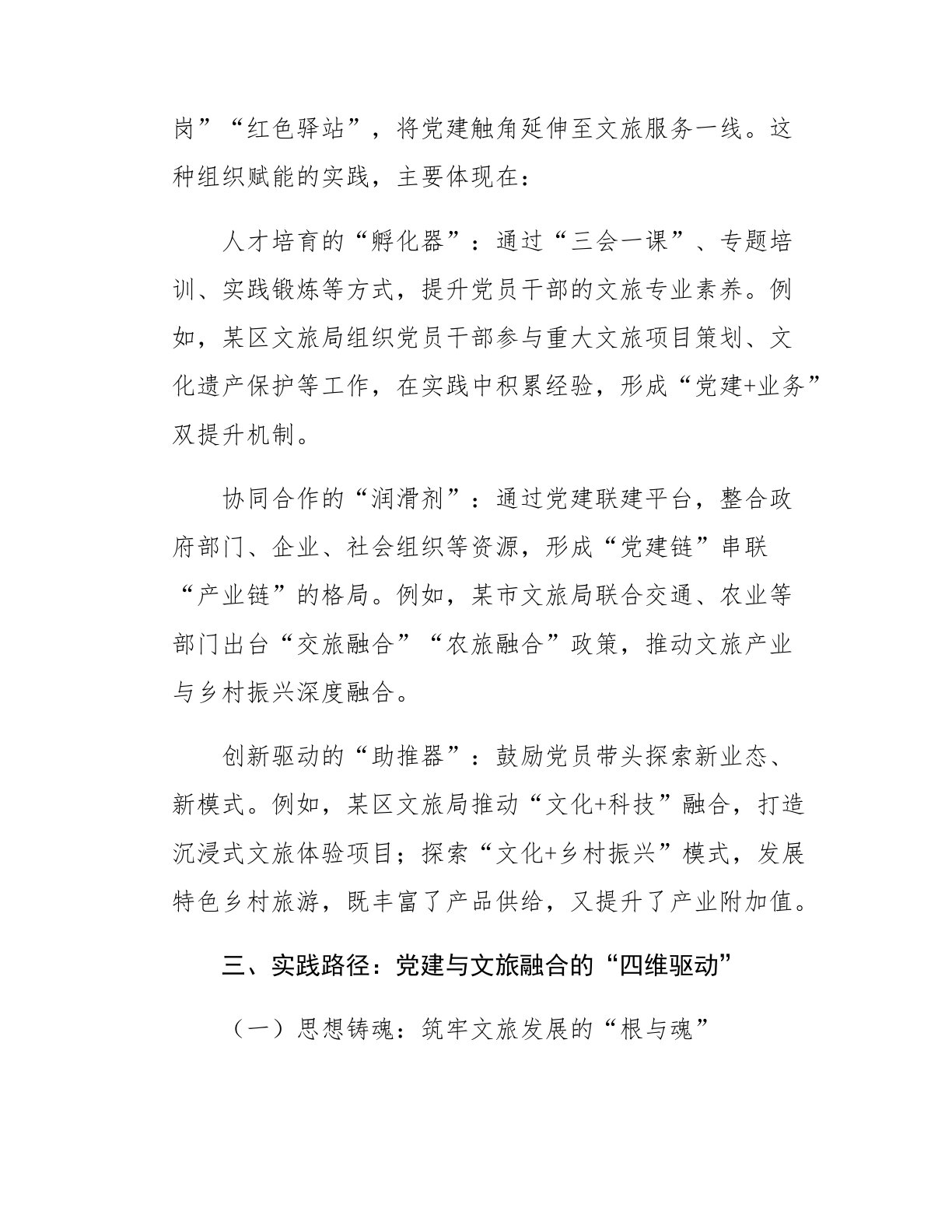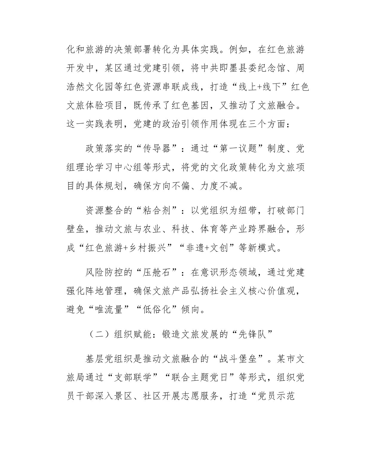 区文化和旅游局党组书记理论中心组研讨发言:以高质量党建激发文旅发展新质生产力一、引言:党建引领与文旅发展的时代命题在全面建设社会主义现代化国家的新征程中,文化和旅游产业作为推动经济转型升级、满足人民美好生活需求的重要力量,正面临前所未有的发展机遇。然而,文旅产业的高质量发展不仅需要资源整合与市场创新,更需要以党的建设为根本保障,激发新质生产力,实现内涵式增长。作为区文化和旅游局党组书记,我深刻认识到,党建不仅是文旅发展的“定盘星”,更是激发创新活力、凝聚发展合力的“动力源”。本文将从理论逻辑、实践路径、现实挑战及未来展望四个维度,探讨如何以高质量党建引领文旅产业高质量发展,为区域经济社会发展注入新动能。二、党建引领:文旅发展的核心驱动力(一)政治引领:把准文旅发展的“方向盘”党的领导是文旅事...