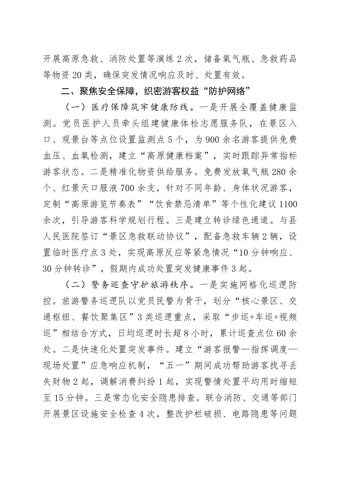 关于某县“五一”期间景区党建与文旅融合工作的汇报为营造安全、文明、有序的假期旅游环境,“五一”期间,xx县以“136”景区党建工作机制为引领,将基层党组织的战斗堡垒作用深度融入旅游服务全过程。通过设立红色驿站、组建党员志愿服务队伍等举措,构建起“党建引领、党员带头、多方协同”的服务格局,实现景区服务有“力度”、游客体验有“温度”,推动景区党建与文旅融合发展取得实效。现将有关工作情况汇报如下:一、强化阵地建设,打造服务游客“红色堡垒”(一)红色驿站构筑暖心服务枢纽。一是完善基础功能供给。在xx马场、xx镇、xx镇3处核心景区设立红色驿站,配备休息座椅、充电设备、饮用水装置等便民设施,构建“15分钟服务圈”,为游客提供即时性基础保障。二是创新特色服务载体。党员志愿者实行“全天候轮班制”,除解答导...