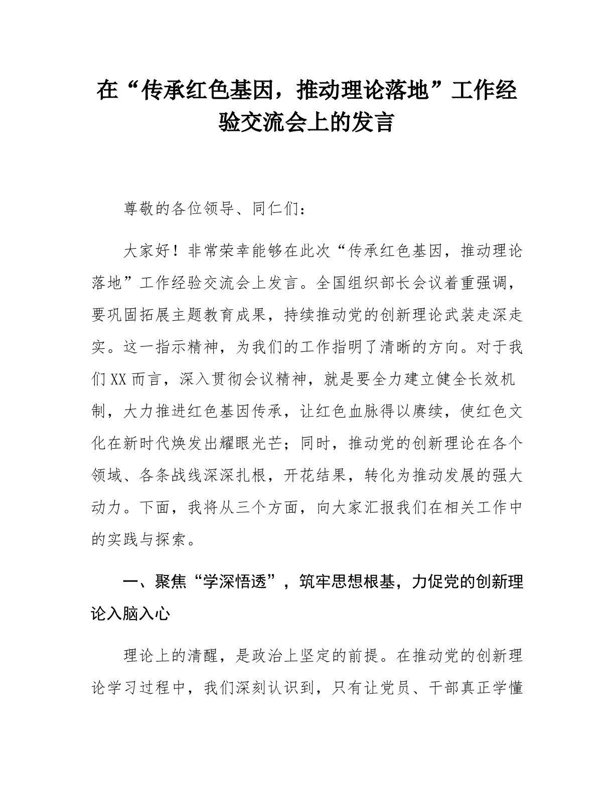 在“传承红色基因,推动理论落地”工作经验交流会上的发言尊敬的各位领导、同仁们:大家好!非常荣幸能够在此次“传承红色基因,推动理论落地”工作经验交流会上发言。全国组织部长会议着重强调,要巩固拓展主题教育成果,持续推动党的创新理论武装走深走实。这一指示精神,为我们的工作指明了清晰的方向。对于我们XX而言,深入贯彻会议精神,就是要全力建立健全长效机制,大力推进红色基因传承,让红色血脉得以赓续,使红色文化在新时代焕发出耀眼光芒;同时,推动党的创新理论在各个领域、各条战线深深扎根,开花结果,转化为推动发展的强大动力。下面,我将从三个方面,向大家汇报我们在相关工作中的实践与探索。一、聚焦“学深悟透”,筑牢思想根基,力促党的创新理论入脑入心理论上的清醒,是政治上坚定的前提。在推动党的创新理论学习过程中,我...