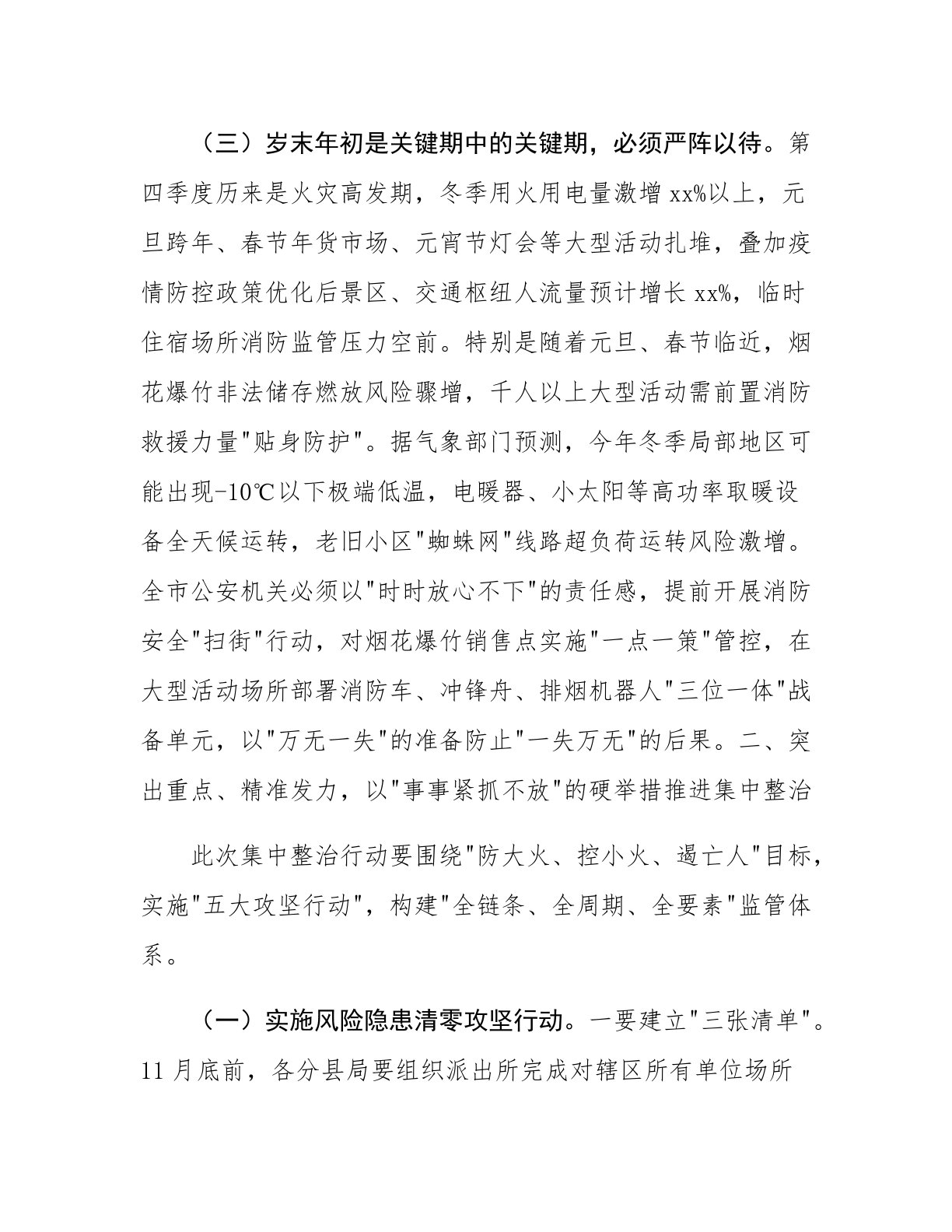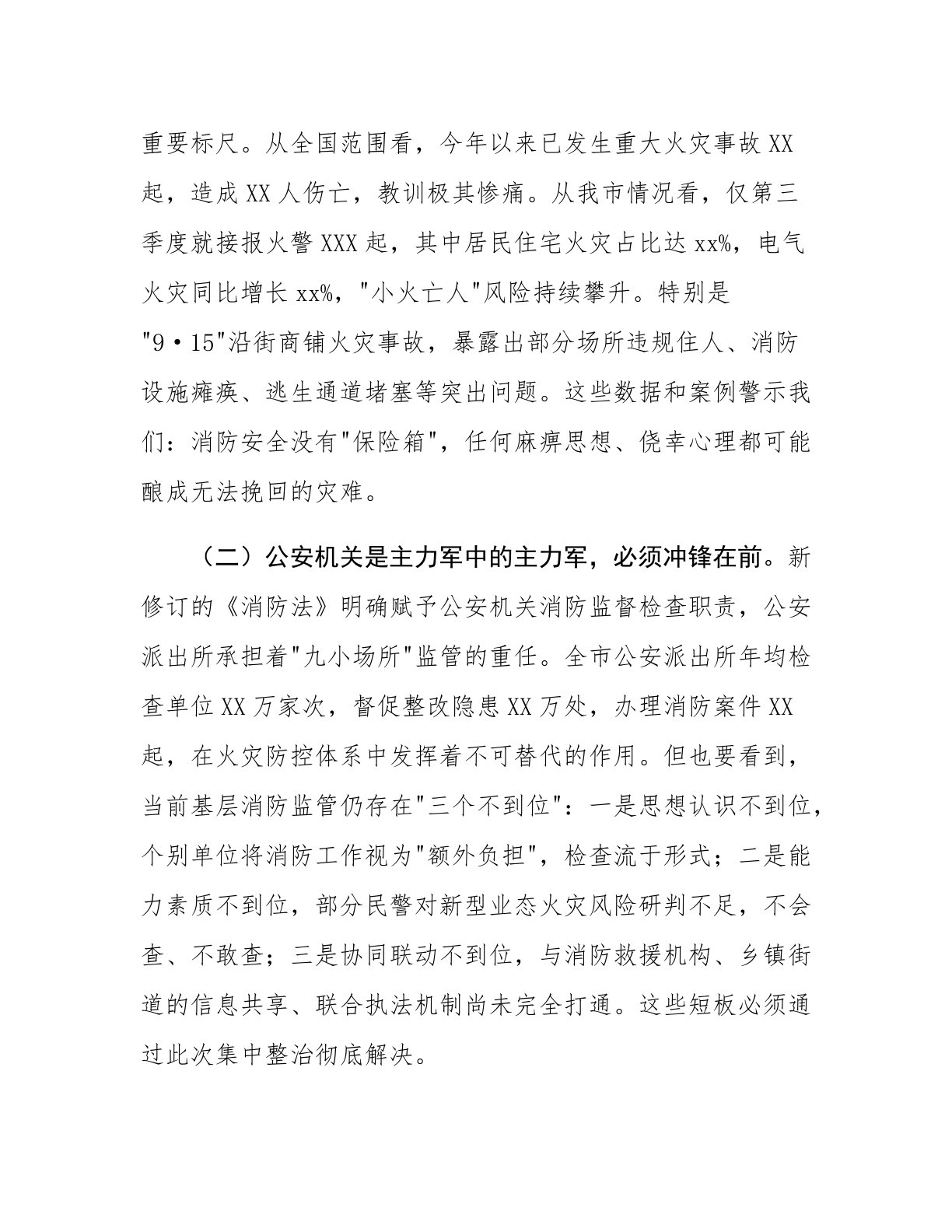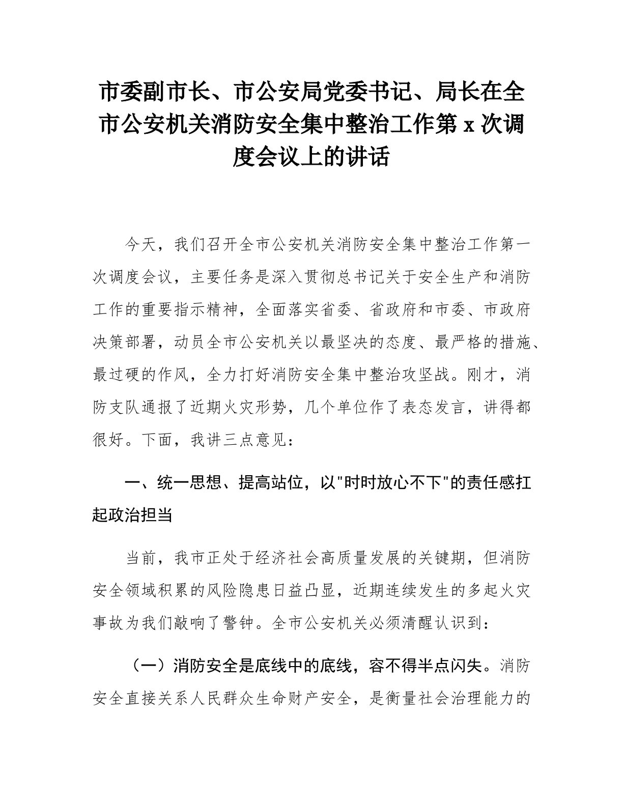 市委副市长、市公安局党委书记、局长在全市公安机关消防安全集中整治工作第x次调度会议上的讲话今天,我们召开全市公安机关消防安全集中整治工作第一次调度会议,主要任务是深入贯彻总书记关于安全生产和消防工作的重要指示精神,全面落实省委、省政府和市委、市政府决策部署,动员全市公安机关以最坚决的态度、最严格的措施、最过硬的作风,全力打好消防安全集中整治攻坚战。刚才,消防支队通报了近期火灾形势,几个单位作了表态发言,讲得都很好。下面,我讲三点意见:一、统一思想、提高站位,以"时时放心不下"的责任感扛起政治担当当前,我市正处于经济社会高质量发展的关键期,但消防安全领域积累的风险隐患日益凸显,近期连续发生的多起火灾事故为我们敲响了警钟。全市公安机关必须清醒认识到:(一)消防安全是底线中的底线,容不得半点闪失。...