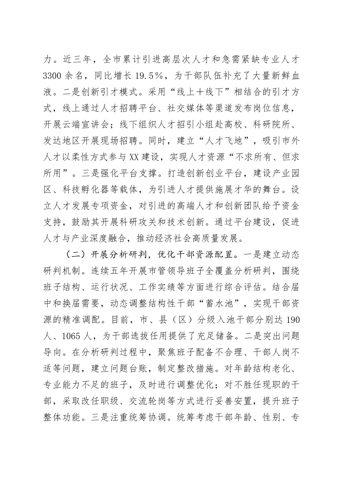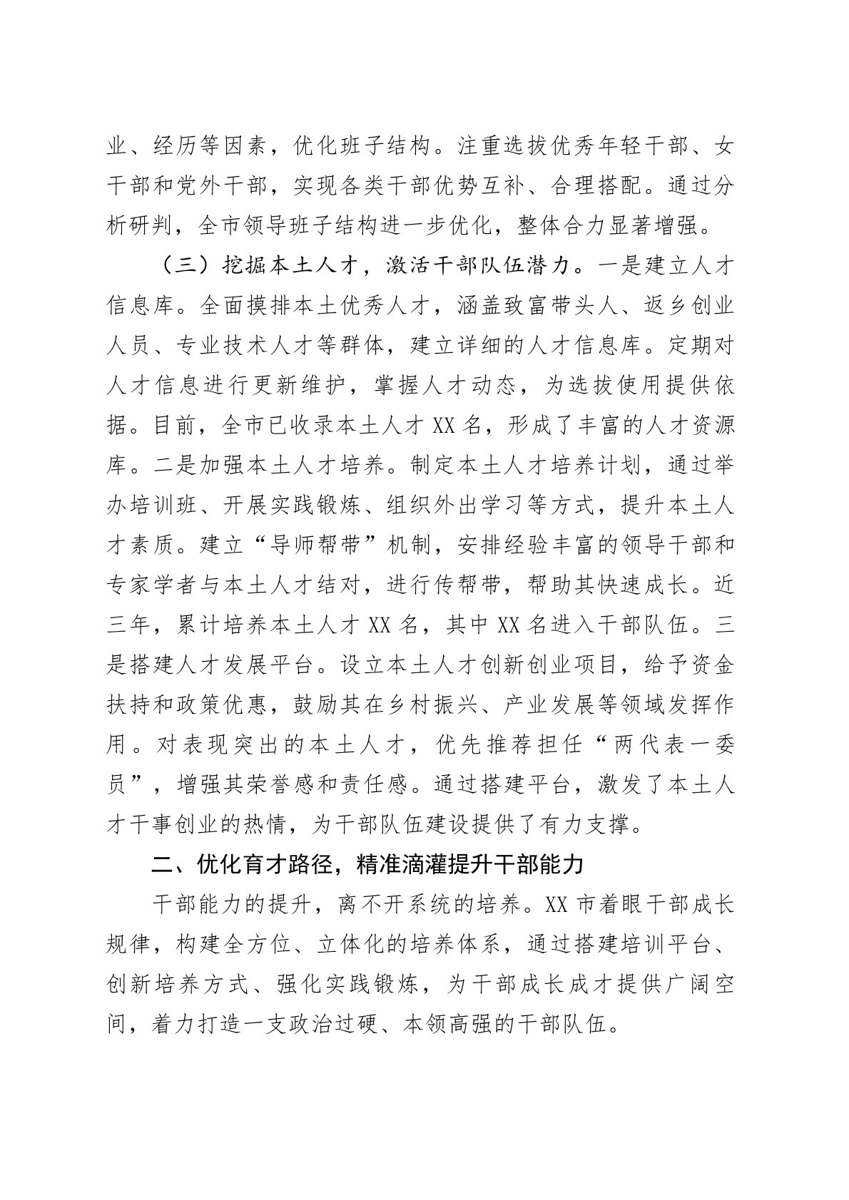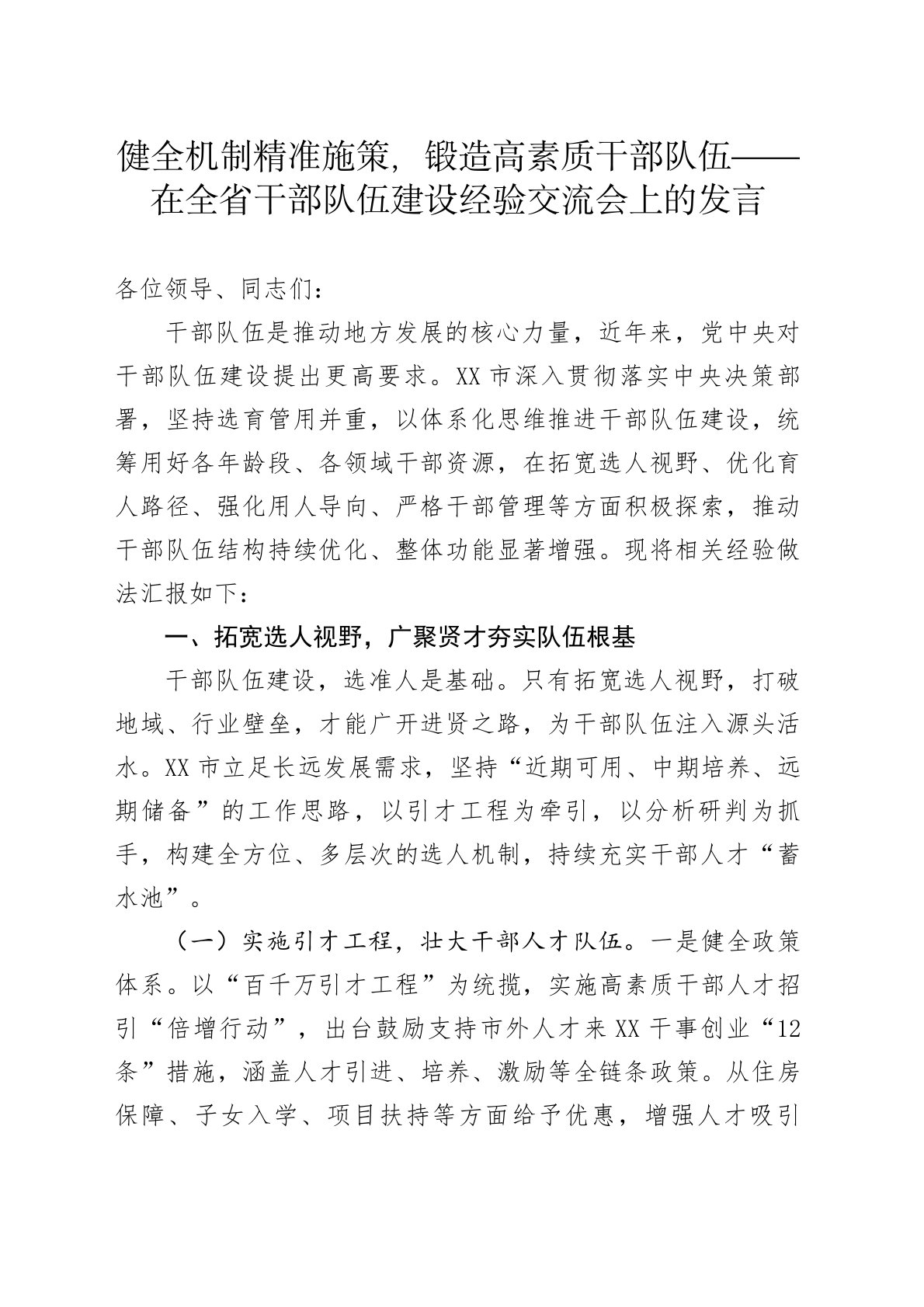健全机制精准施策,锻造高素质干部队伍——在全省干部队伍建设经验交流会上的发言各位领导、同志们:干部队伍是推动地方发展的核心力量,近年来,党中央对干部队伍建设提出更高要求。XX市深入贯彻落实中央决策部署,坚持选育管用并重,以体系化思维推进干部队伍建设,统筹用好各年龄段、各领域干部资源,在拓宽选人视野、优化育人路径、强化用人导向、严格干部管理等方面积极探索,推动干部队伍结构持续优化、整体功能显著增强。现将相关经验做法汇报如下:一、拓宽选人视野,广聚贤才夯实队伍根基干部队伍建设,选准人是基础。只有拓宽选人视野,打破地域、行业壁垒,才能广开进贤之路,为干部队伍注入源头活水。XX市立足长远发展需求,坚持“近期可用、中期培养、远期储备”的工作思路,以引才工程为牵引,以分析研判为抓手,构建全方位、多层次的...