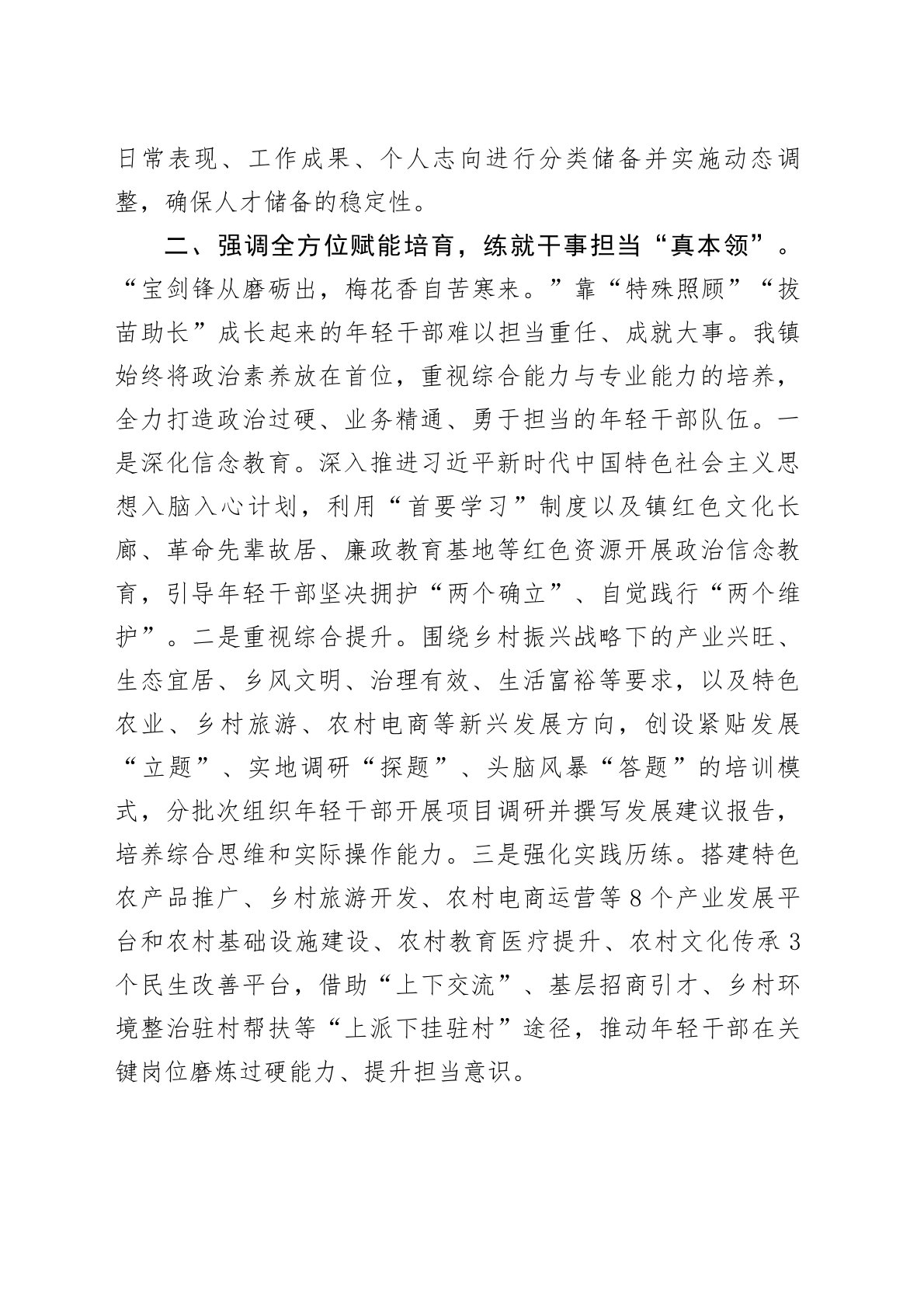 2025年乡镇年轻干部队伍建设经验交流近年来,我镇始终将“抓好年轻干部队伍建设这个关键之举”置于重要地位,全力构建年轻干部选、育、用、管的全链条培养体系,致力于培育出能挑大梁、可担大任的“年轻骨干”。一、注重前瞻性招募储备,拓宽年轻干部“人才源”。习近平总书记记指出:“年轻干部的储备,要兼顾数量与质量,着眼当下需求与长远规划。”年轻干部的招募储备,不仅要满足当下需求,更要从长远战略考量,保障数量、提升质量、优化结构。我镇秉持当下需求与长远战略兼顾的原则,精心规划年轻干部招募储备工作,确保人才供应源源不断。一是强化战略规划。基于“构建乡村振兴示范乡镇”的战略目标,深入研究产业发展趋势、干部队伍结构状况,剖析专业型干部队伍现存缺口以及未来发展所需,制定《年轻干部储备规划方案》,促使年轻干部储备与...