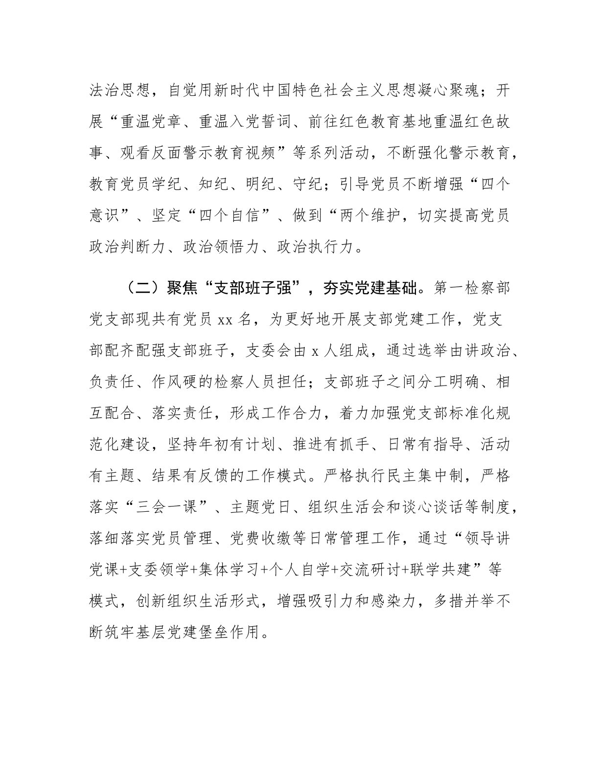 市人民检察院党支部党建工作总结市人民检察院第一检察部党支部始终坚持以新时代中国特色社会主义思想为指导,积极探索强化党建与业务深度融合的路径,充分发挥党组织的战斗堡垒作用和党员先锋模范作用,先后获得“市扫黑除恶先进集体”“市青少年维权岗”“集体三等功”“集体嘉奖”“先进基层党组织”等集体荣誉,被授予首批市直机关“四强”党支部;支部所在党员创先争优、勇挑重担、成绩突出,多人次先后获得“全省市县两级检察机关优秀个人”“市扫黑除恶专项斗争先进工作者”“市三八红旗手”“个人三等功”等称号。突出办理了一批有影响力、有实效的重大疑难复杂刑事案件,多起案例被最高检、省院和市检察机关评为优秀典型案例。一、主要工作情况(一)聚焦“政治功能强”,筑牢政治忠诚。第一检察部党支部坚持以党的政治建设为统领,坚决落实“第...