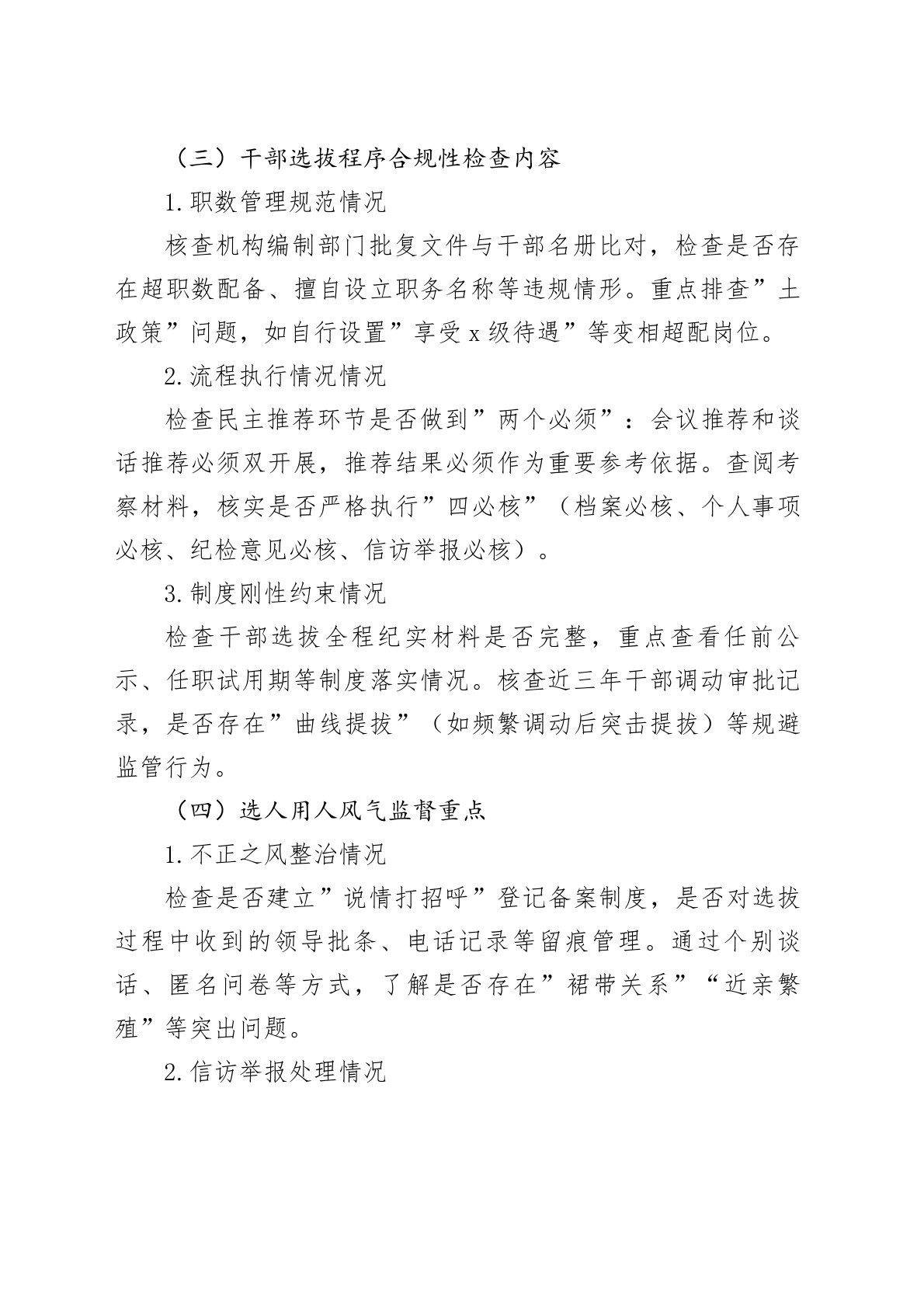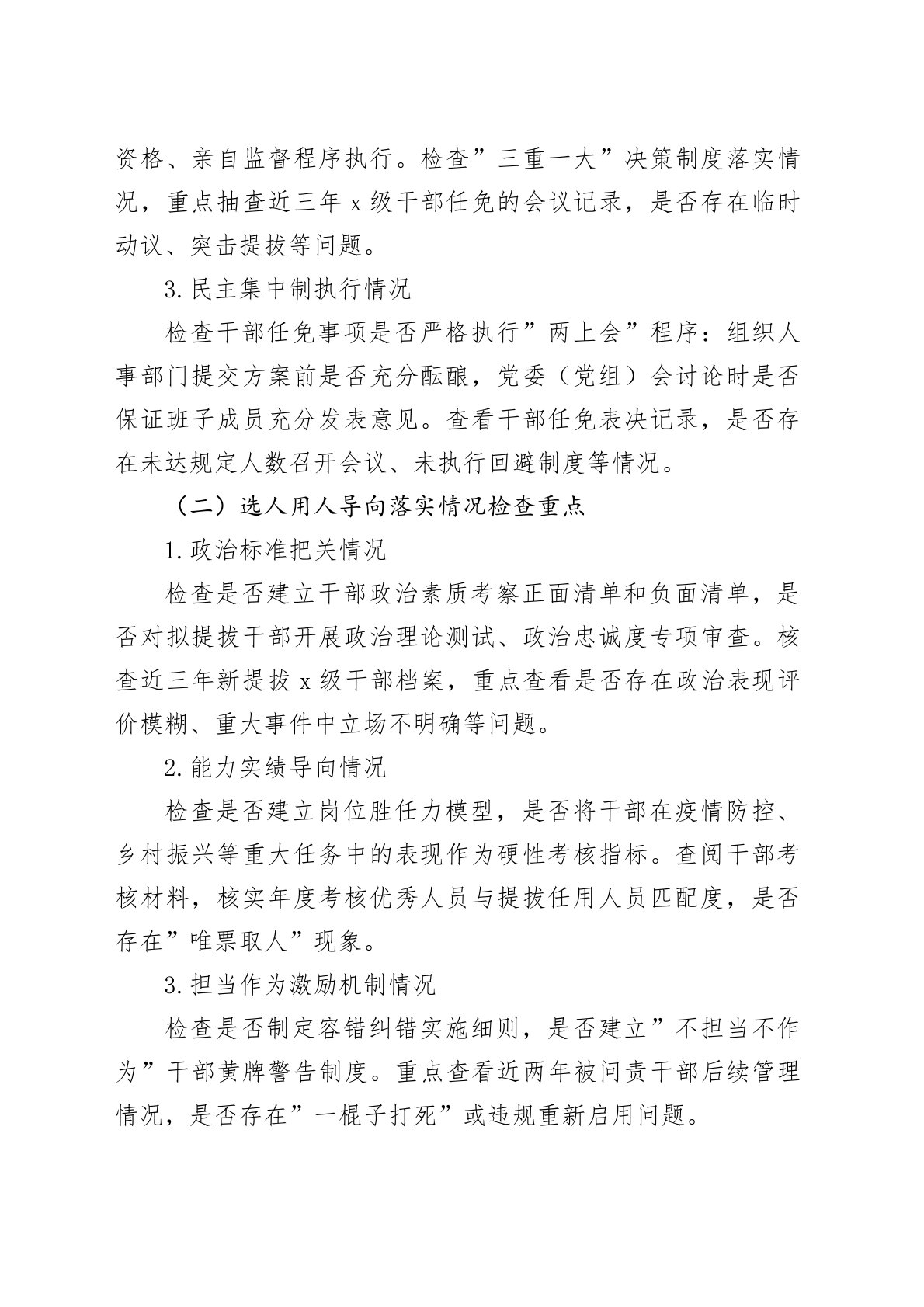 Xx县关于开展干部选拔任用工作专项检查的实施方案根据《干部选拔任用工作监督检查和责任追究办法》、《中共xx县委关于进一步加强和规范干部管理工作的意见(试行)》和《中共xx县委关于进一步加强和改进全县各单位x级干部管理的意见》等有关文件精神,为进一步推动全县干部队伍建设和后备干部培养,近期,县委组织部将派出专项检查组到各单位对x级干部选拔任用工作开展检查。现将有关事项通知如下:一、检查时间2025年5月1日后,具体时间另行通知。二、检查内容(一)党委(党组)选人用人主体责任落实情况检查要点1.制度机制建设情况检查党委(党组)是否建立干部选拔任用专题学习机制,是否定期组织班子成员学习《党政领导干部选拔任用工作条例》等最新政策文件。重点查看党委会议事规则中是否明确干部任免事项的决策程序,是否将干部...