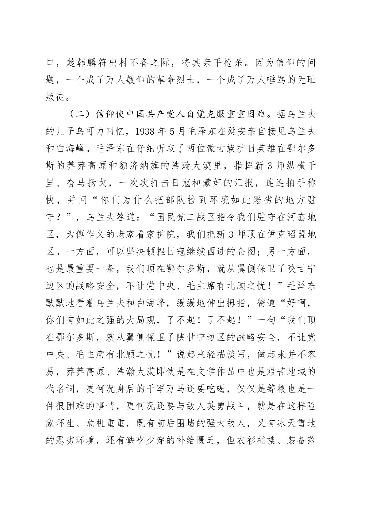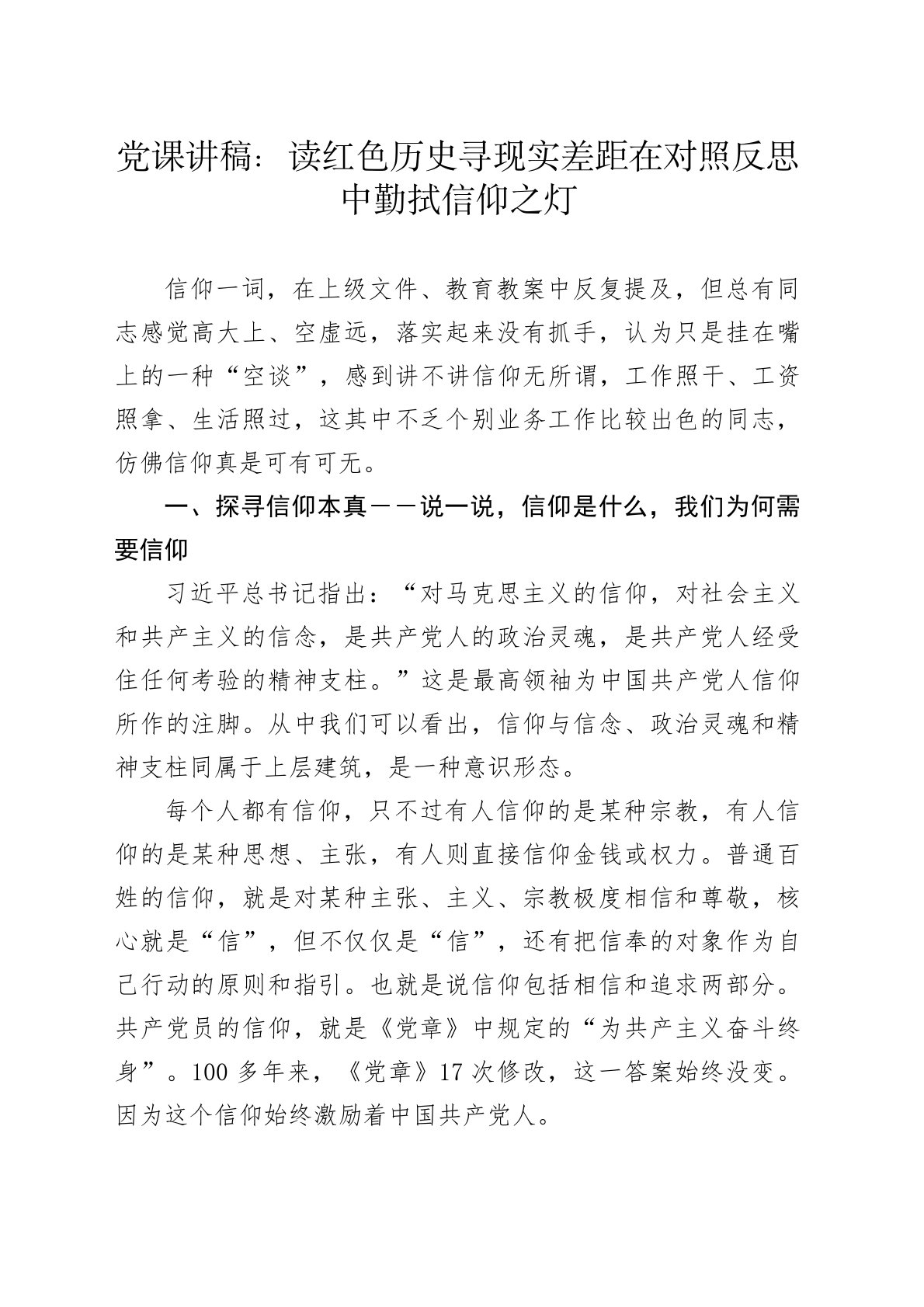 党课讲稿:读红色历史寻现实差距在对照反思中勤拭信仰之灯信仰一词,在上级文件、教育教案中反复提及,但总有同志感觉高大上、空虚远,落实起来没有抓手,认为只是挂在嘴上的一种“空谈”,感到讲不讲信仰无所谓,工作照干、工资照拿、生活照过,这其中不乏个别业务工作比较出色的同志,仿佛信仰真是可有可无。一、探寻信仰本真--说一说,信仰是什么,我们为何需要信仰习近平总书记指出:“对马克思主义的信仰,对社会主义和共产主义的信念,是共产党人的政治灵魂,是共产党人经受住任何考验的精神支柱。”这是最高领袖为中国共产党人信仰所作的注脚。从中我们可以看出,信仰与信念、政治灵魂和精神支柱同属于上层建筑,是一种意识形态。每个人都有信仰,只不过有人信仰的是某种宗教,有人信仰的是某种思想、主张,有人则直接信仰金钱或权力。普通百姓...