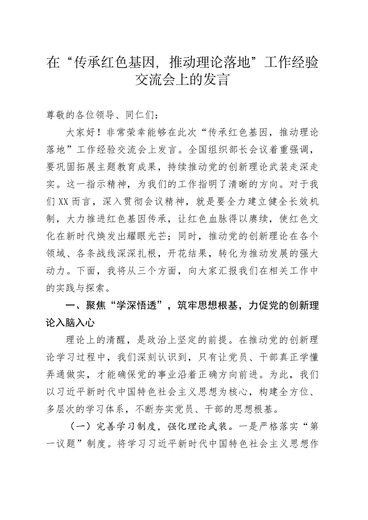 在“传承红色基因,推动理论落地”工作经验交流会上的发言.docx