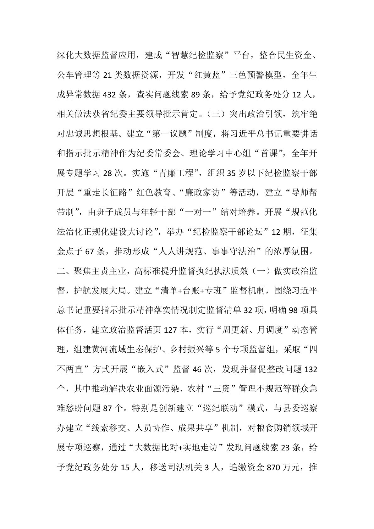 县纪委监委关于开展“纪检监察工作规范化法治化正规化建设年”行动工作总结汇报材料今年以来,县纪委监委深入贯彻落实中央纪委、省市纪委全会精神,以“纪检监察工作规范化法治化正规化建设年”行动为抓手,聚焦主责主业,深化改革创新,健全制度机制,强化队伍建设,推动纪检监察工作高质量发展取得新成效。现将主要工作情况汇报如下:一、坚持系统谋划,高站位部署推进规范化法治化正规化建设(一)强化顶层设计,构建“四梁八柱”制度体系。对标中央纪委《关于加强纪检监察工作规范化法治化正规化建设的意见》,结合县实际制定“1+8”实施方案,明确32项重点任务、86条具体措施。修订《县纪委监委工作规则》,完善议事决策、督查督办、保密安全等12项核心制度,建立“室组地”联动监督、联合办案等6项协作机制。特别是创新建立“三重一大”...