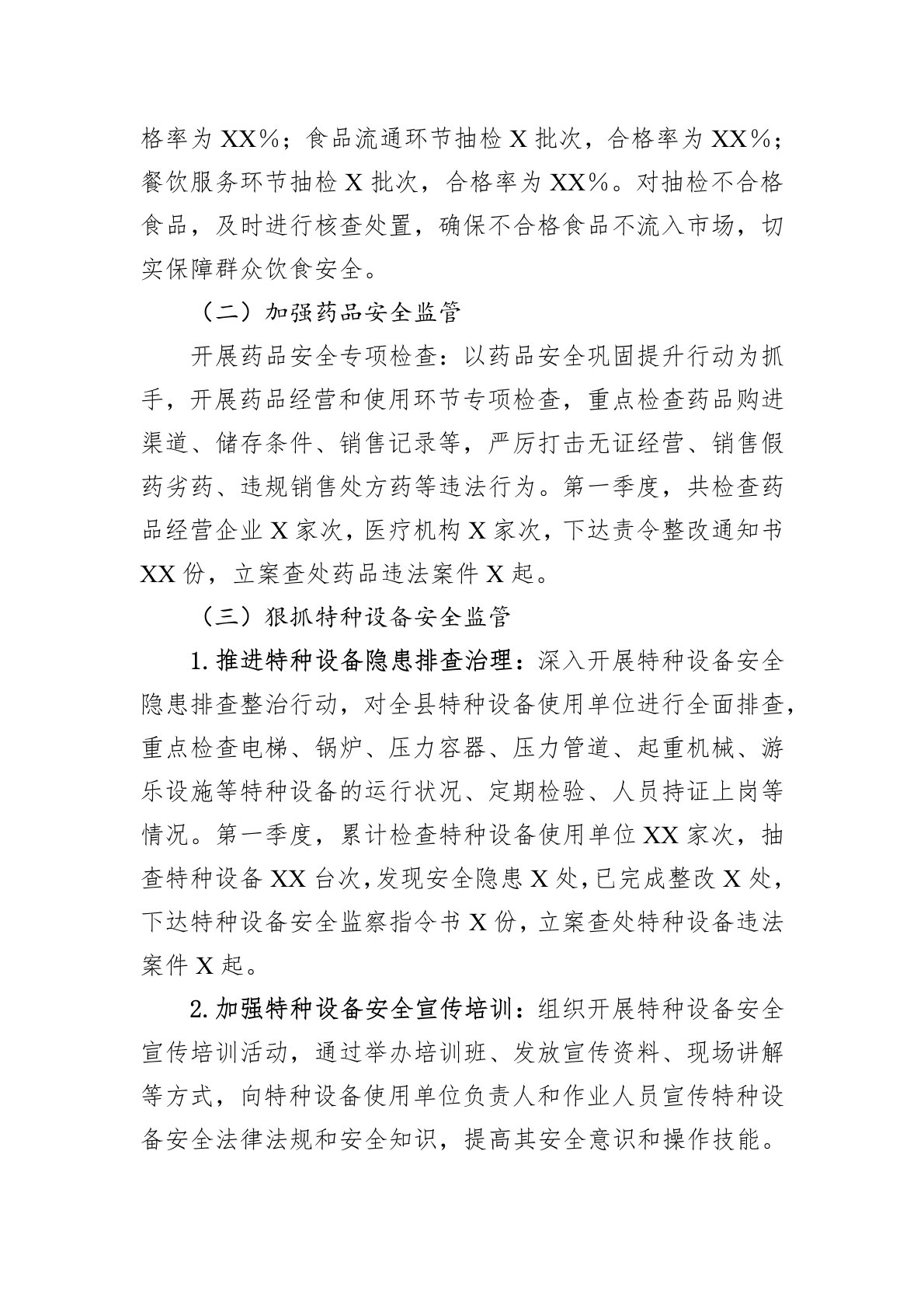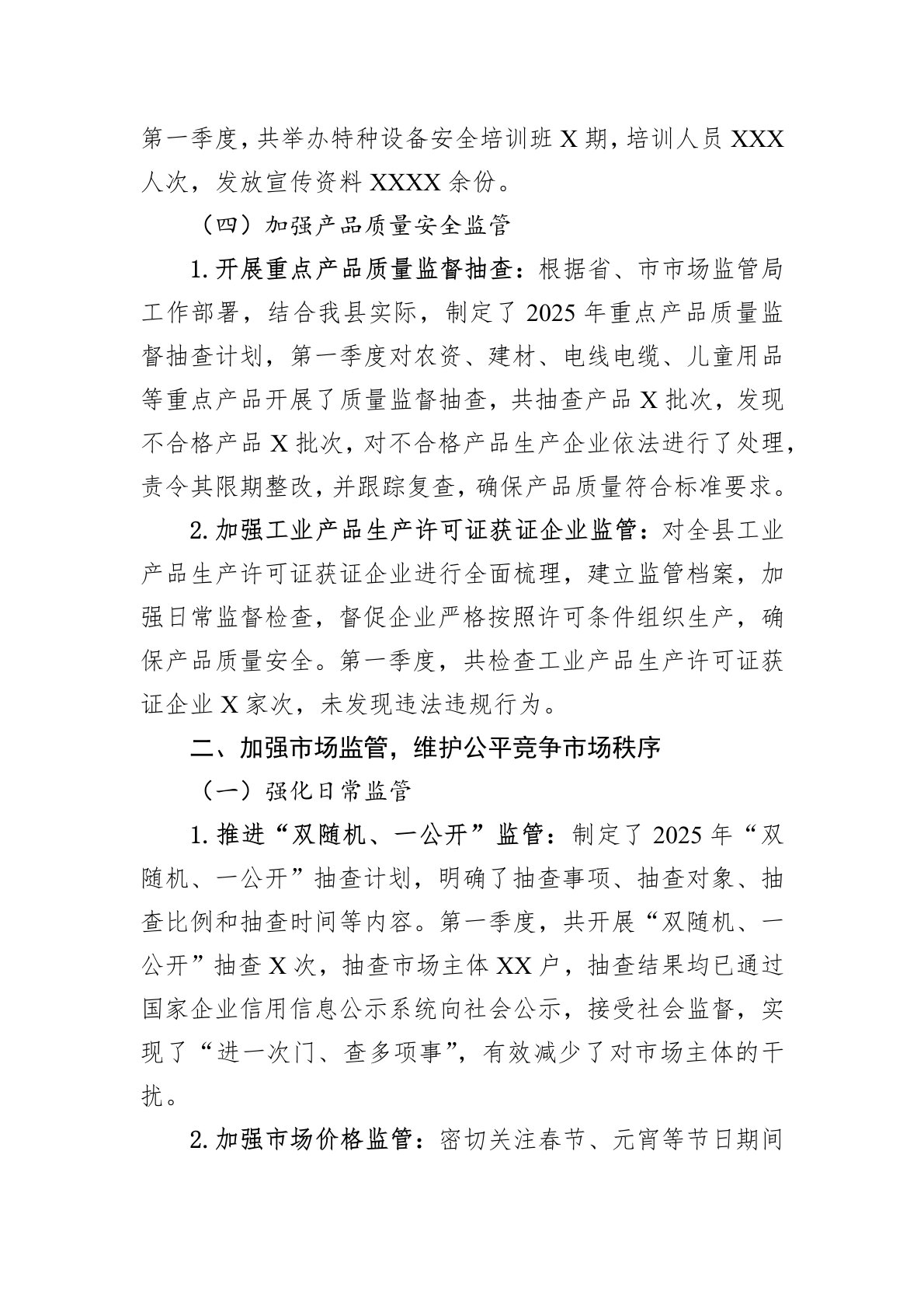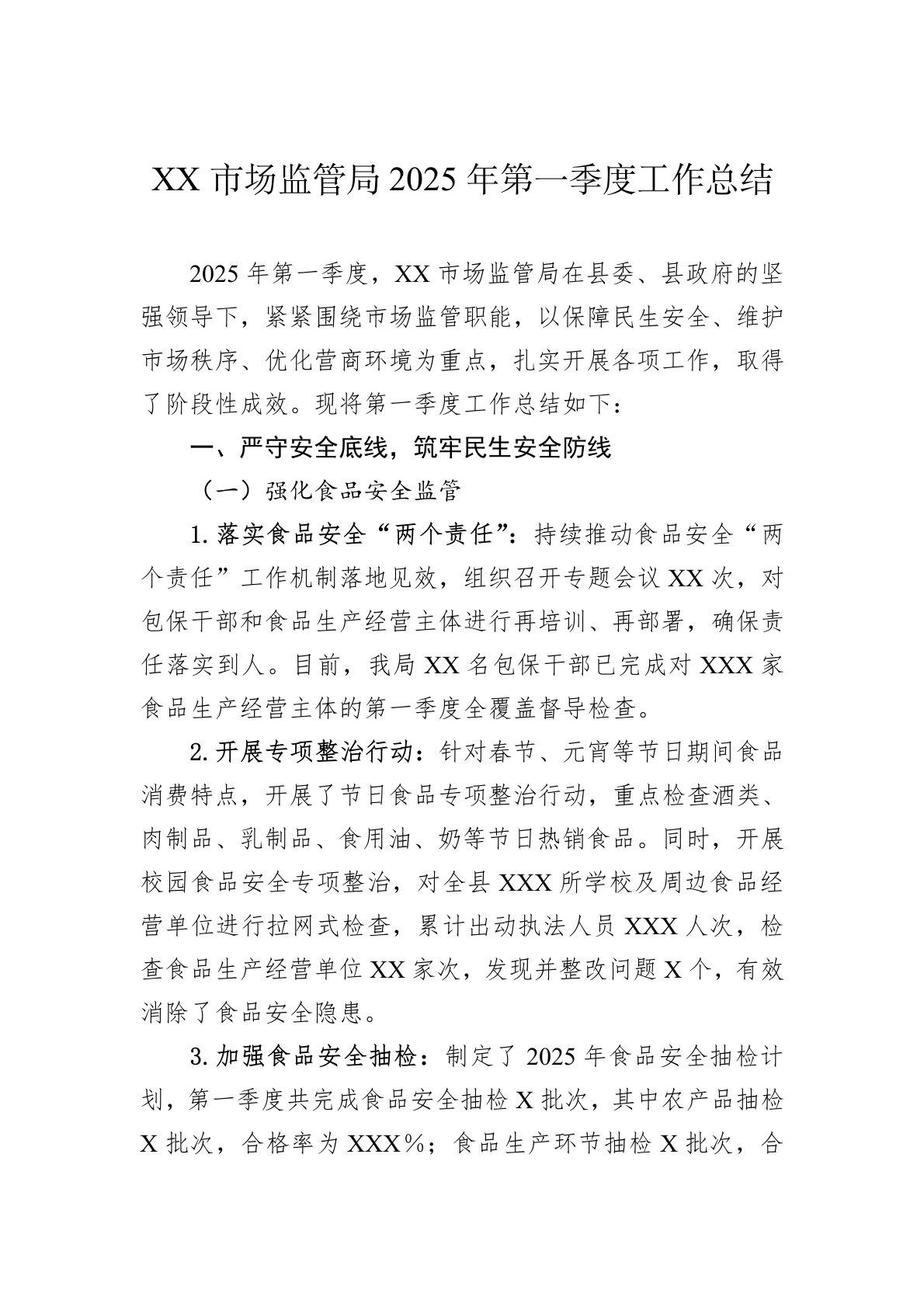 2025年第一季度,XX市场监管局在县委、县政府的坚强领导下,紧紧围绕市场监管职能,以保障民生安全、维护市场秩序、优化营商环境为重点,扎实开展各项工作,取得了阶段性成效。现将第一季度工作总结如下:一、严守安全底线,筑牢民生安全防线(一)强化食品安全监管1.落实食品安全“两个责任”:持续推动食品安全“两个责任”工作机制落地见效,组织召开专题会议XX次,对包保干部和食品生产经营主体进行再培训、再部署,确保责任落实到人。目前,我局XX名包保干部已完成对XXX家食品生产经营主体的第一季度全覆盖督导检查。2.开展专项整治行动:针对春节、元宵等节日期间食品消费特点,开展了节日食品专项整治行动,重点检查酒类、肉制品、乳制品、食用油、奶等节日热销食品。同时,开展校园食品安全专项整治,对全县XXX所学校及周边...