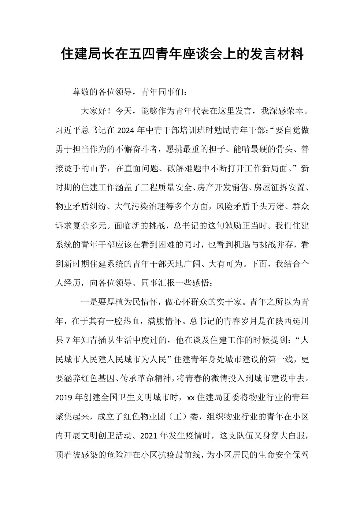 住建局长在五四青年座谈会上的发言材料尊敬的各位领导,青年同事们:大家好!今天,能够作为青年代表在这里发言,我深感荣幸。习近平总书记在2024年中青干部培训班时勉励青年干部:“要自觉做勇于担当作为的不懈奋斗者,愿挑最重的担子、能啃最硬的骨头、善接烫手的山芋,在直面问题、破解难题中不断打开工作新局面。”新时期的住建工作涵盖了工程质量安全、房产开发销售、房屋征拆安置、物业矛盾纠纷、大气污染治理等多个方面,风险矛盾千头万绪、群众诉求复杂多元。面临新的挑战,总书记的这句勉励正当时。我们住建系统的青年干部应该在看到困难的同时,也看到机遇与挑战并存,看到新时期住建系统的青年干部天地广阔、大有可为。下面,我结合个人经历,向各位领导、同事汇报一些感悟:一是要厚植为民情怀,做心怀群众的实干家。青年之所以为青年,...