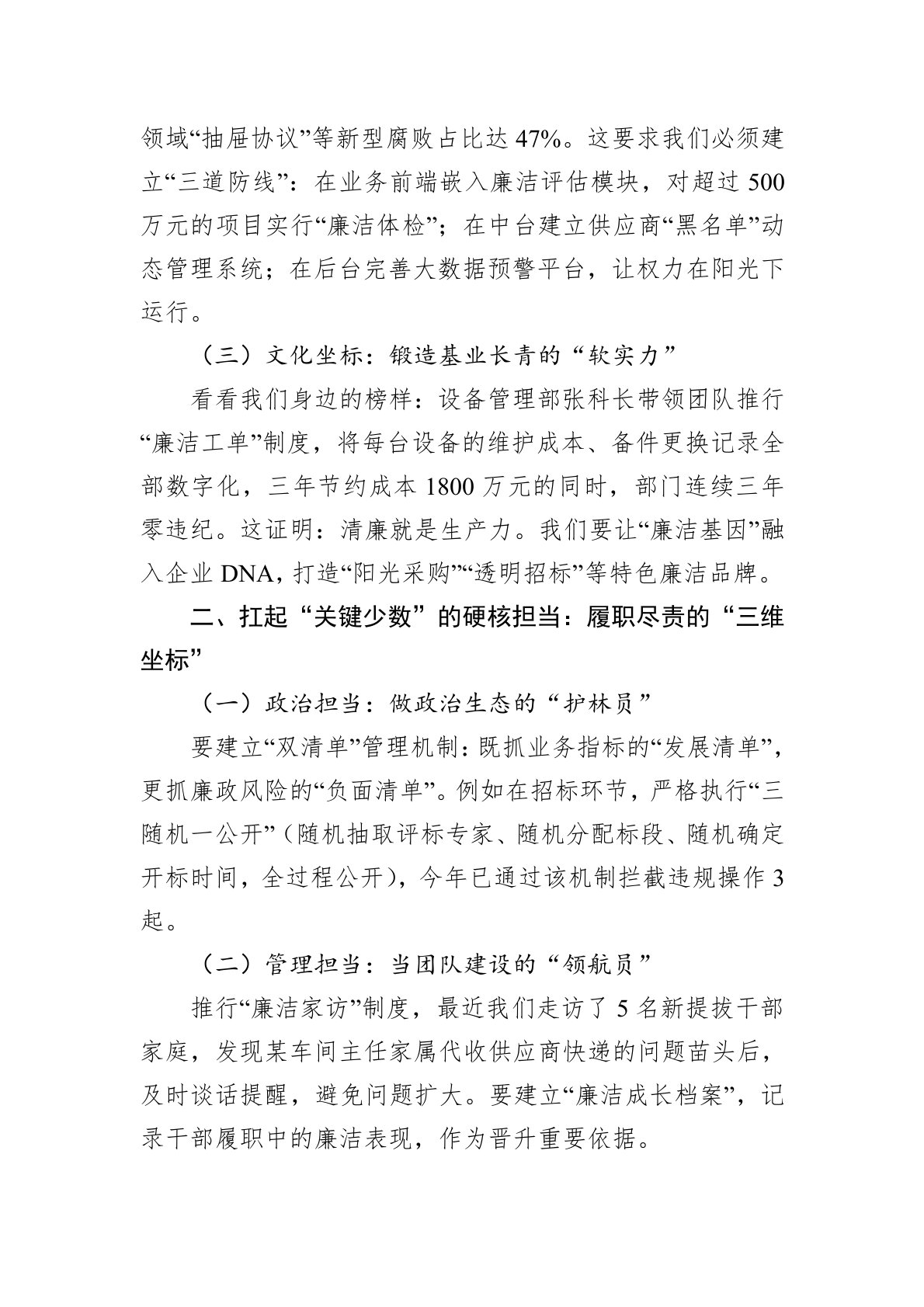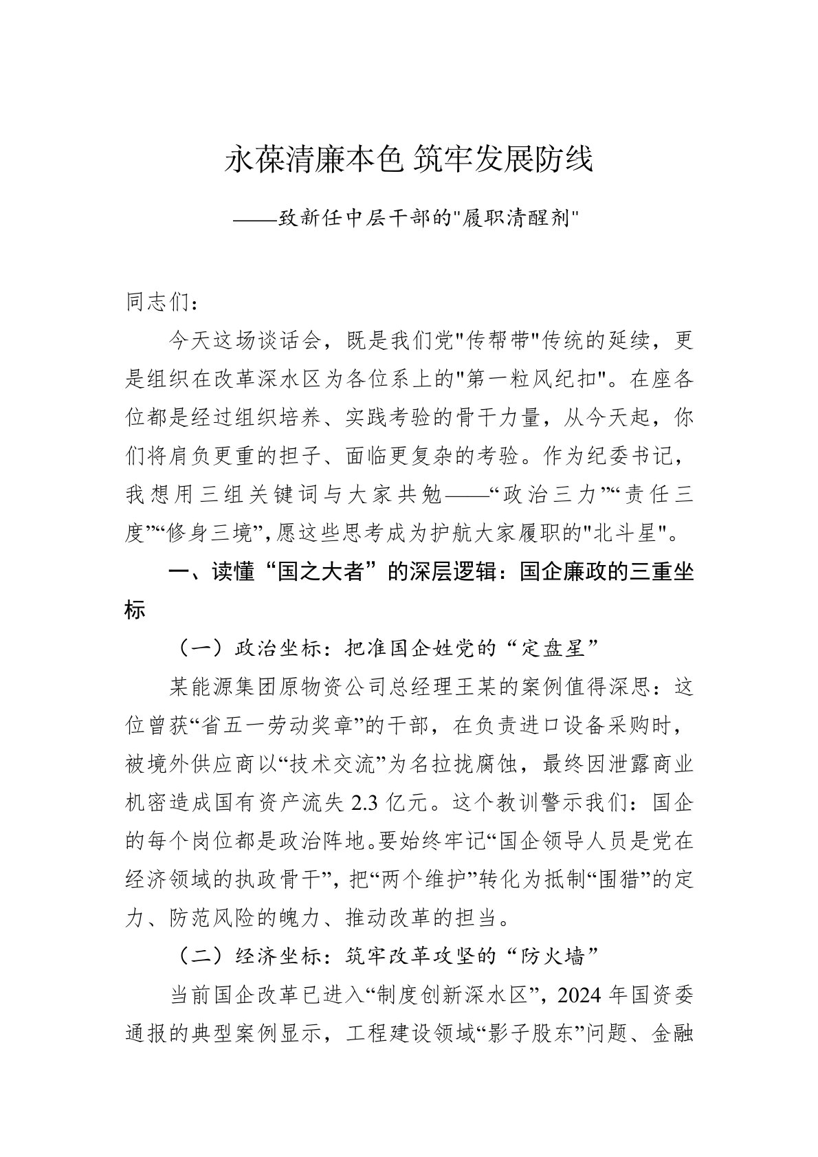 ——致新任中层干部的"履职清醒剂" 同志们: 今天这场谈话会,既是我们党"传帮带"传统的延续,更是组织在改革深水区为各位系上的"第一粒风纪扣"。在座各位都是经过组织培养、实践考验的骨干力量,从今天起,你们将肩负更重的担子、面临更复杂的考验。作为纪委书记,我想用三组关键词与大家共勉——“政治三力”“责任三度”“修身三境”,愿这些思考成为护航大家履职的"北斗星"。 一、读懂“国之大者”的深层逻辑:国企廉政的三重坐标 (一)政治坐标:把准国企姓党的“定盘星”某能源集团原物资公司总经理王某的案例值得深思:这位曾获“省五一劳动奖章”的干部,在负责进口设备采购时,被境外供应商以“技术交流”为名拉拢腐蚀,最终因泄露商业机密造成国有资产流失2.3亿元。这个教训警示我们:国企的每个岗位都是政治阵地。要始终...
