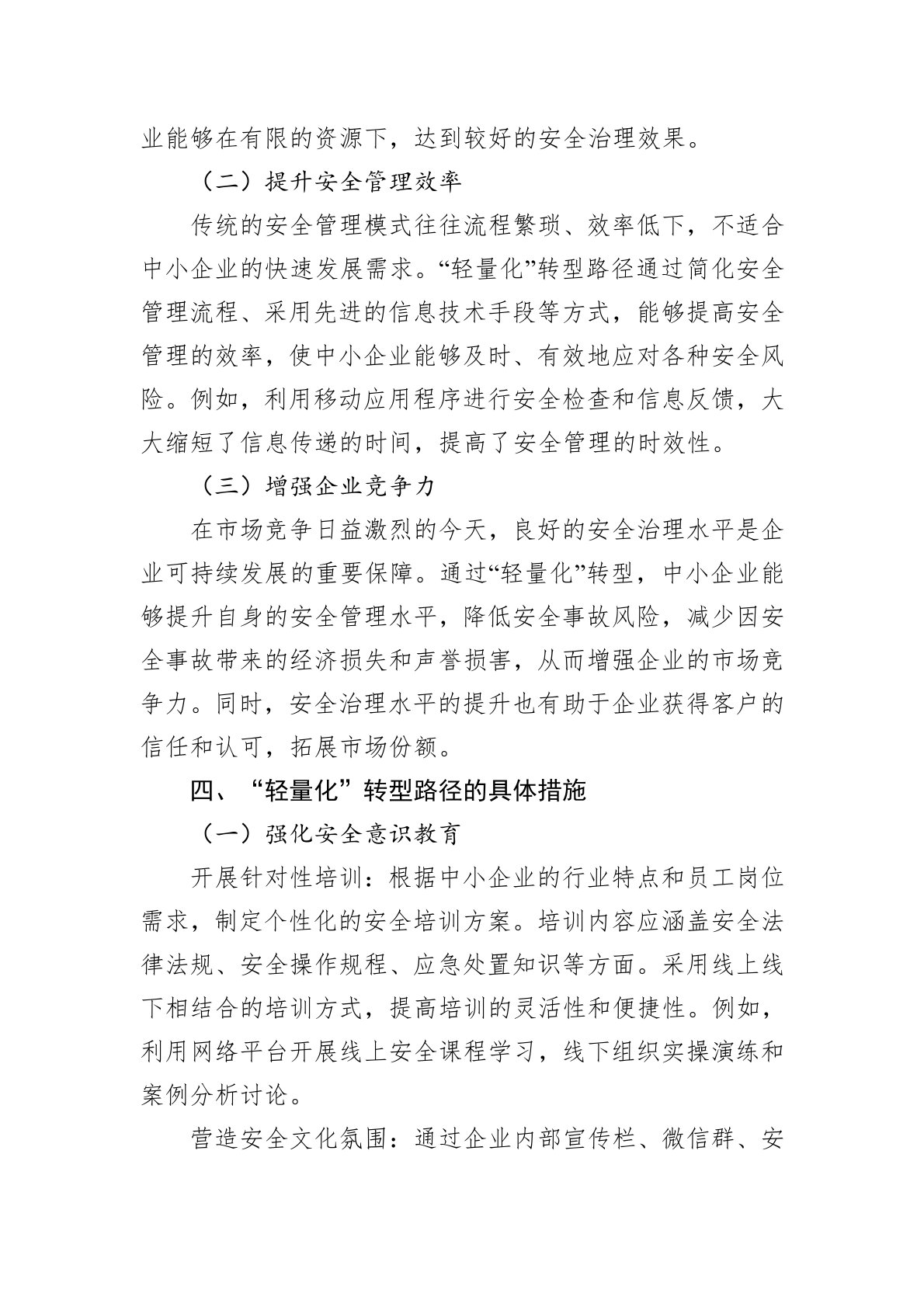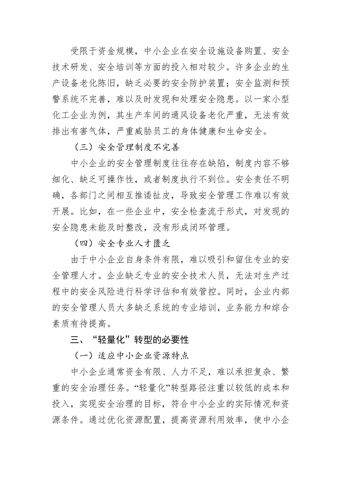一、引言在国家大力推进治本攻坚三年行动的时代背景下,安全生产已成为各行业发展的核心要务之一。中小企业作为国民经济的重要组成部分,其数量众多、分布广泛,在促进经济增长、增加就业等方面发挥着不可替代的作用。然而,由于中小企业自身规模较小、资源有限、管理水平参差不齐等因素,在安全治理方面面临着诸多挑战。探索适合中小企业的安全治理“轻量化”转型路径,不仅有助于提升中小企业的安全管理水平,降低安全事故风险,还能为整个社会的安全生产形势稳定向好提供有力支撑。二、中小企业安全治理的现状剖析(一)安全意识淡薄众多中小企业管理者将主要精力集中在业务拓展和利润获取上,对安全生产的重要性认识不足。在日常生产经营过程中,往往忽视安全规章制度的落实,对员工的安全培训和教育不够重视,导致员工安全意识淡薄,缺乏必要的安全...