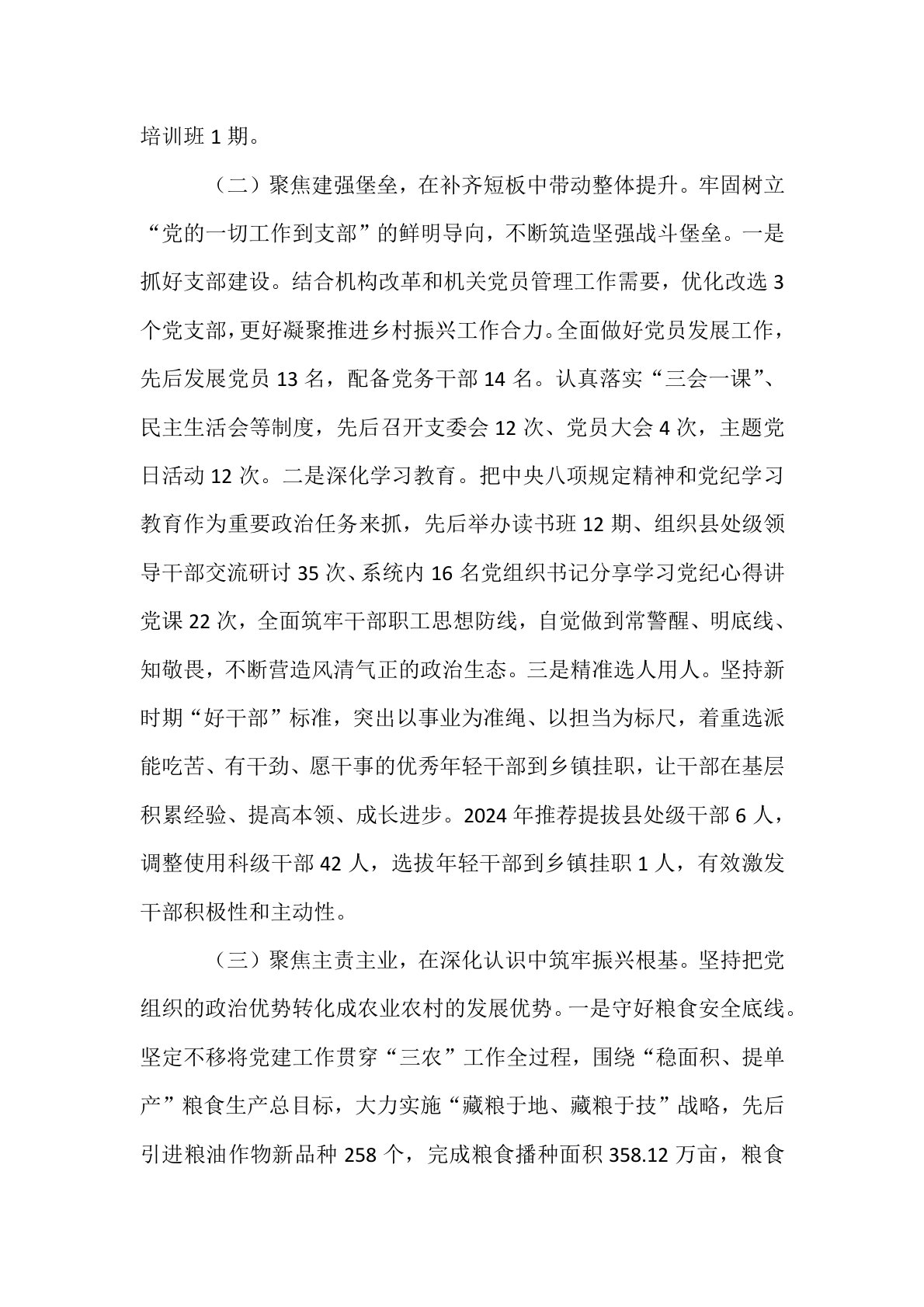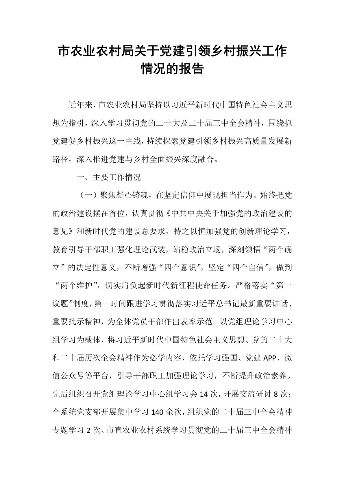 市农业农村局关于党建引领乡村振兴工作情况的报告近年来,市农业农村局坚持以习近平新时代中国特色社会主义思想为指引,深入学习贯彻党的二十大及二十届三中全会精神,围绕抓党建促乡村振兴这一主线,持续探索党建引领乡村振兴高质量发展新路径,深入推进党建与乡村全面振兴深度融合。一、主要工作情况(一)聚焦凝心铸魂,在坚定信仰中展现担当作为。始终把党的政治建设摆在首位,认真贯彻《中共中央关于加强党的政治建设的意见》和新时代党的建设总要求,持之以恒加强党的创新理论学习,教育引导干部职工强化理论武装,站稳政治立场,深刻领悟“两个确立”的决定性意义,不断增强“四个意识”,坚定“四个自信”,做到“两个维护”,切实肩负起新时代新征程使命任务。严格落实“第一议题”制度,第一时间跟进学习贯彻落实习近平总书记最新重要讲话、重...