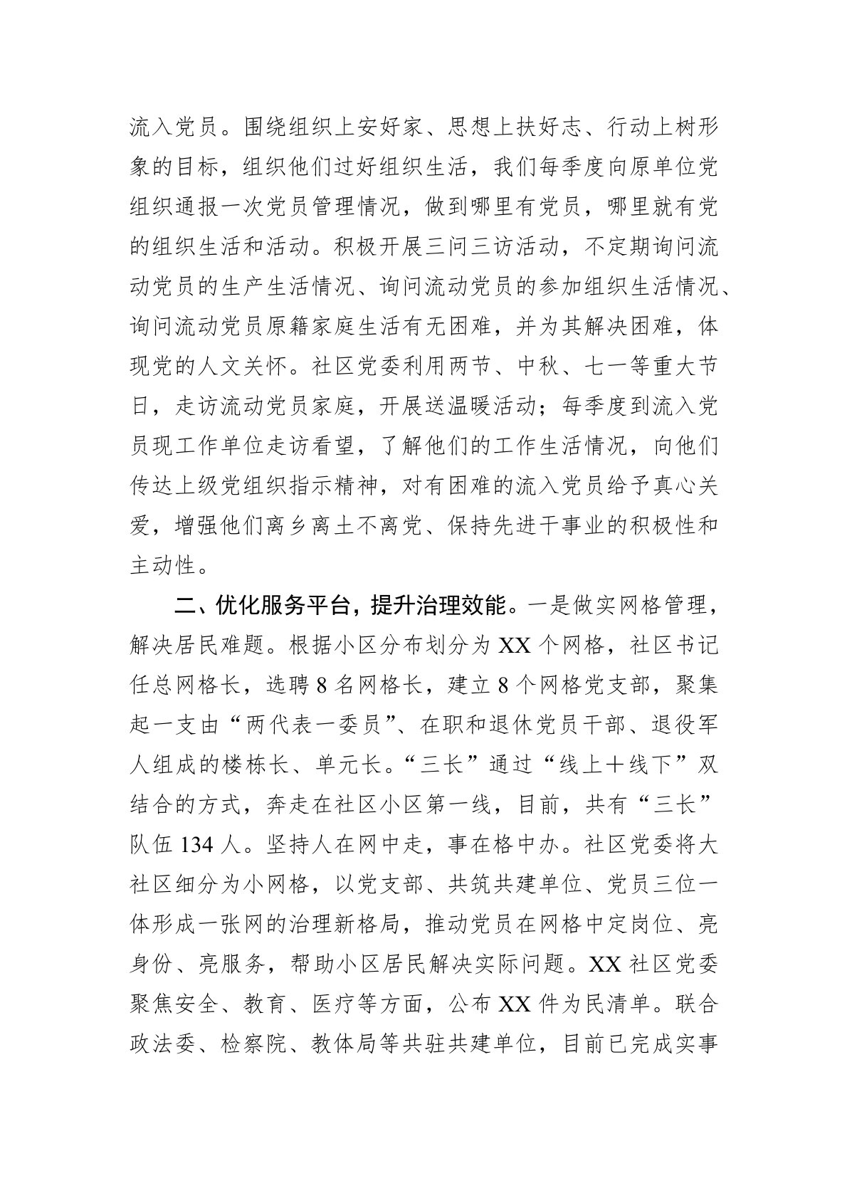 近年来,XX社区以党建引领为主轴,打造以参与链治理链服务链为主线的心庄万家党建品牌,将基层治理的最后一公里变为服务群众零距离。一、抓牢组织建设,夯实基层基础。一是建好活动场所,筑牢组织阵地。社区党委在东景花园小区成立了全县第一个物业党支部,构建起社区党委-小区党支部-楼栋党小组-党员中心户的四级红色联动体系。打造东景红色小区,将红色物业引进小区,通过居民代表会议、民主恳谈会、入户走访群众等形式开展协商工作,小到一棵树、一个下水管、一个窖井盖,让每个居民都参与其中。二是加强教育培训,建强党员队伍。认真贯彻落实《中国共产党党员教育管理工作条例》,结合开展深入贯彻中央八项规定精神学习教育,强化社区党员日常教育、管理、监督。规范党费收缴、使用和管理。坚持教育、管理、监督、服务相结合,突出党性教育和政...
