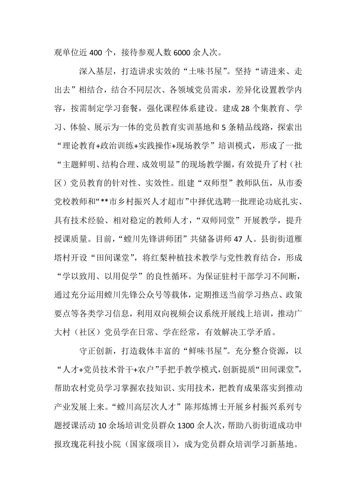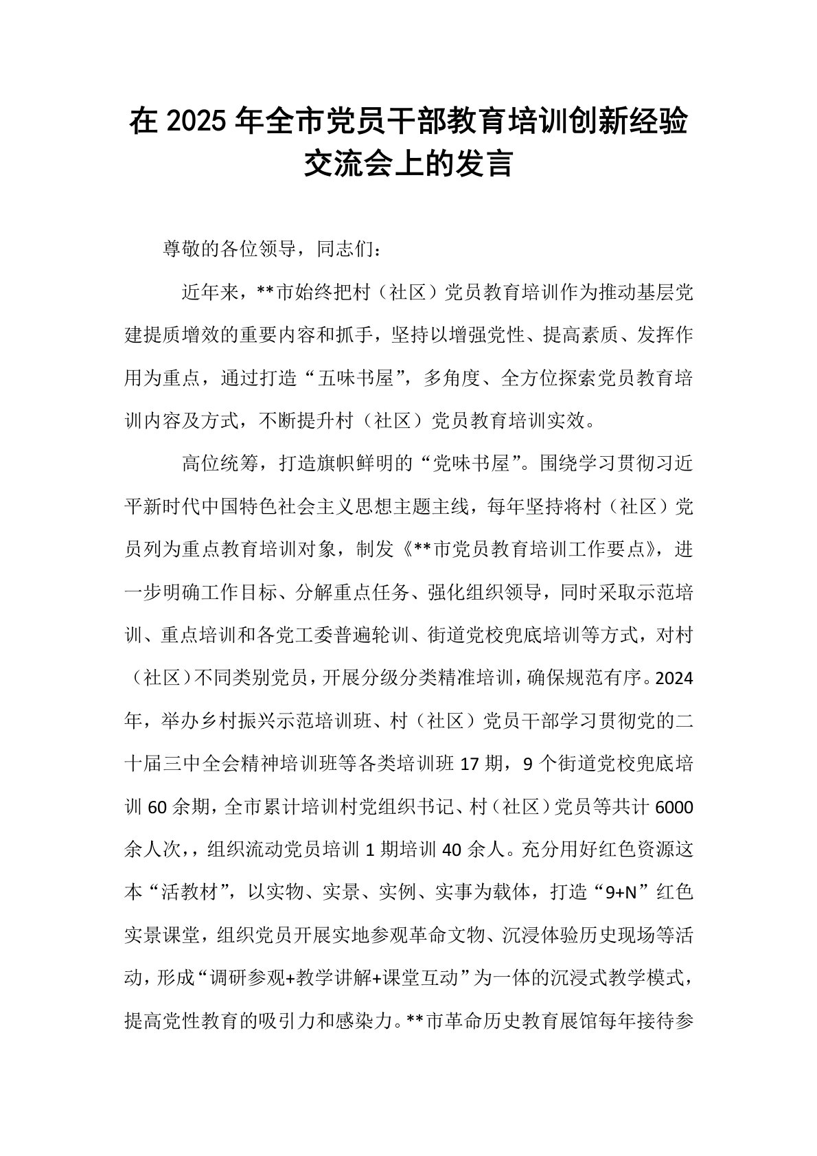 在2025年全市党员干部教育培训创新经验交流会上的发言尊敬的各位领导,同志们:近年来,**市始终把村(社区)党员教育培训作为推动基层党建提质增效的重要内容和抓手,坚持以增强党性、提高素质、发挥作用为重点,通过打造“五味书屋”,多角度、全方位探索党员教育培训内容及方式,不断提升村(社区)党员教育培训实效。高位统筹,打造旗帜鲜明的“党味书屋”。围绕学习贯彻习近平新时代中国特色社会主义思想主题主线,每年坚持将村(社区)党员列为重点教育培训对象,制发《**市党员教育培训工作要点》,进一步明确工作目标、分解重点任务、强化组织领导,同时采取示范培训、重点培训和各党工委普遍轮训、街道党校兜底培训等方式,对村(社区)不同类别党员,开展分级分类精准培训,确保规范有序。2024年,举办乡村振兴示范培训班、村(社...