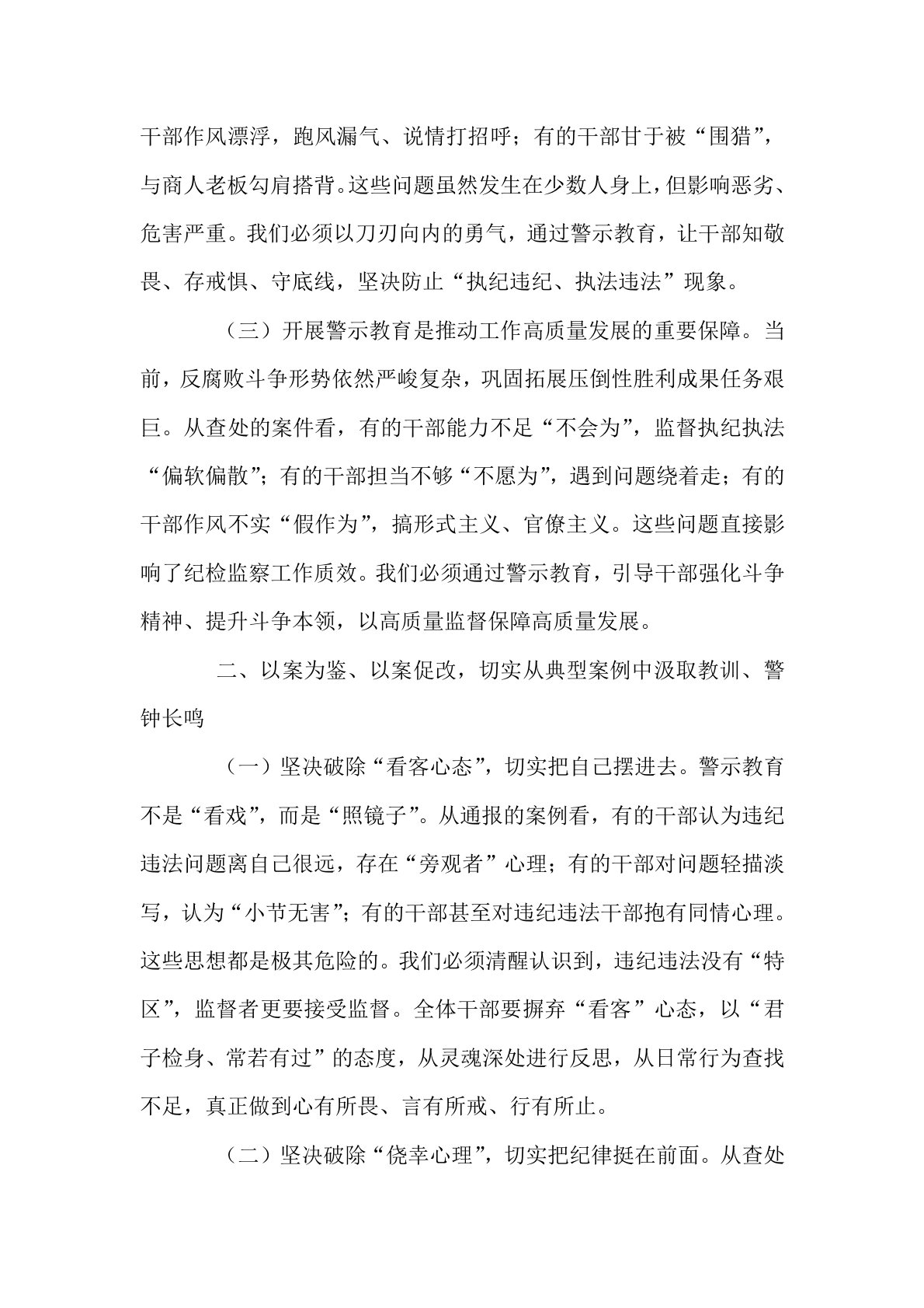 县纪委书记在全县纪检监察干部教育整顿警示教育大会上的讲话同志们:今天,我们召开全县纪检监察干部教育整顿警示教育大会,主要任务是深入贯彻落实习近平总书记关于纪检监察队伍建设的重要指示精神,以案为鉴、以案促改,推动教育整顿走深走实,着力打造忠诚干净担当、敢于善于斗争的纪检监察铁军。下面,我讲三个方面意见。一、深刻认识开展教育整顿警示教育的极端重要性,切实增强思想自觉、政治自觉、行动自觉(一)开展警示教育是践行“两个维护”的必然要求。纪检监察机关是政治机关,必须旗帜鲜明讲政治。从查处的典型案例看,有的干部理想信念动摇,对党不忠诚不老实,搞“两面派”、做“两面人”;有的干部政治立场模糊,在大是大非面前态度暧昧,甚至随波逐流、同流合污。这些问题严重背离了纪检监察干部的政治属性,损害了党的形象。我们必须...
