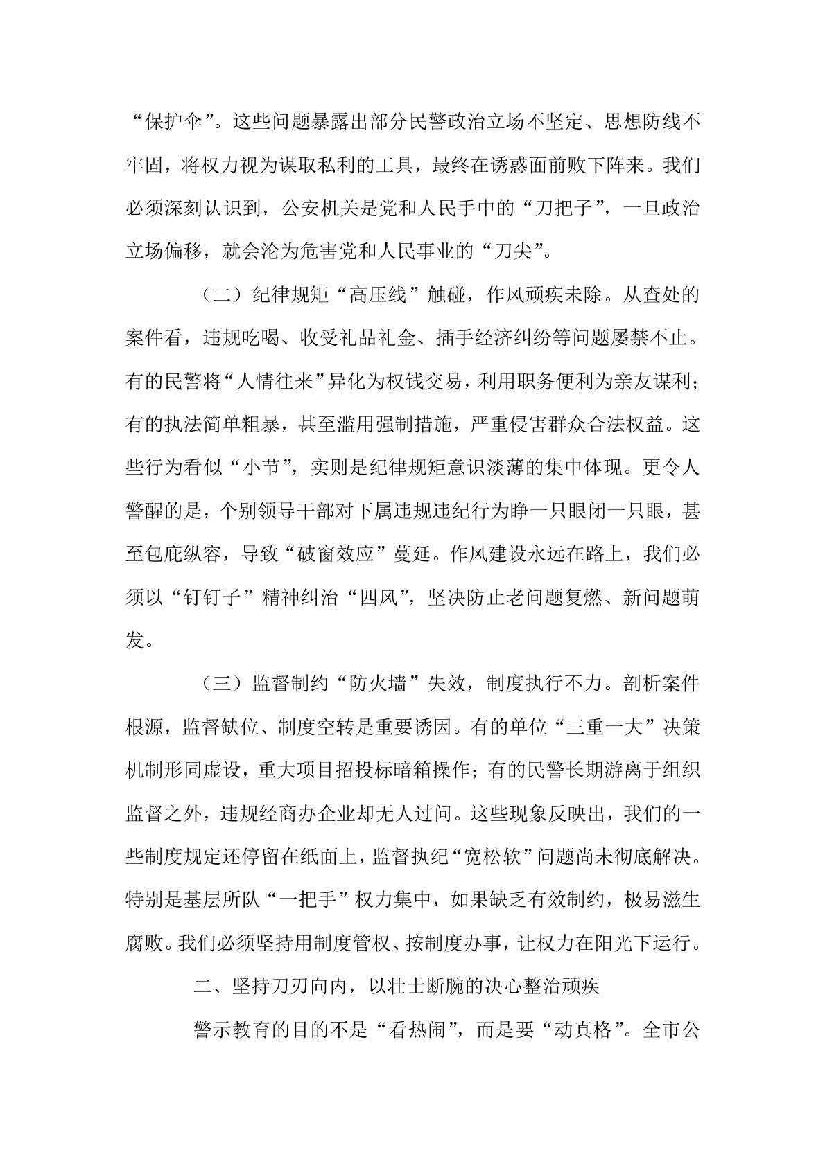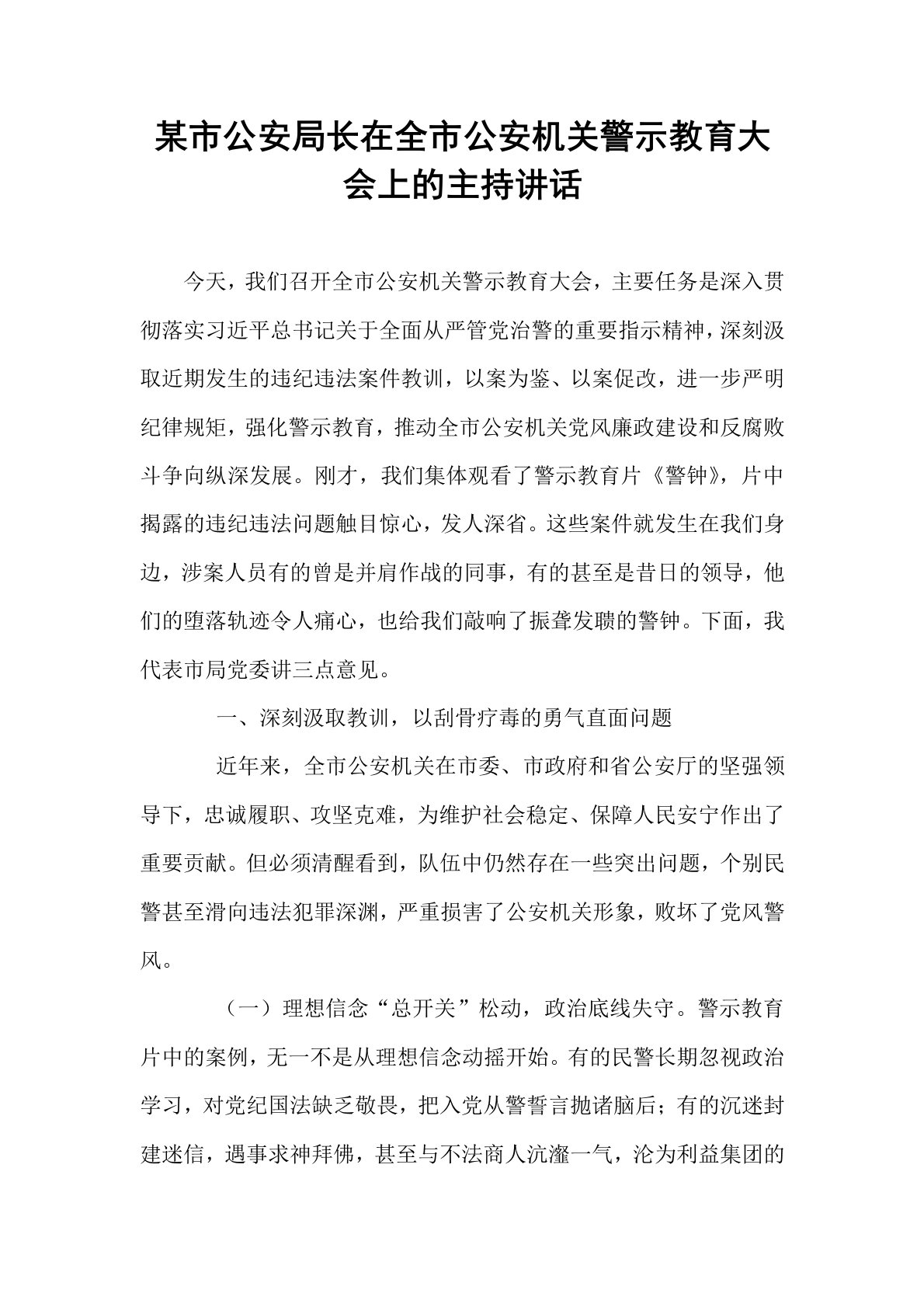 某市公安局长在全市公安机关警示教育大会上的主持讲话今天,我们召开全市公安机关警示教育大会,主要任务是深入贯彻落实习近平总书记关于全面从严管党治警的重要指示精神,深刻汲取近期发生的违纪违法案件教训,以案为鉴、以案促改,进一步严明纪律规矩,强化警示教育,推动全市公安机关党风廉政建设和反腐败斗争向纵深发展。刚才,我们集体观看了警示教育片《警钟》,片中揭露的违纪违法问题触目惊心,发人深省。这些案件就发生在我们身边,涉案人员有的曾是并肩作战的同事,有的甚至是昔日的领导,他们的堕落轨迹令人痛心,也给我们敲响了振聋发聩的警钟。下面,我代表市局党委讲三点意见。一、深刻汲取教训,以刮骨疗毒的勇气直面问题近年来,全市公安机关在市委、市政府和省公安厅的坚强领导下,忠诚履职、攻坚克难,为维护社会稳定、保障人民安宁作...