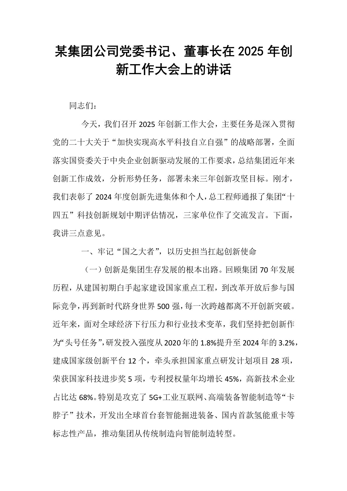 某集团公司党委书记、董事长在2025年创新工作大会上的讲话