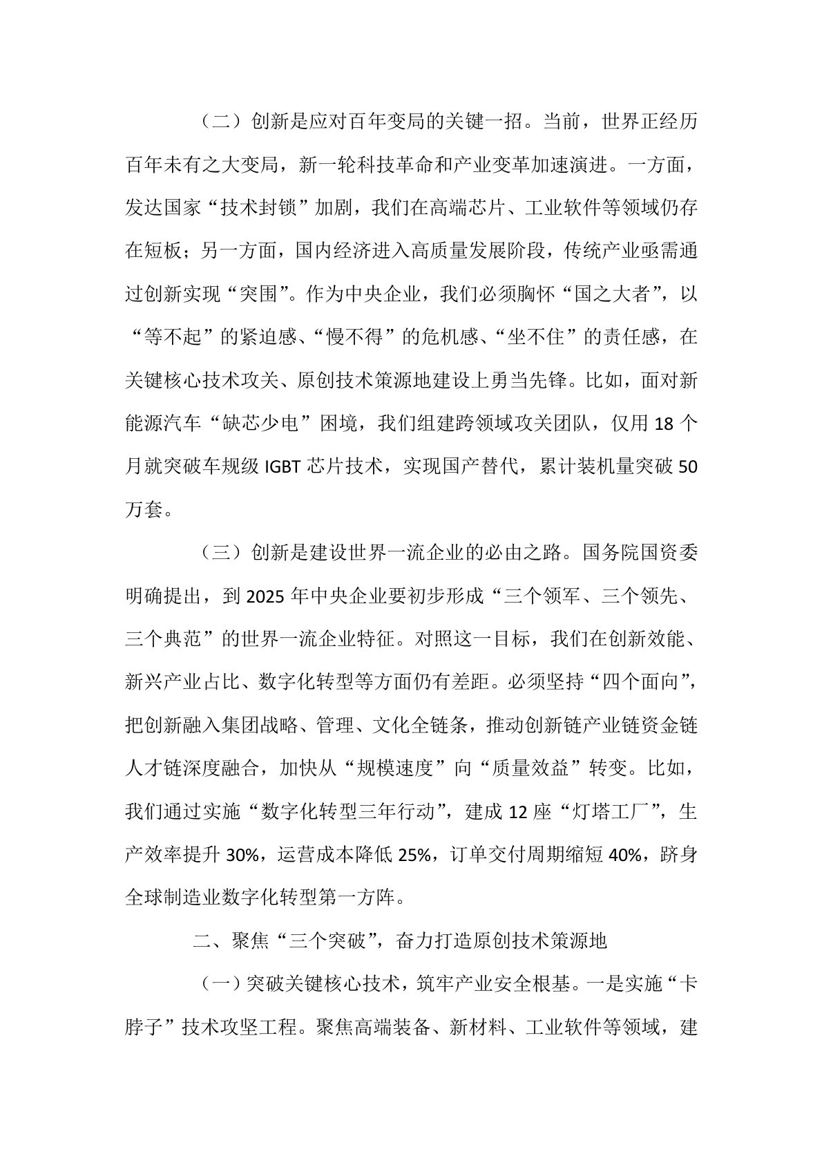 某集团公司党委书记、董事长在2025年创新工作大会上的讲话同志们:今天,我们召开2025年创新工作大会,主要任务是深入贯彻党的二十大关于“加快实现高水平科技自立自强”的战略部署,全面落实国资委关于中央企业创新驱动发展的工作要求,总结集团近年来创新工作成效,分析形势任务,部署未来三年创新攻坚目标。刚才,我们表彰了2024年度创新先进集体和个人,总工程师通报了集团“十四五”科技创新规划中期评估情况,三家单位作了交流发言。下面,我讲三点意见。一、牢记“国之大者”,以历史担当扛起创新使命(一)创新是集团生存发展的根本出路。回顾集团70年发展历程,从建国初期白手起家建设国家重点工程,到改革开放后参与国际竞争,再到新时代跻身世界500强,每一次跨越都离不开创新突破。近年来,面对全球经济下行压力和行业技术...