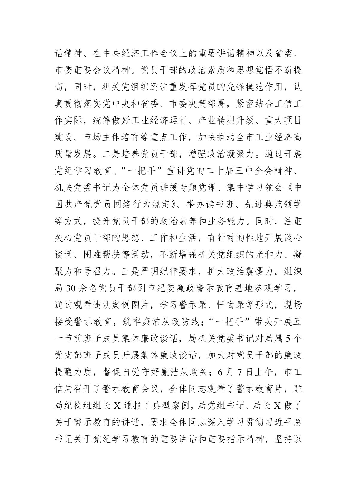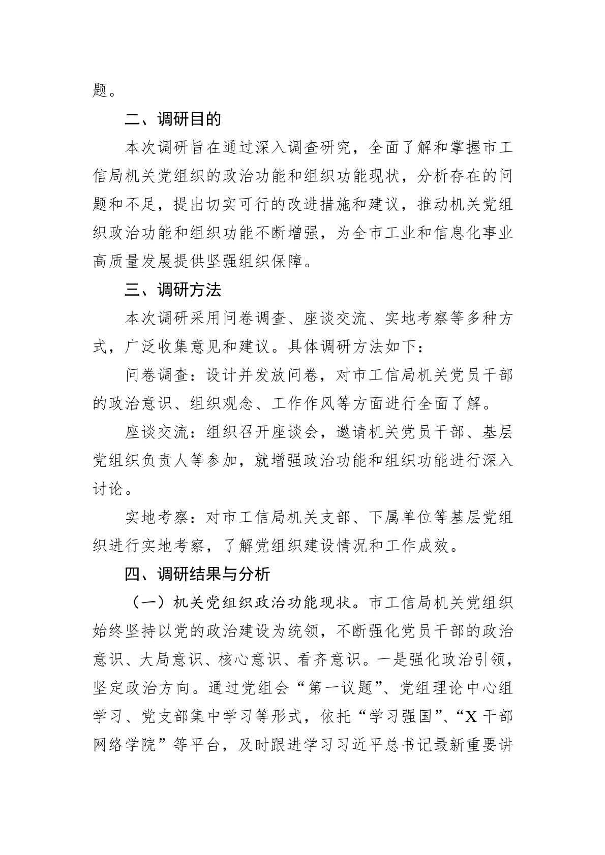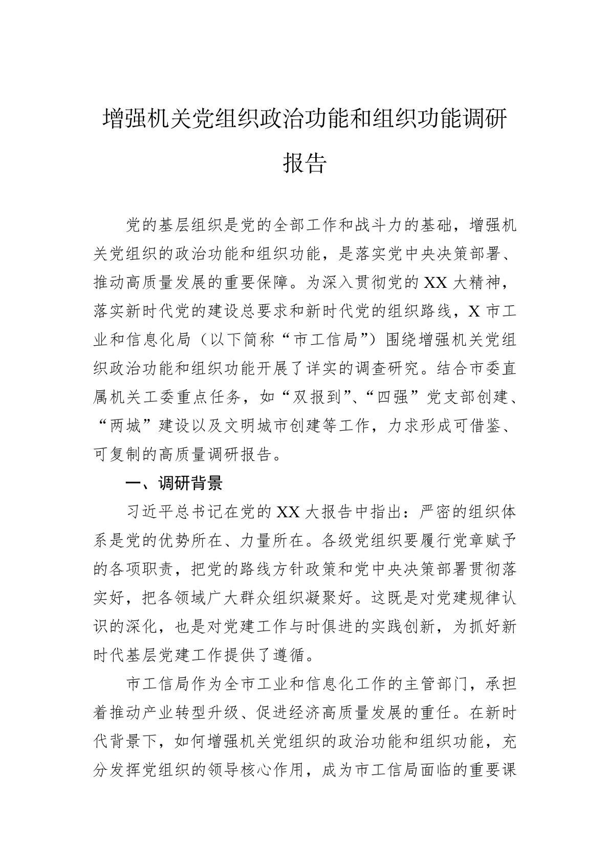党的基层组织是党的全部工作和战斗力的基础,增强机关党组织的政治功能和组织功能,是落实党中央决策部署、推动高质量发展的重要保障。为深入贯彻党的XX大精神,落实新时代党的建设总要求和新时代党的组织路线,X市工业和信息化局(以下简称“市工信局”)围绕增强机关党组织政治功能和组织功能开展了详实的调查研究。结合市委直属机关工委重点任务,如“双报到”、“四强”党支部创建、“两城”建设以及文明城市创建等工作,力求形成可借鉴、可复制的高质量调研报告。一、调研背景习近平总书记在党的XX大报告中指出:严密的组织体系是党的优势所在、力量所在。各级党组织要履行党章赋予的各项职责,把党的路线方针政策和党中央决策部署贯彻落实好,把各领域广大群众组织凝聚好。这既是对党建规律认识的深化,也是对党建工作与时俱进的实践创新,为...