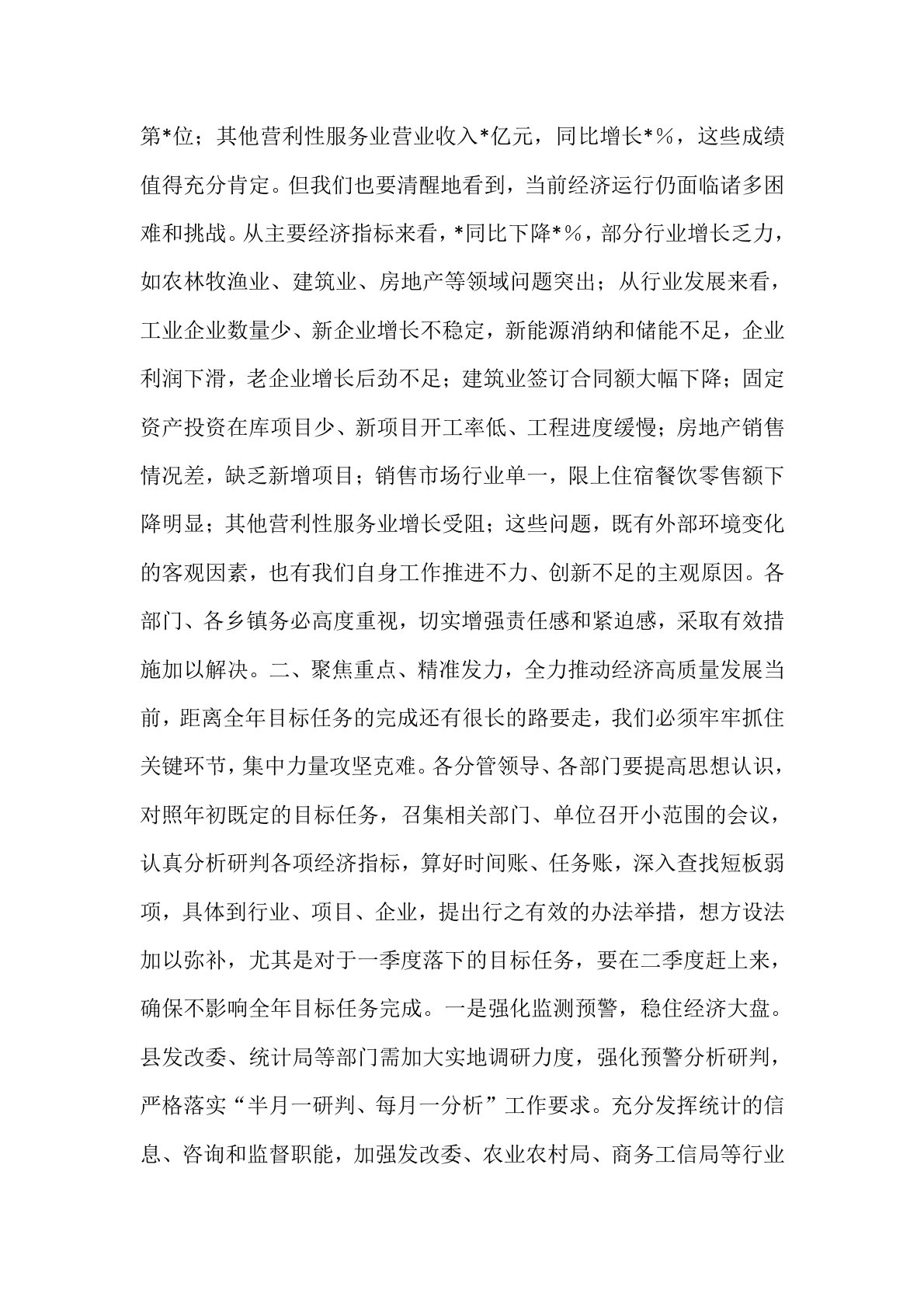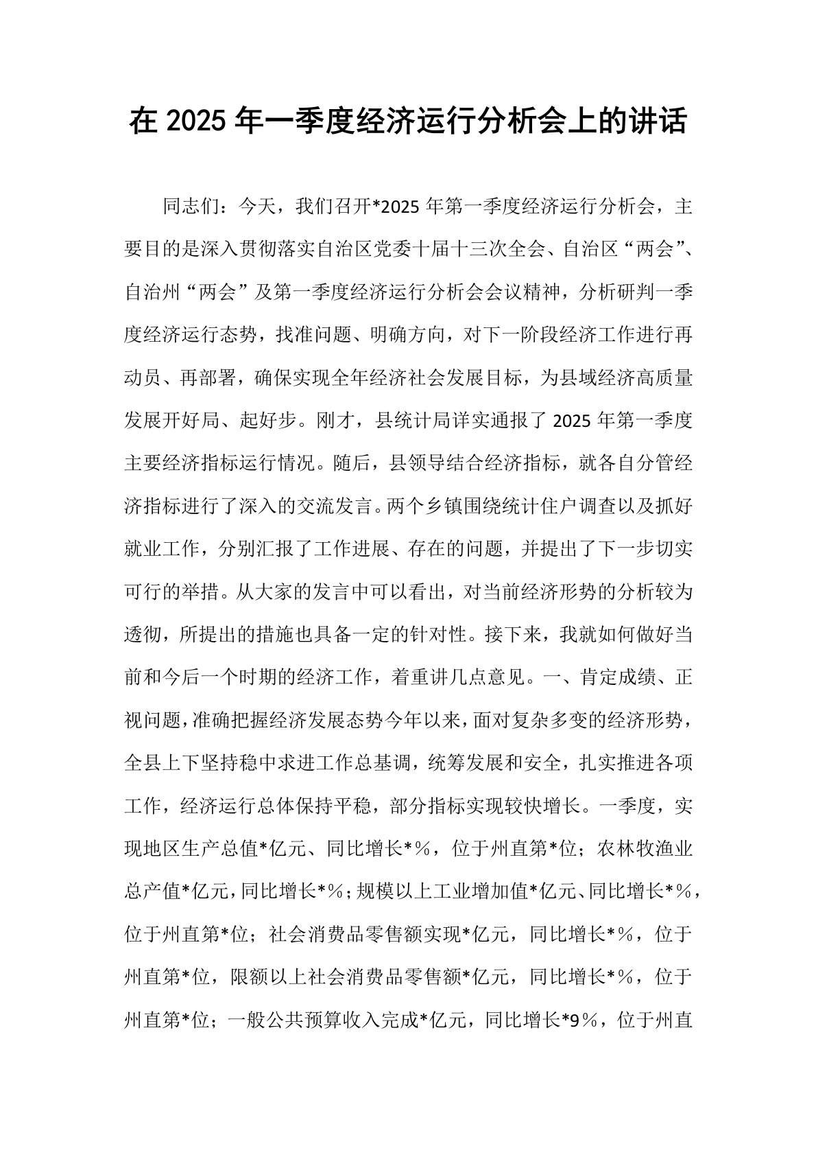 在2025年一季度经济运行分析会上的讲话同志们:今天,我们召开*2025年第一季度经济运行分析会,主要目的是深入贯彻落实自治区党委十届十三次全会、自治区“两会”、自治州“两会”及第一季度经济运行分析会会议精神,分析研判一季度经济运行态势,找准问题、明确方向,对下一阶段经济工作进行再动员、再部署,确保实现全年经济社会发展目标,为县域经济高质量发展开好局、起好步。刚才,县统计局详实通报了2025年第一季度主要经济指标运行情况。随后,县领导结合经济指标,就各自分管经济指标进行了深入的交流发言。两个乡镇围绕统计住户调查以及抓好就业工作,分别汇报了工作进展、存在的问题,并提出了下一步切实可行的举措。从大家的发言中可以看出,对当前经济形势的分析较为透彻,所提出的措施也具备一定的针对性。接下来,我就如何做...